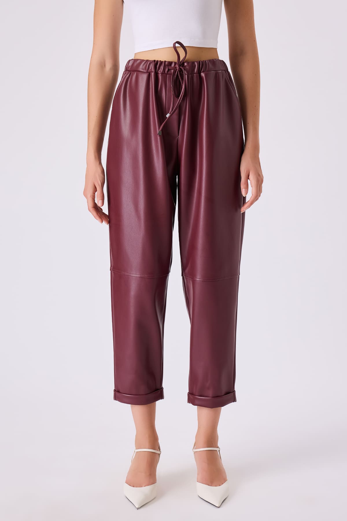 ÜRÜN BİLGİSİ:Deri kumaş,beli lastikli,cepli,ayarlanabilir bağcıklı,dizi üstten dikişli,paçası katlama detaylı,rahat form deri pantolon.