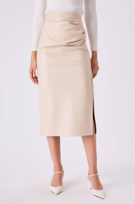 ÜRÜN BİLGİSİ:Deri kumaş,normal bel,fermuarlı,yırtmaç detaylı,astarsız,midi boy şık etek.