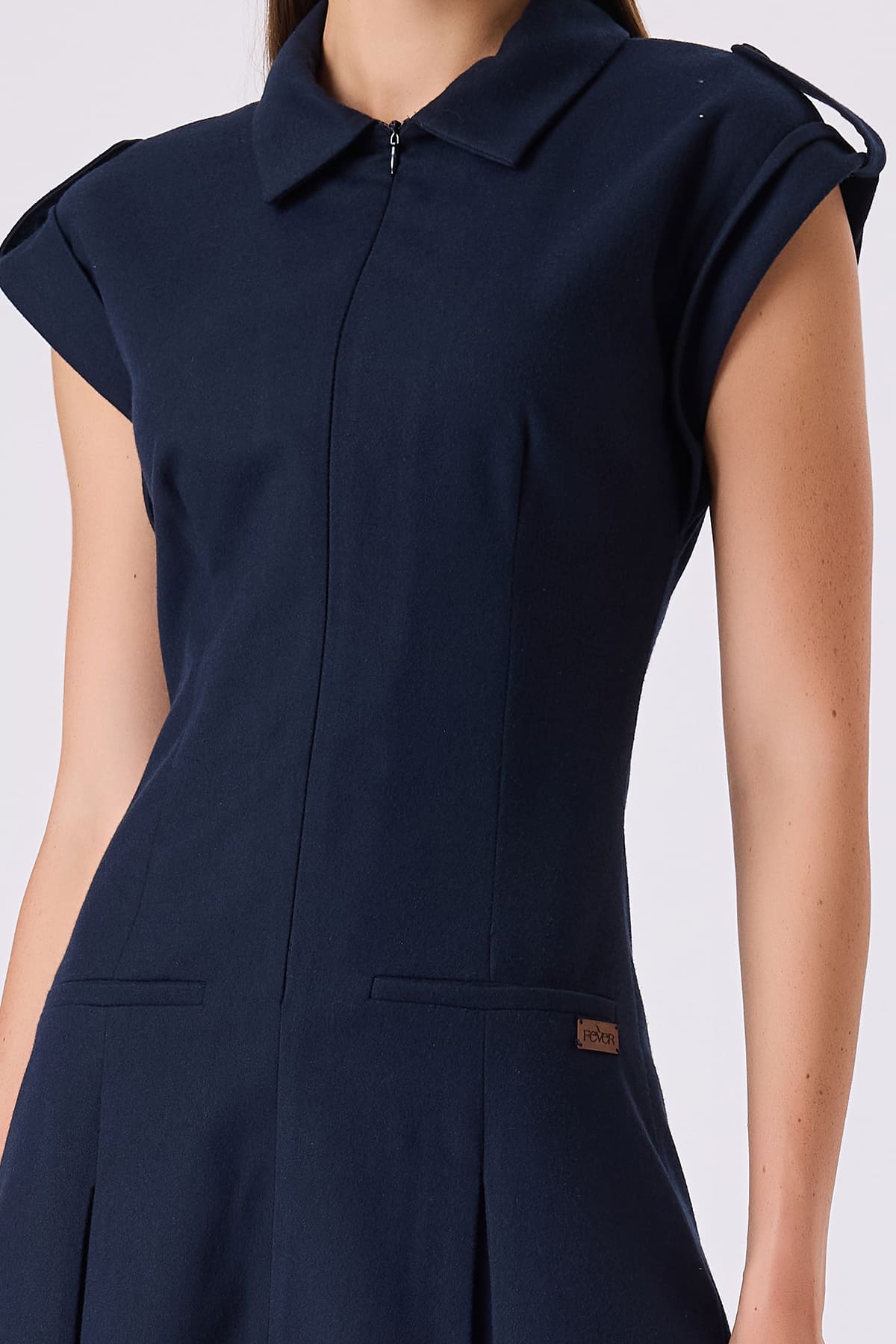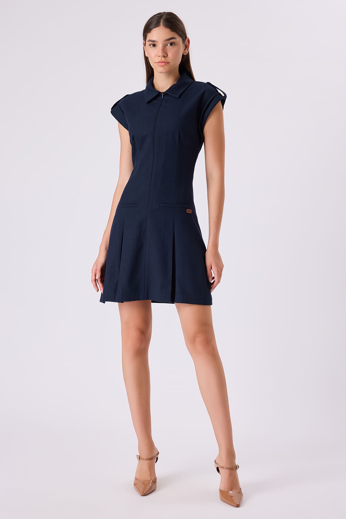 ÜRÜN BİLGİSİ:Viskon kumaş,yakalı,düşük kollu düğmeli,önü fermuarlı,pile detaylı,astarsızdüz form elbise.