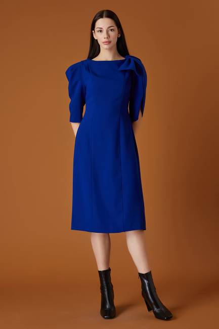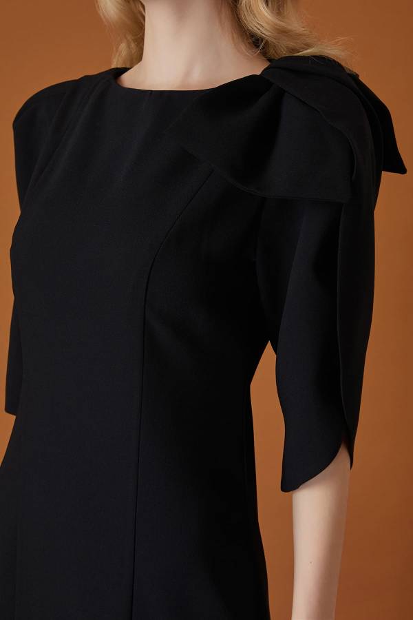 ÜRÜN BİLGİSİ:Dökümlü krep kumaş,yuvarlak yakalı,fermuarlı,tek omuzu fiyonk detaylı,astarlı,fit form şık elbise.