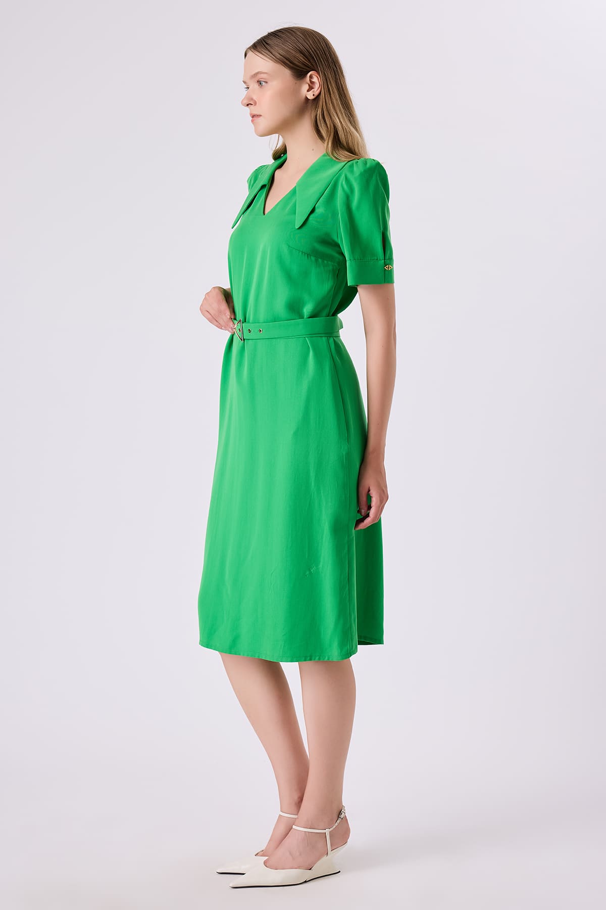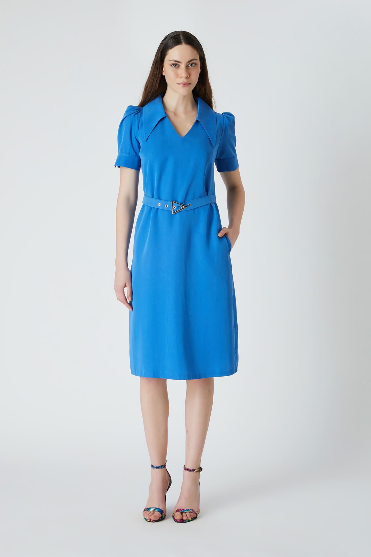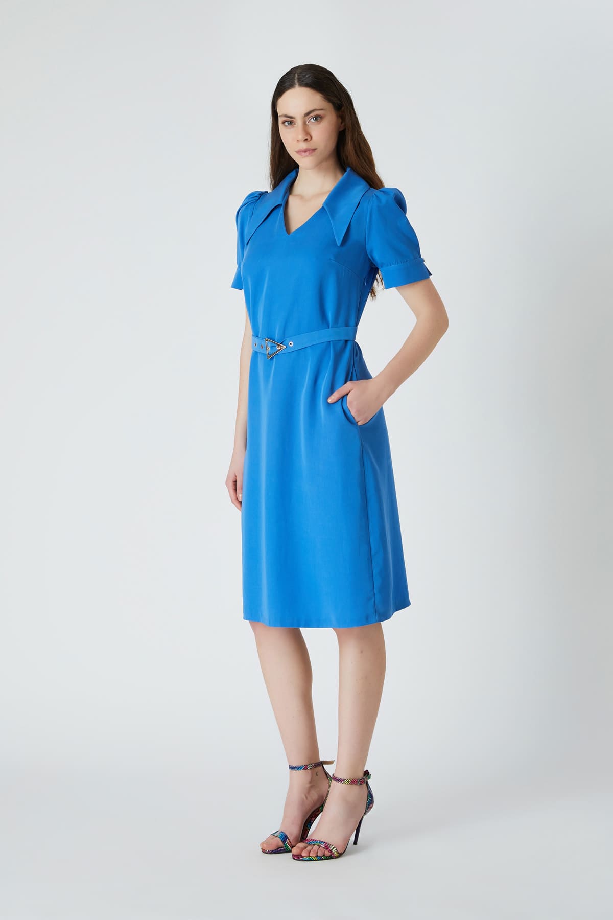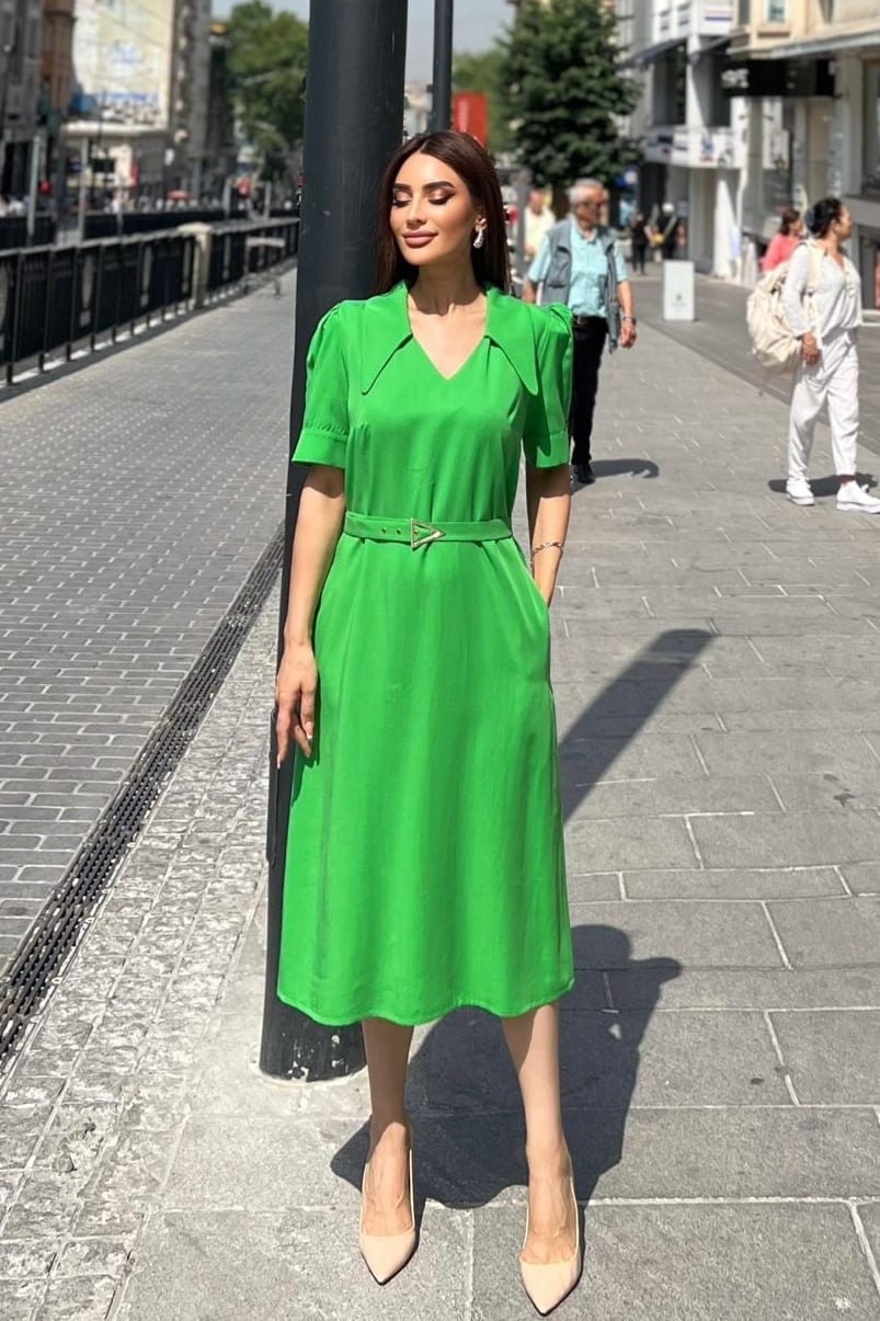 Açık yakalı kemerli elbise