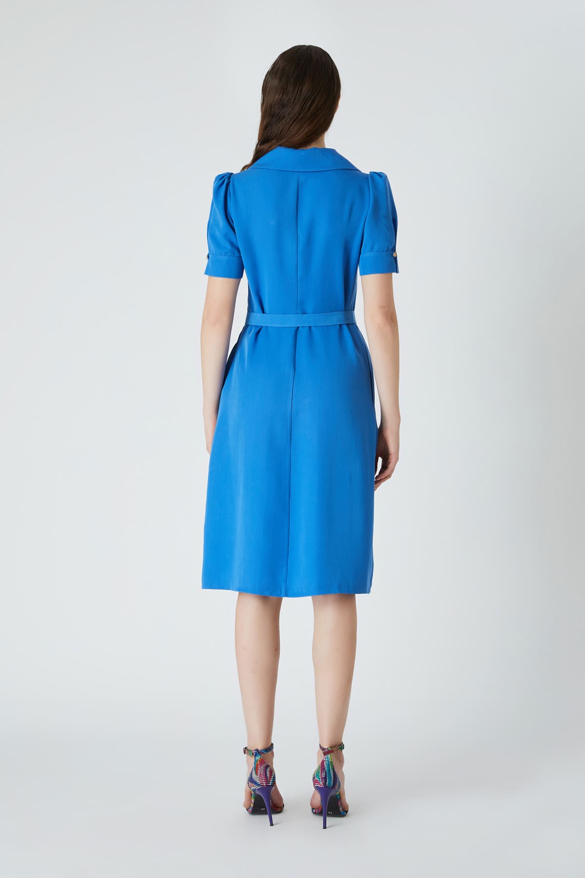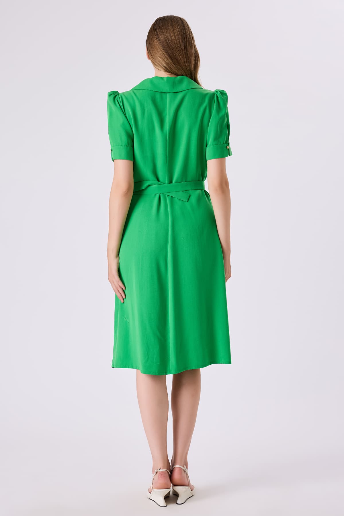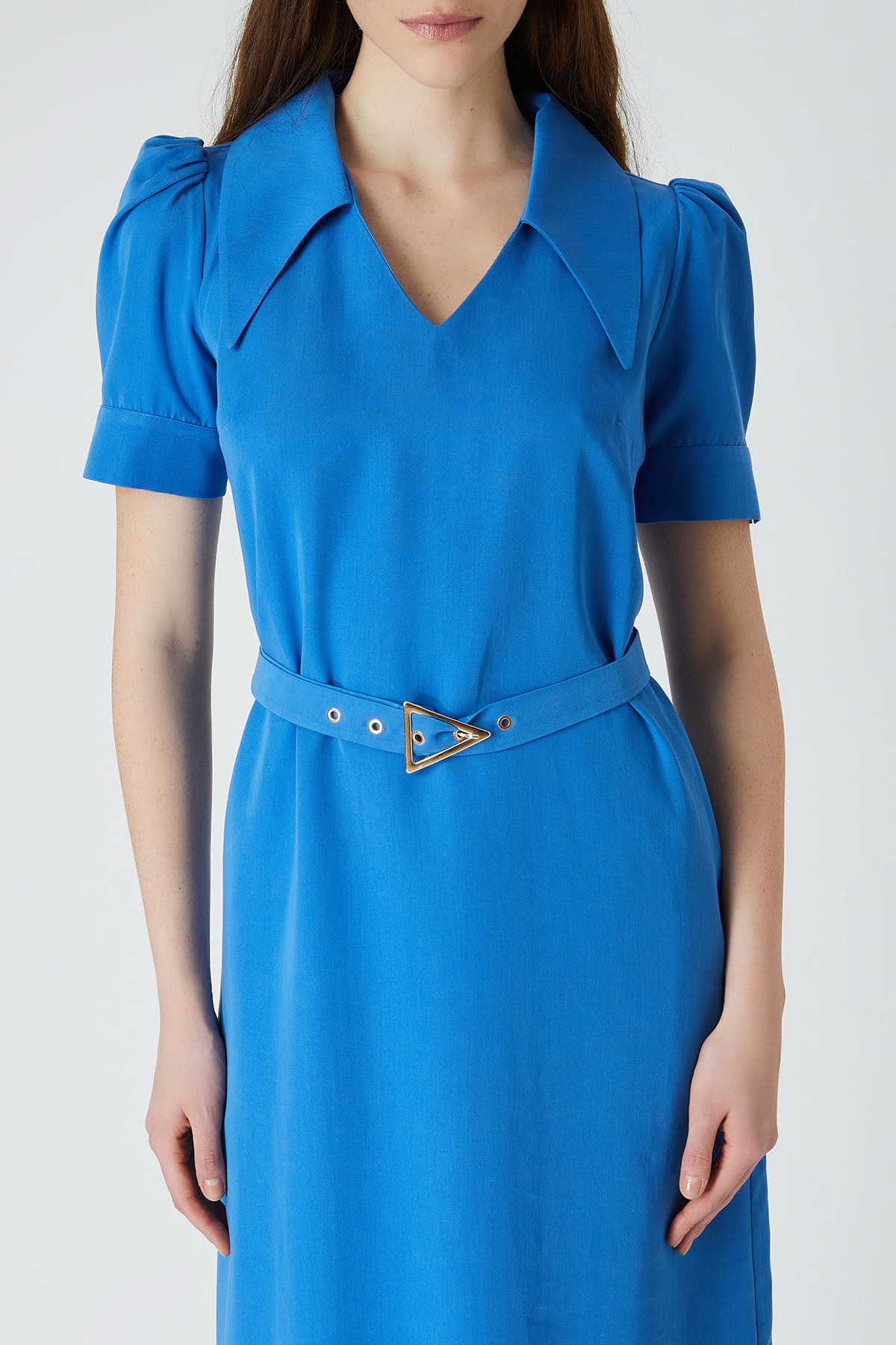 Açık yakalı kemerli elbise