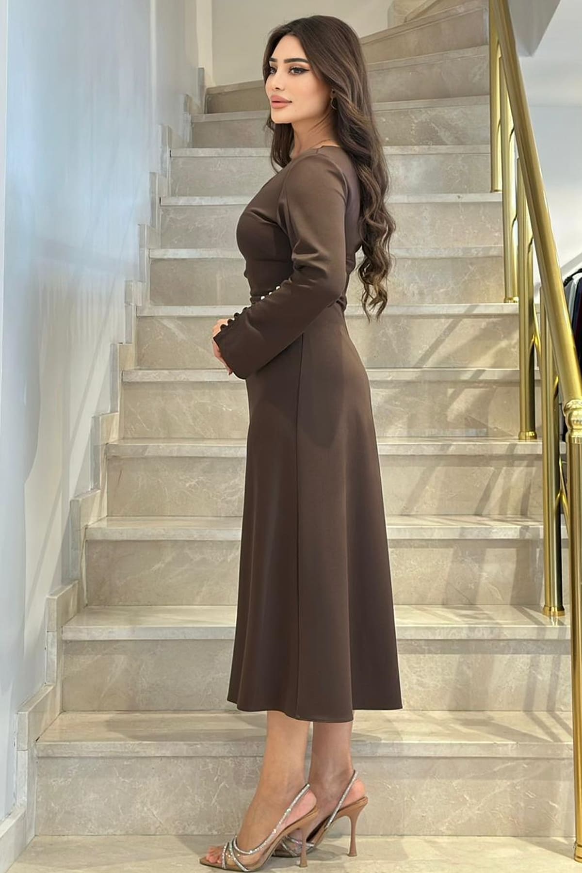 ÜRÜN BİLGİSİ:Likralı nefes alabilir kumaş,açık yakalı,kol ucu yırtmaç ve düğme detaylı,dikme aksesuarlı kloş etekli astarlı şık elbise.
