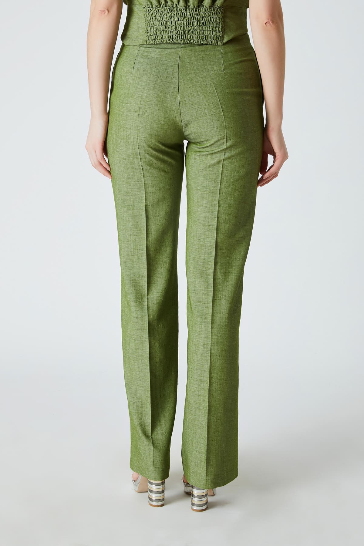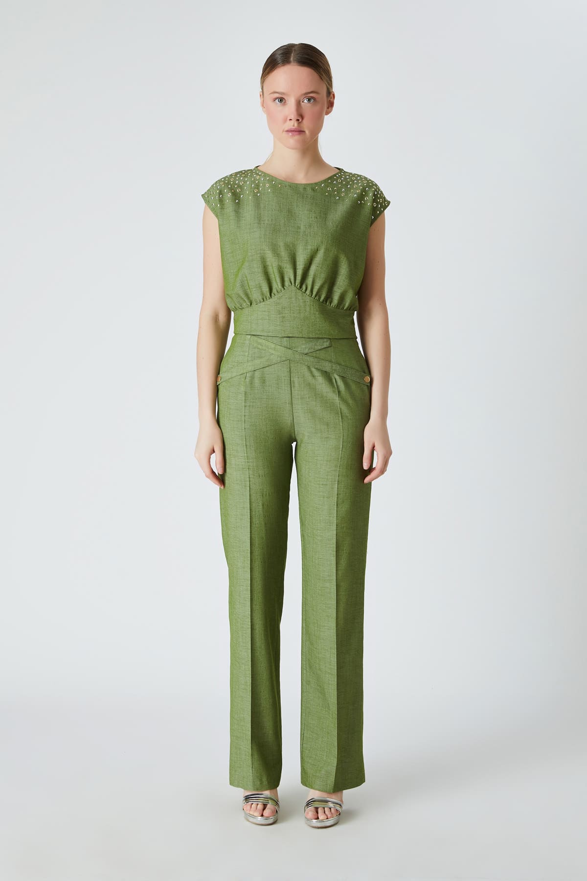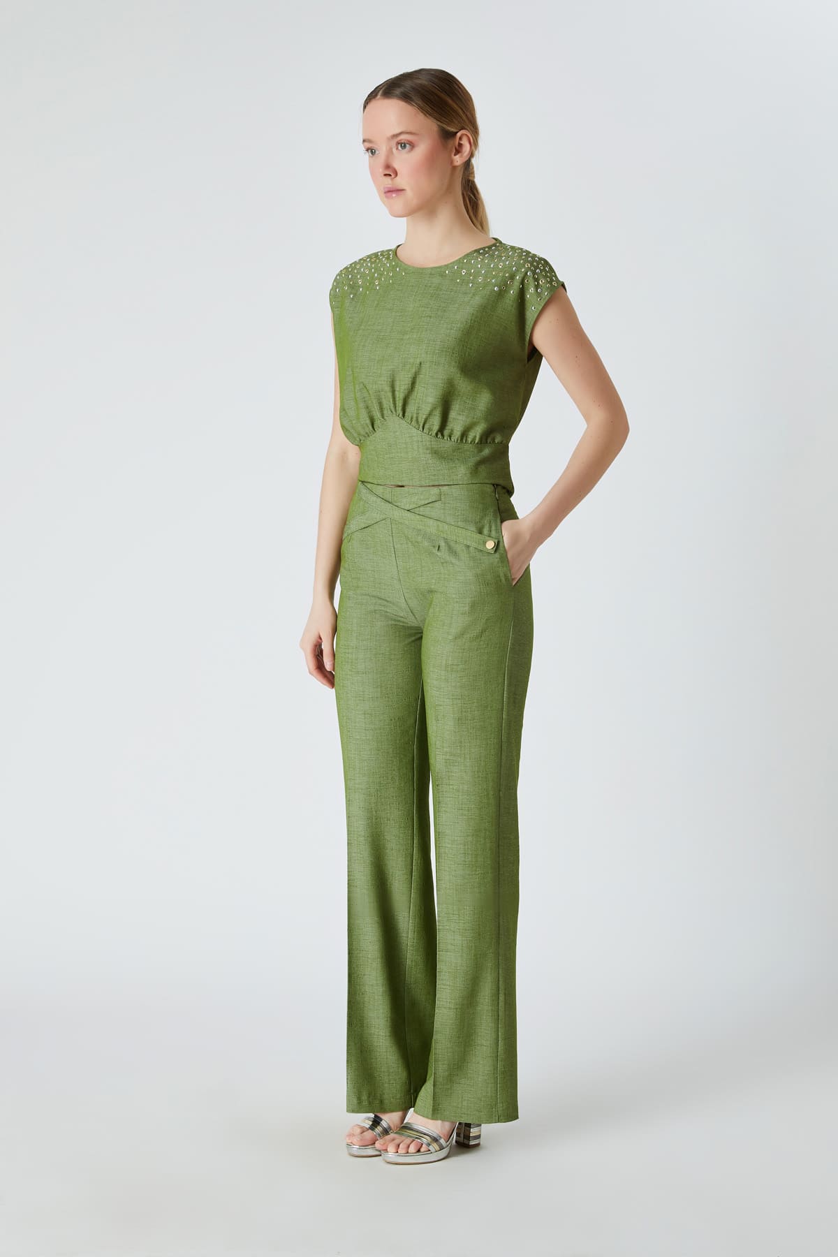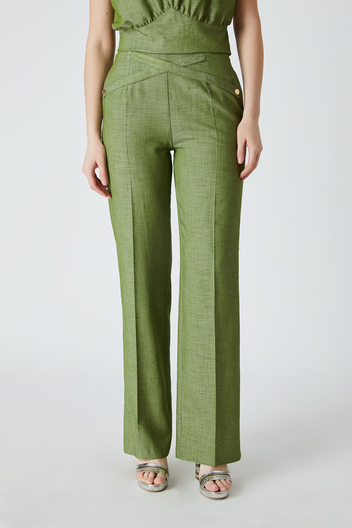 ÜRÜN BİLGİSİ:Viskon içerikli kumaş,normal bel,beli asimetrik bantlı,cepli,metal düğmeli,hafif geniş paça pantolon.