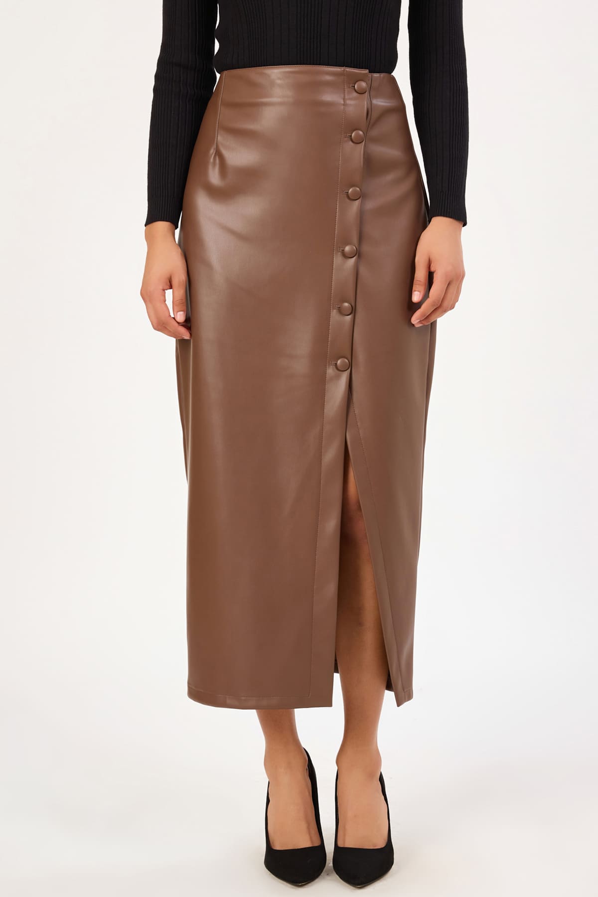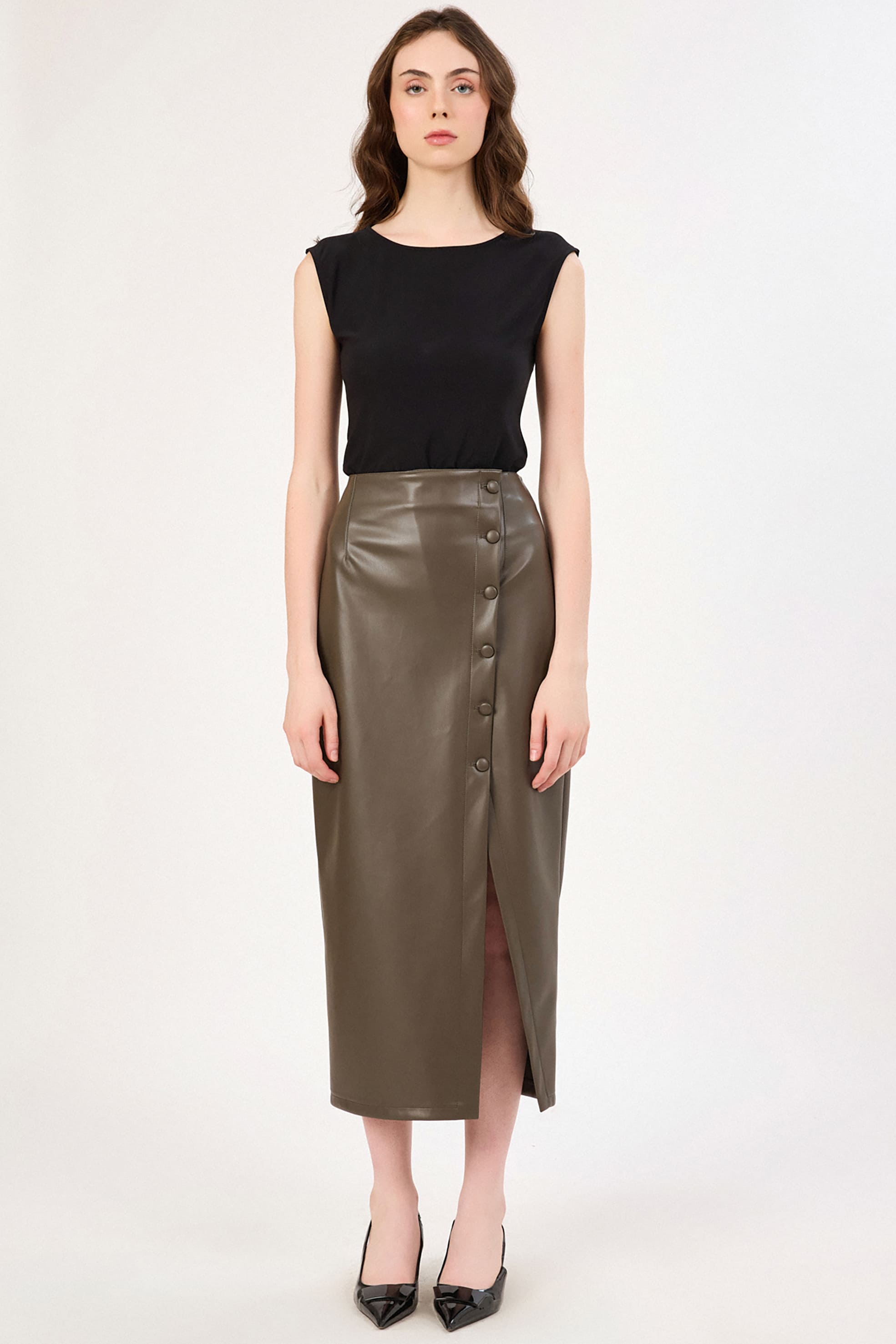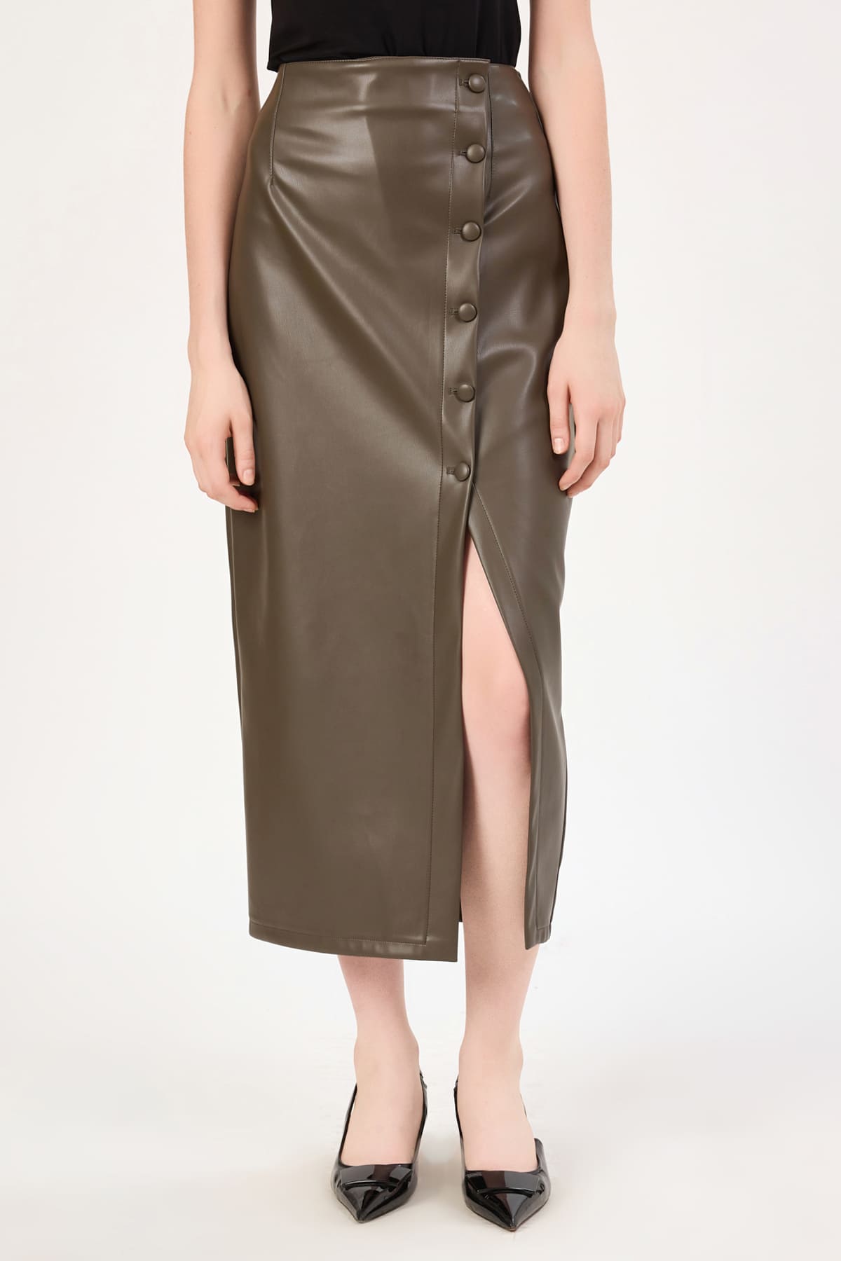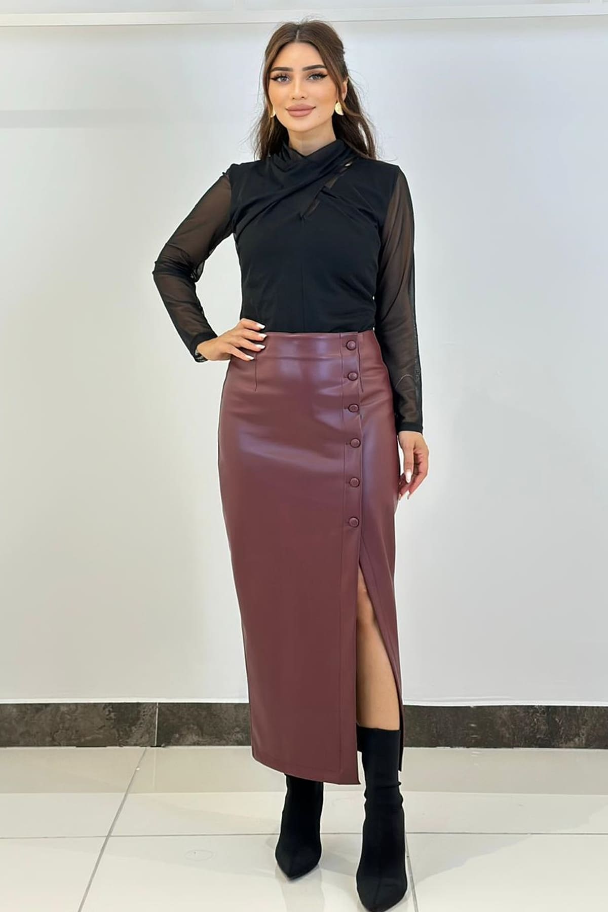ÜRÜN BİLGİSİ:Poliüretan kumaş,asimetrik düğme kapamalı,yırtmaçlı,diz altı etek.