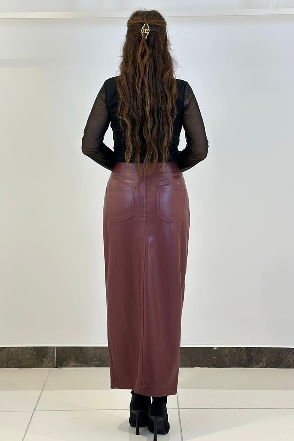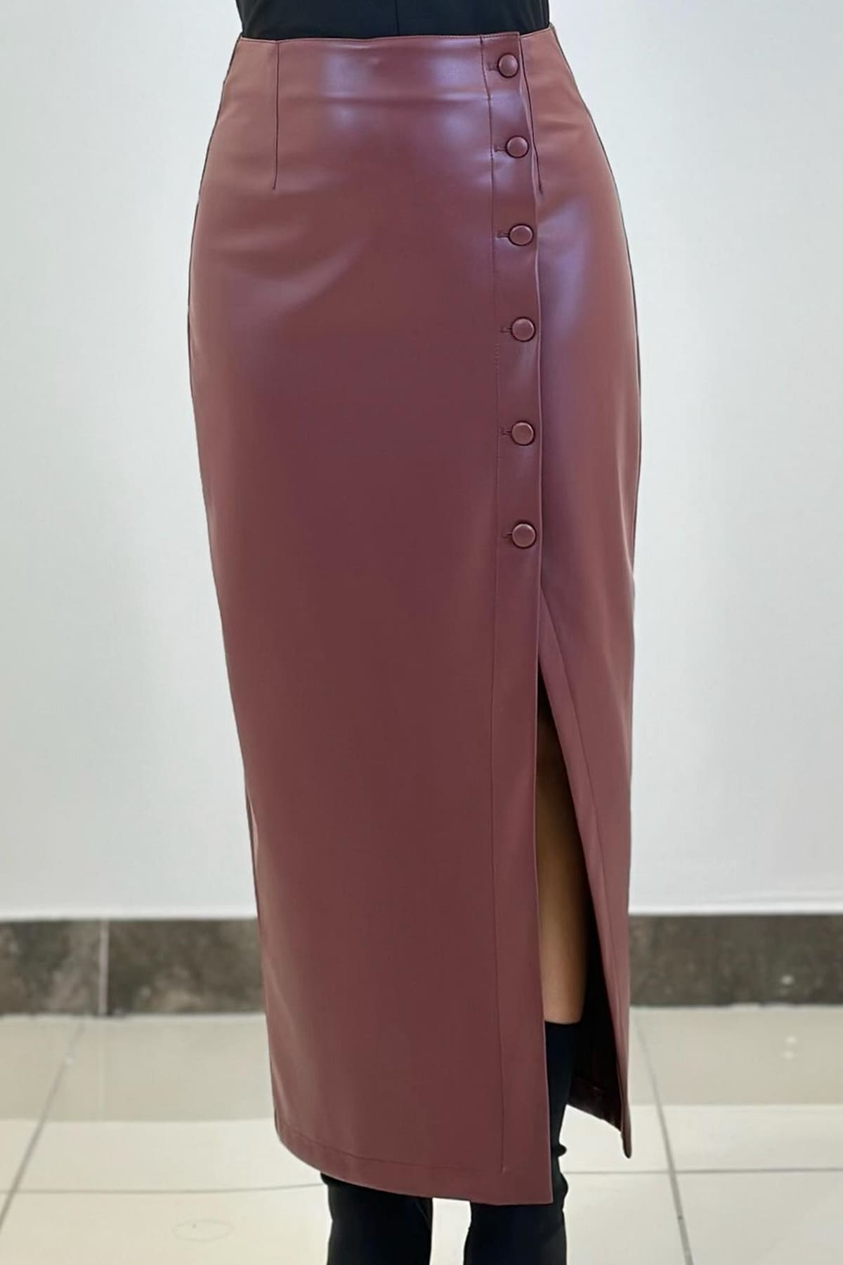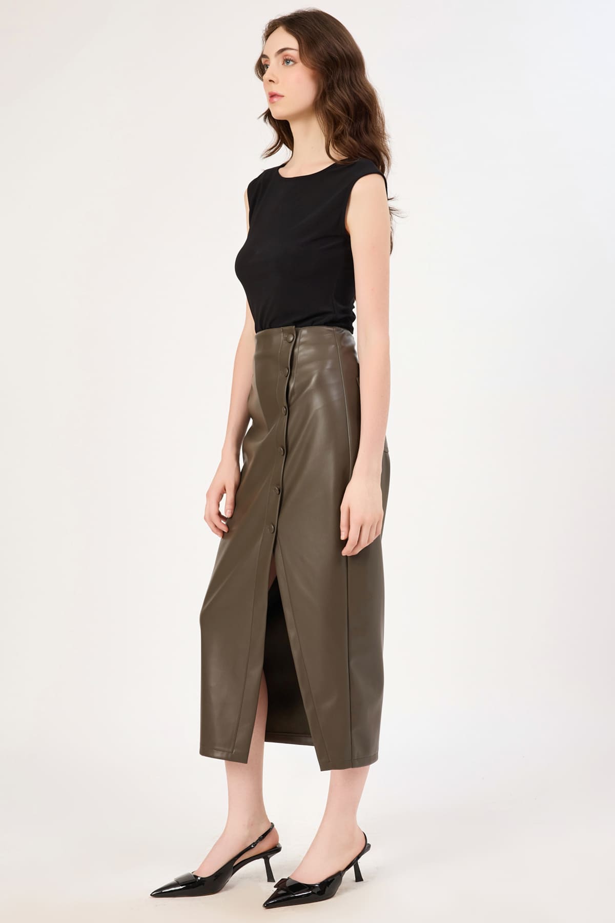 ÜRÜN BİLGİSİ:Poliüretan kumaş,asimetrik düğme kapamalı,yırtmaçlı,diz altı etek.