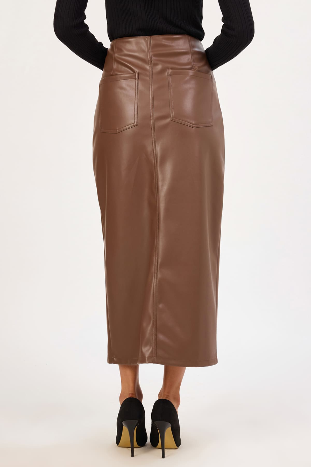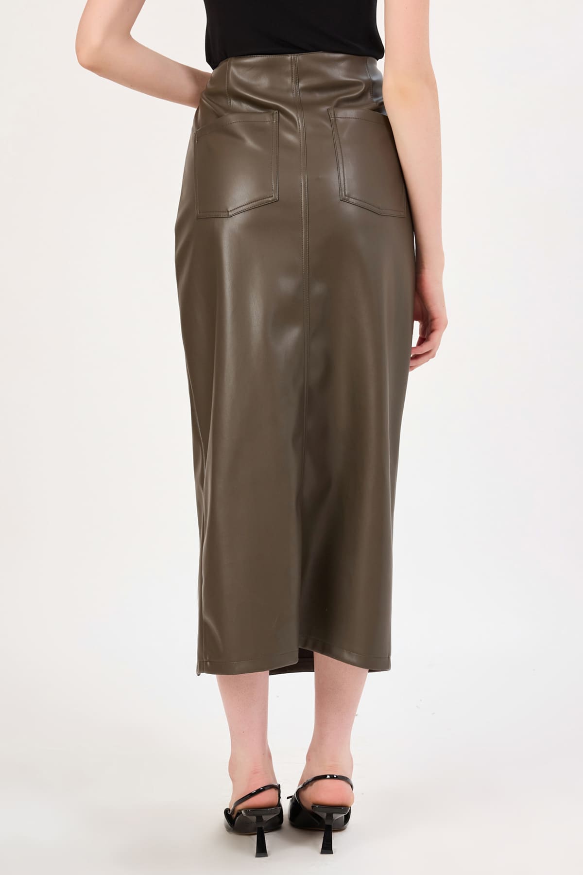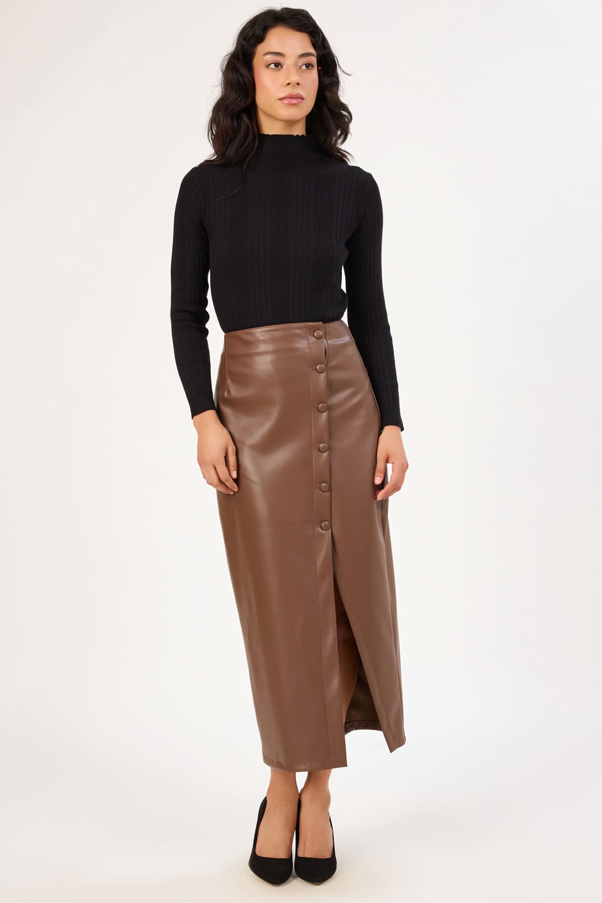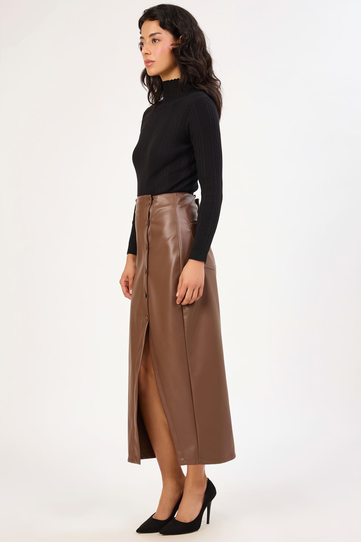 ÜRÜN BİLGİSİ:Poliüretan kumaş,asimetrik düğme kapamalı,yırtmaçlı,diz altı etek.