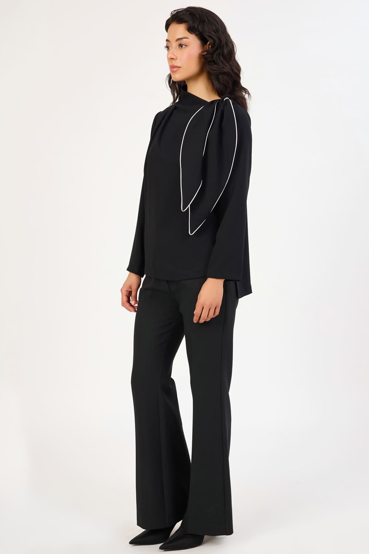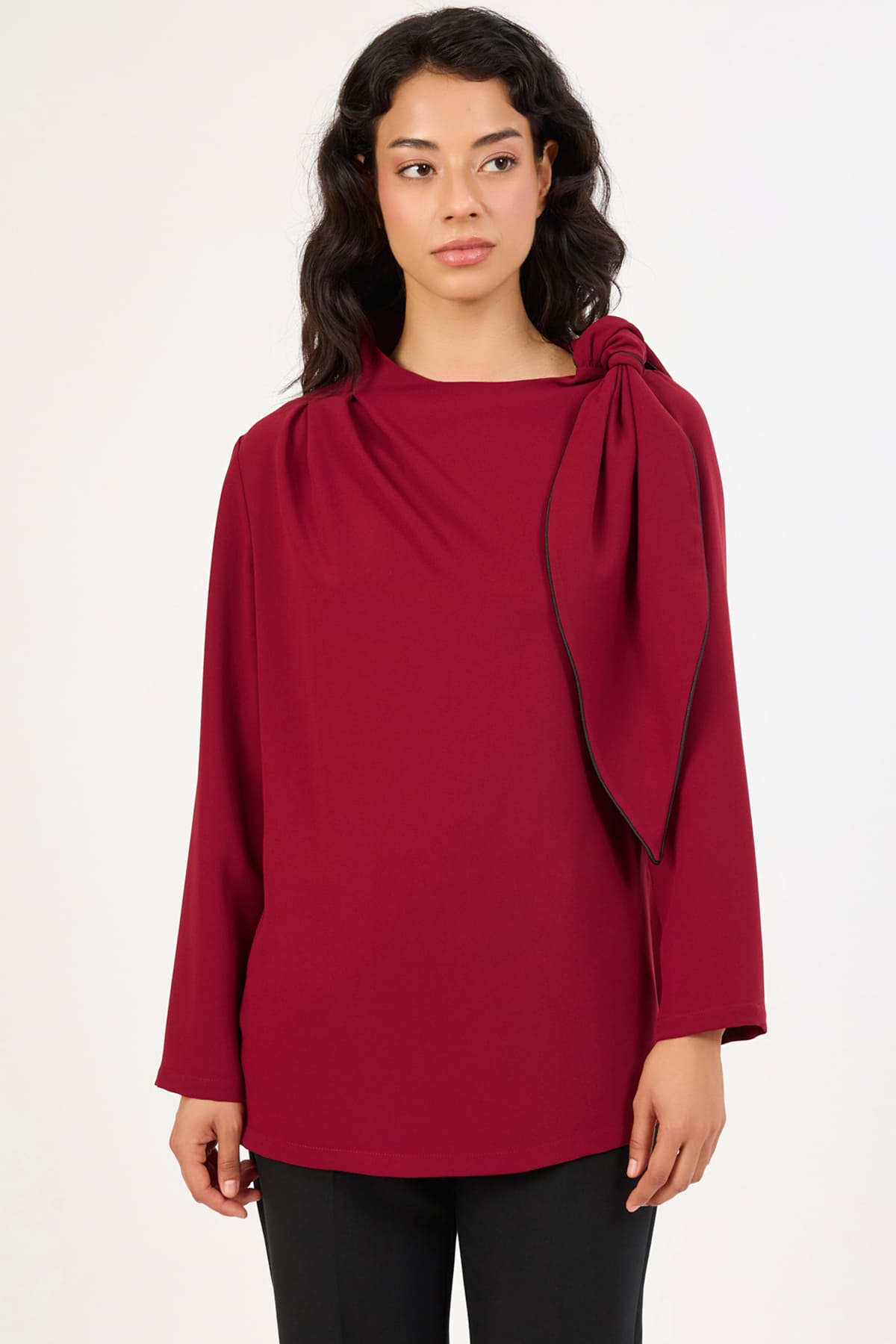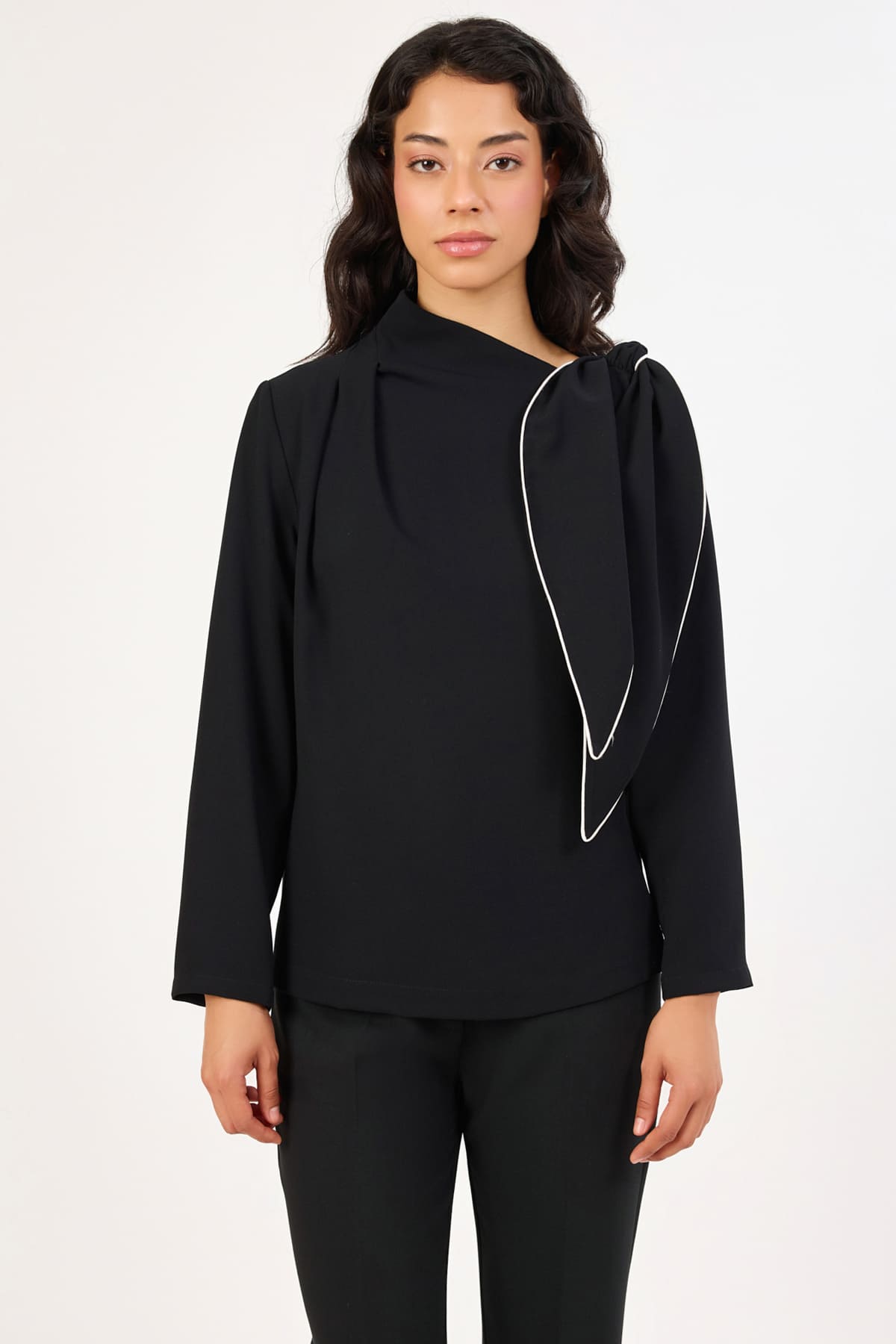 Asimetrik yaka fiyonk detaylı bluz