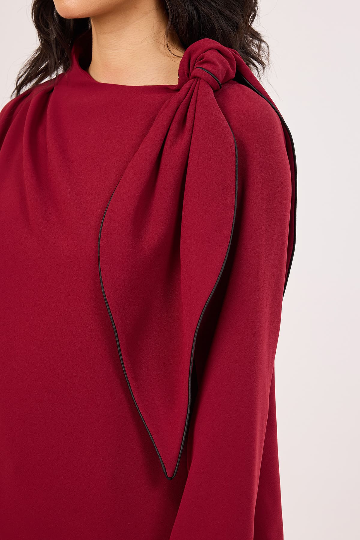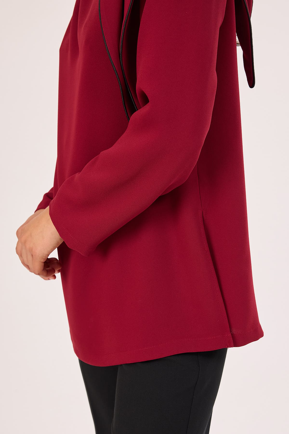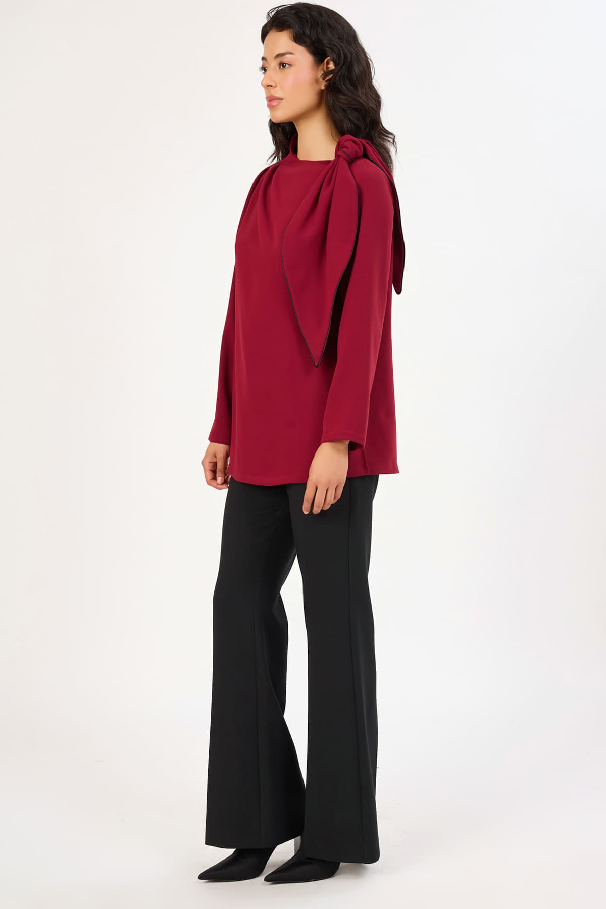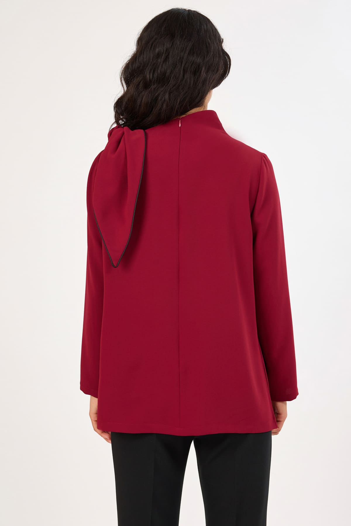 Asimetrik yaka fiyonk detaylı bluz