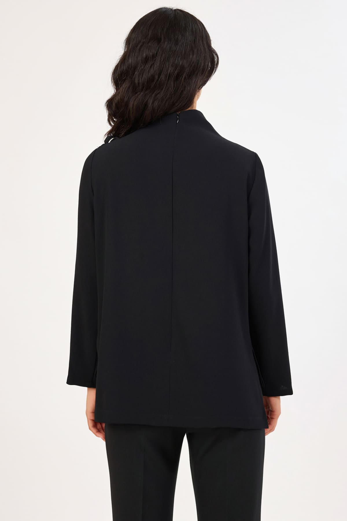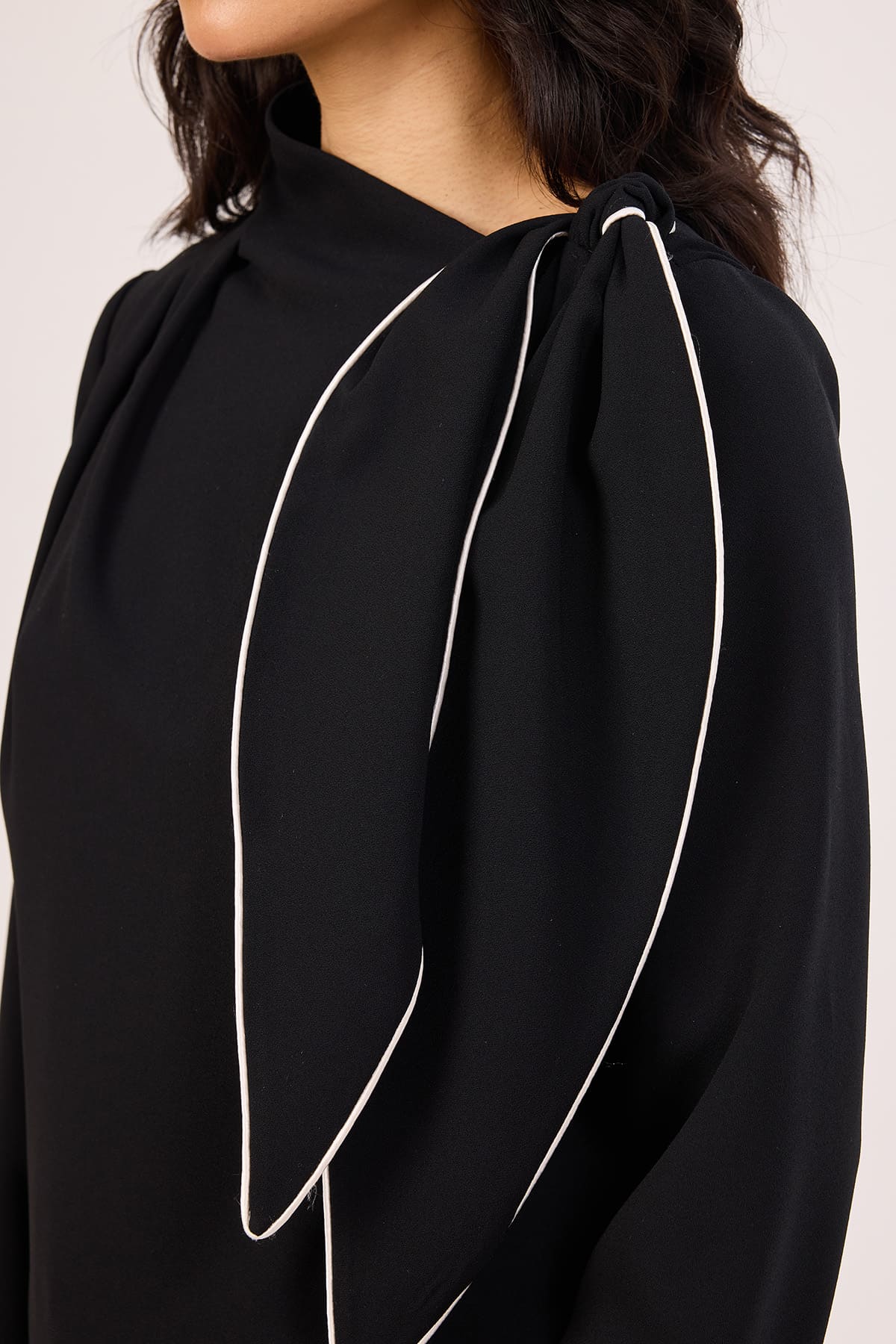 ÜRÜN BİLGİSİ:Yeni nesil dökümlü krep kumaş,asimetrik yakalı,fiyonk detaylı,arkası fermuarlı,kontrast şeritli şık bluz.