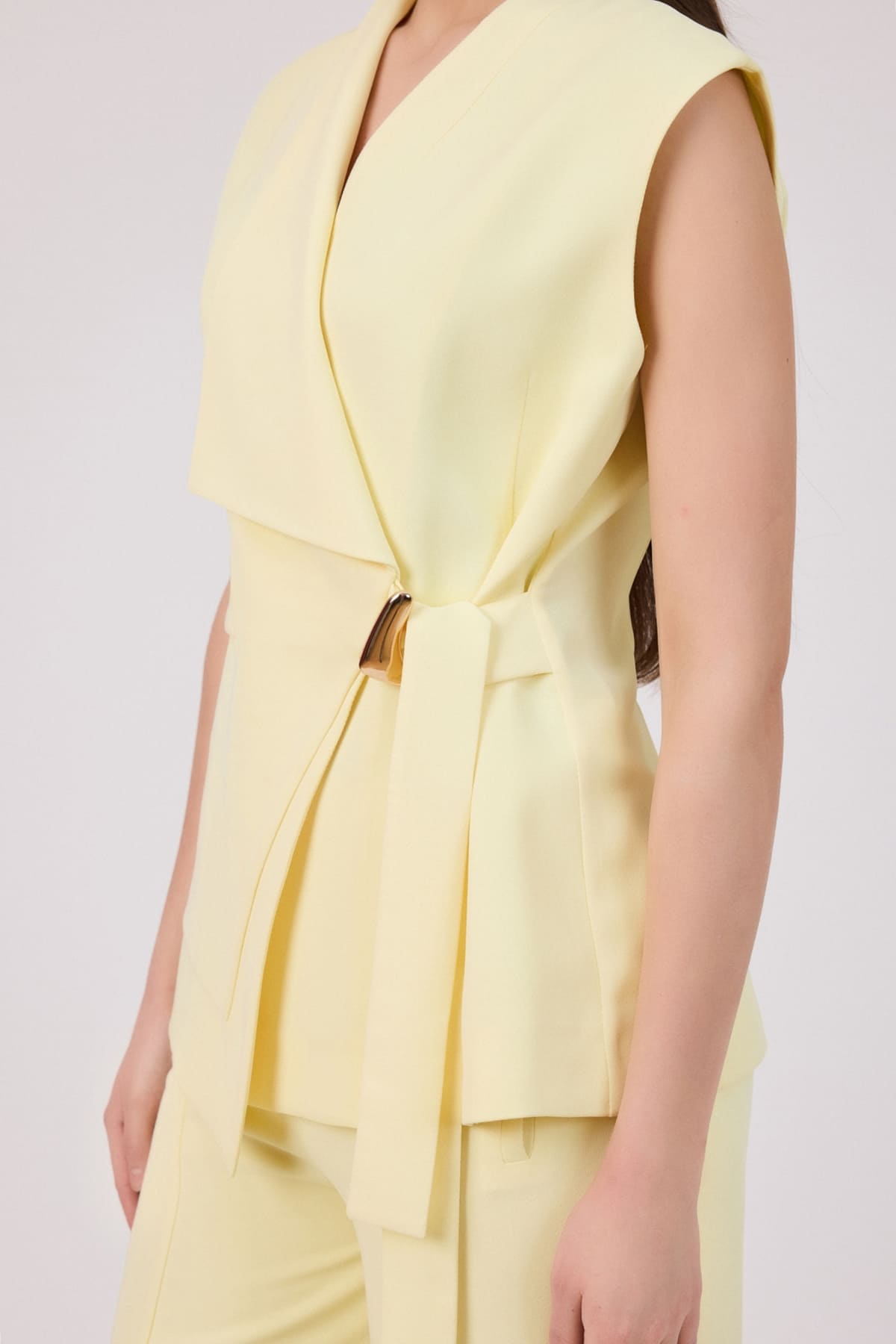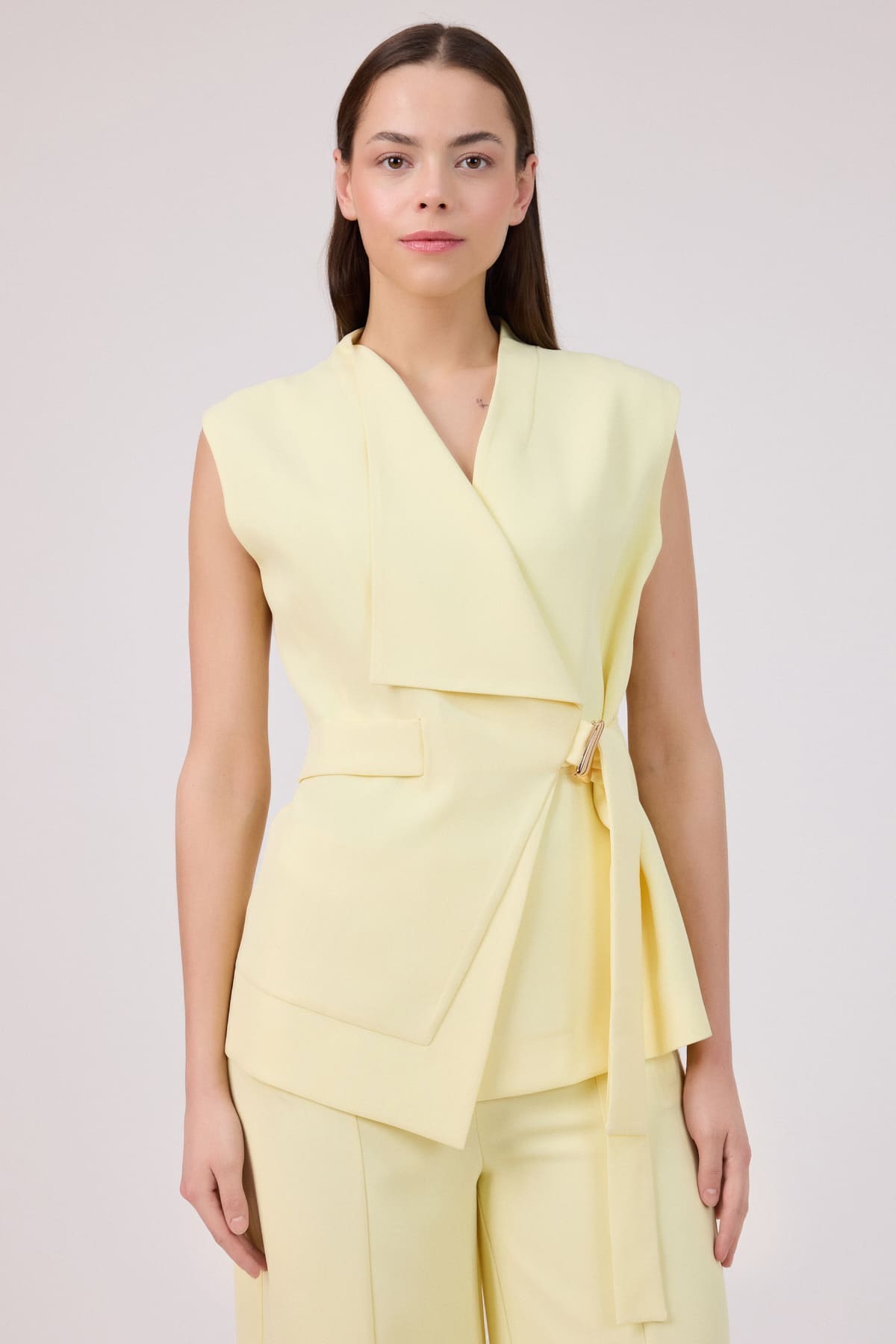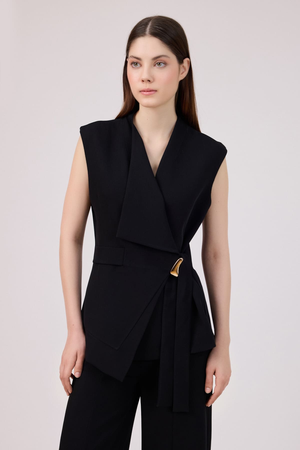 ÜRÜN BİLGİSİ:Hafif dökümlü kumaş,tek tarafta asimetrik yakalı,gold metal aksesuarlı ve ön yanda bağlamalı şık yelek