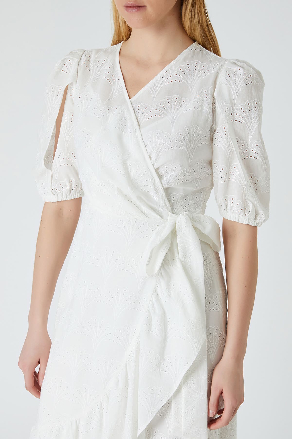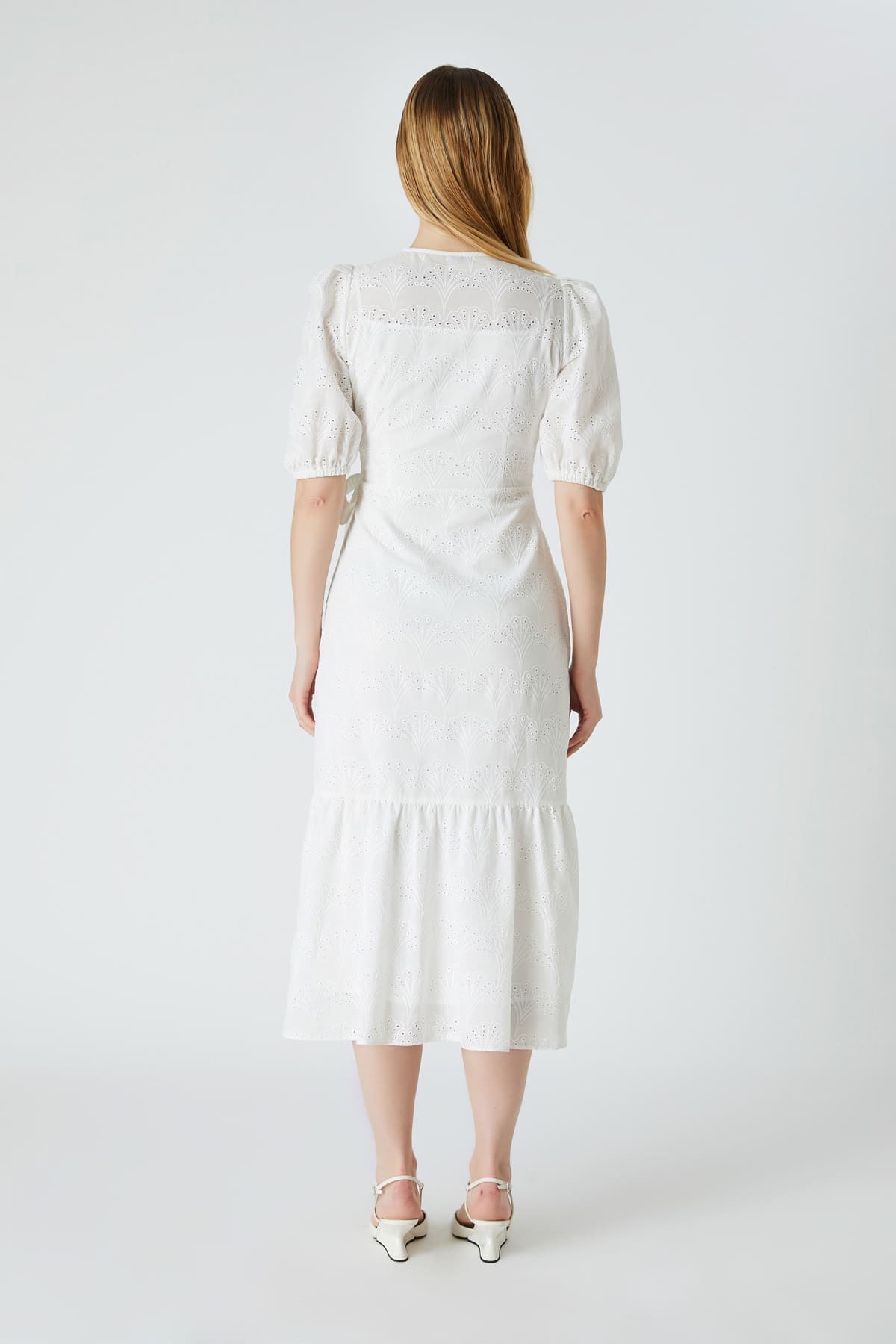 ÜRÜN BİLGİSİ:Pamuk içerikli brodeli kumaş,anvelop kapamalı,yandan bağlamalı,kolu yarım ve yırtmaç detaylı,asimetrik etekli,astarlı elbise.