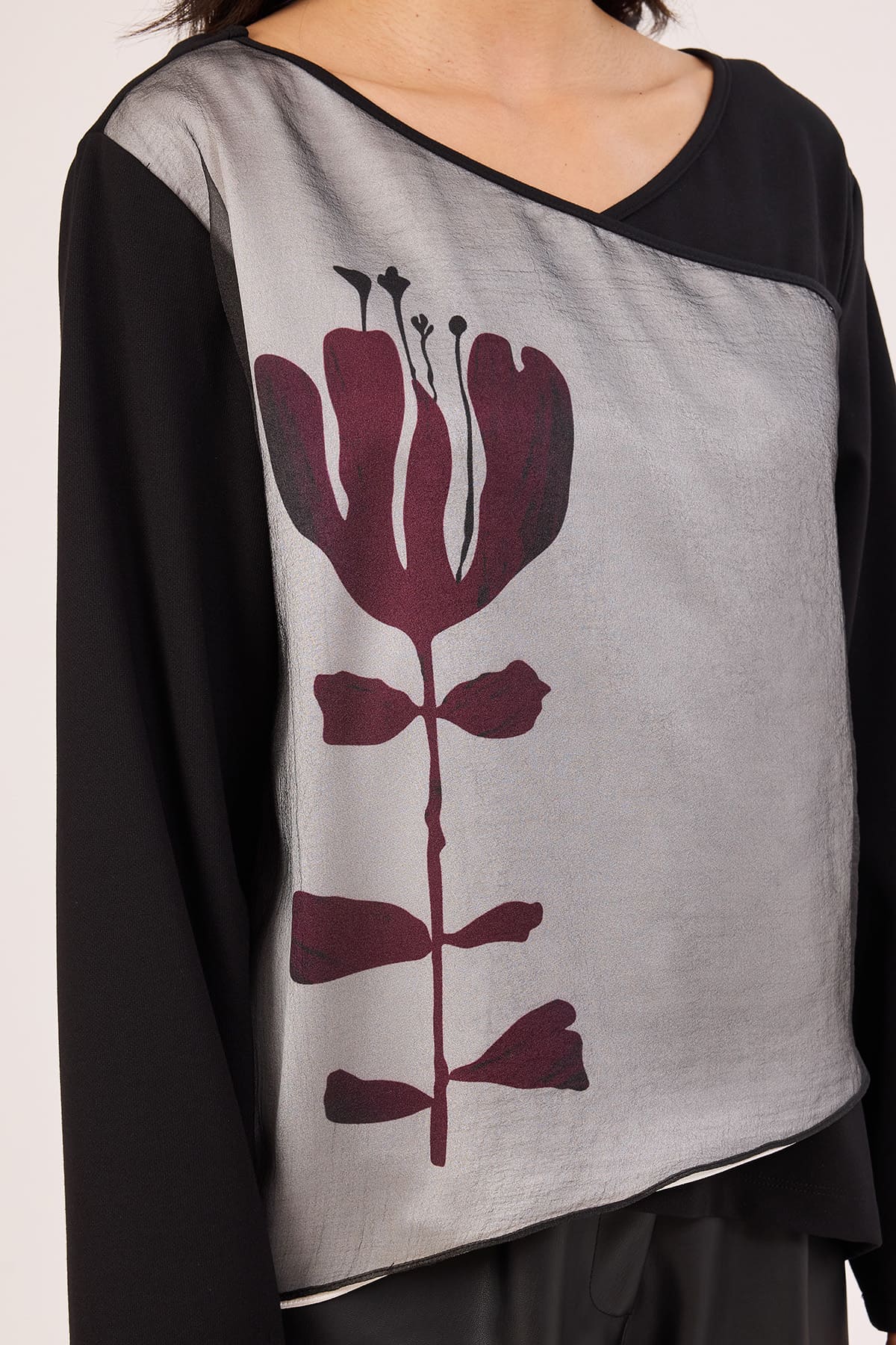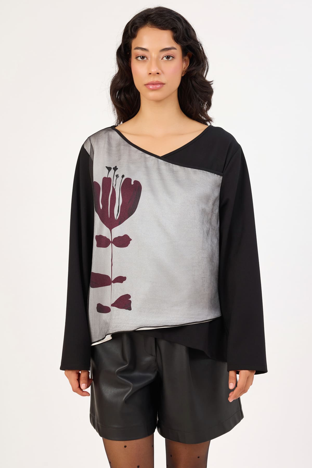 ÜRÜN BİLGİSİ:Krep dokulu örme kumaş,önü baskılı saten kumaş geçişli,asimetrik yakalı,rahat form örme bluz