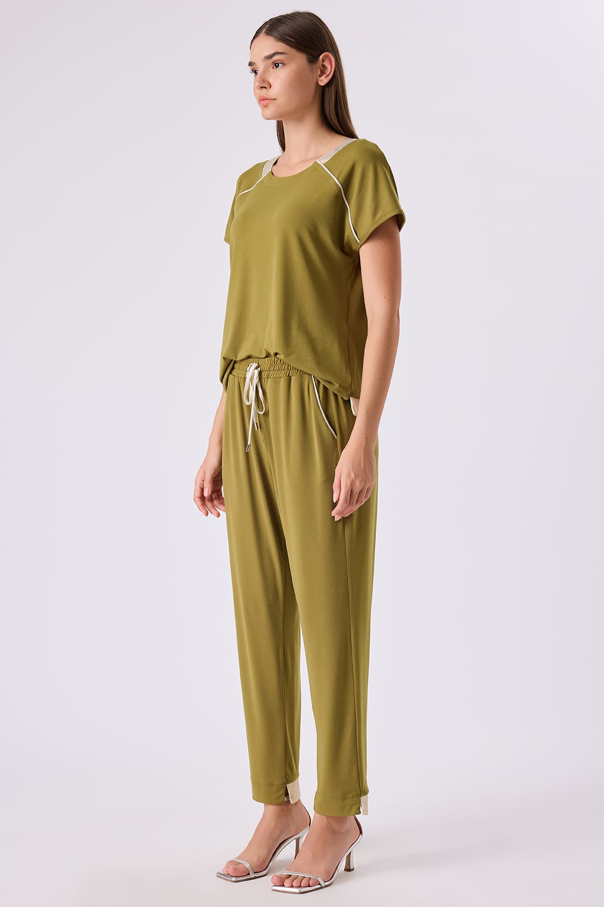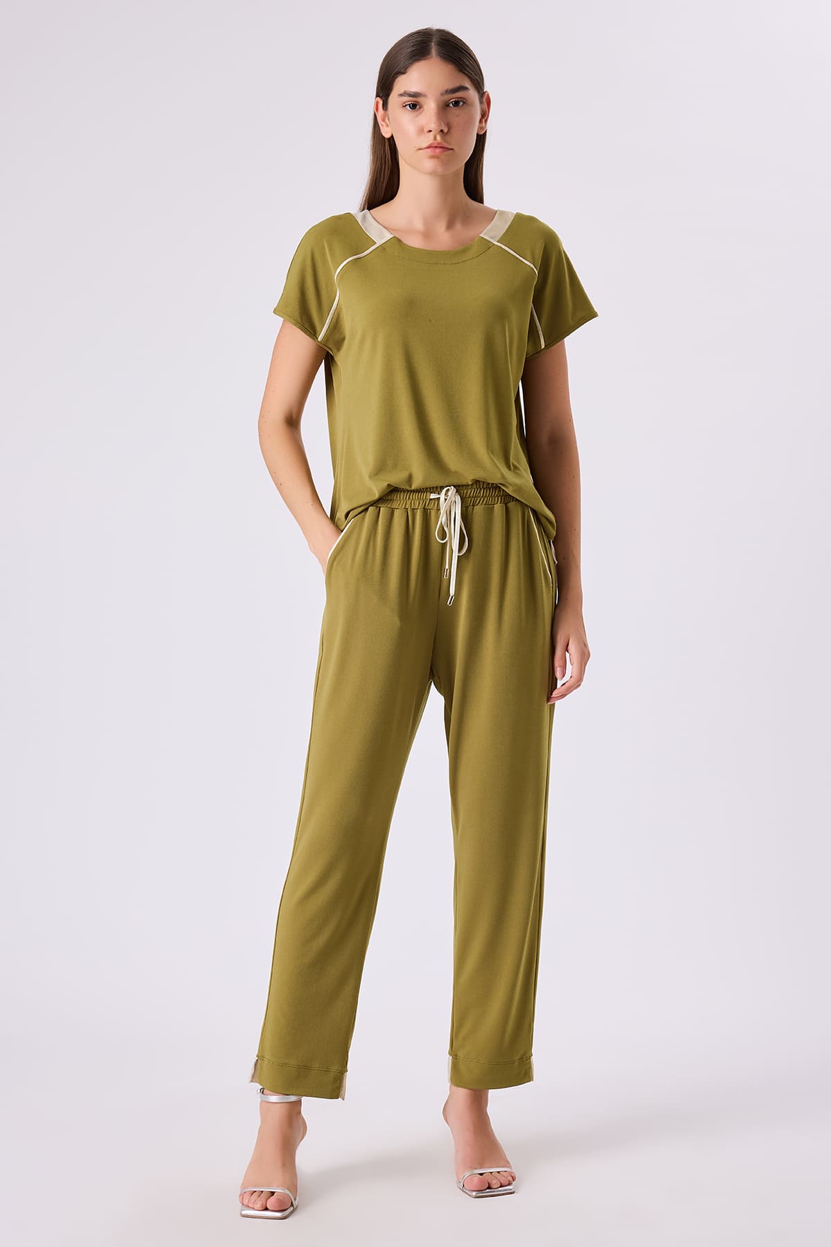 ÜRÜN BİLGİSİ:Esnek dokulu örme kumaş,cep biyeleri ve bağcığı parlak kumaş geçişli,beli lastikli,bağcıklı,yan cepli,rahat form pantolon.