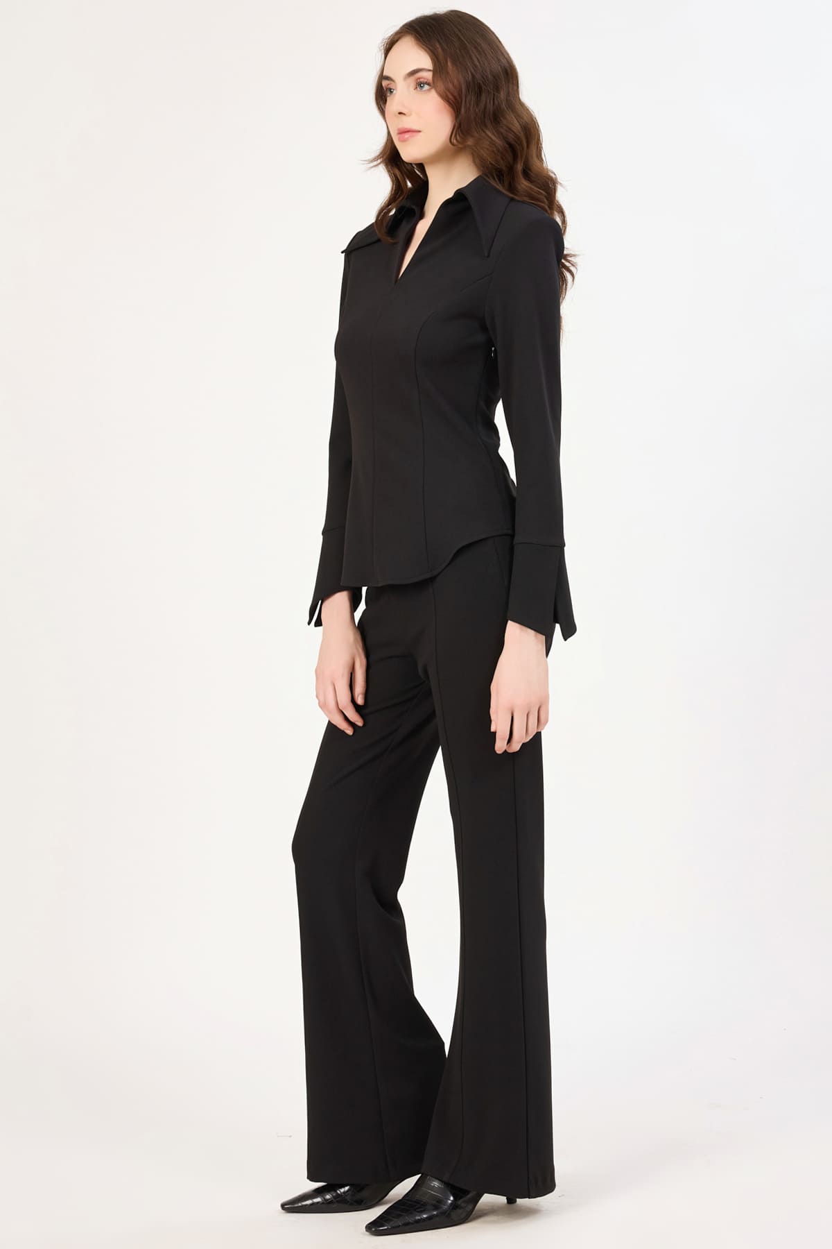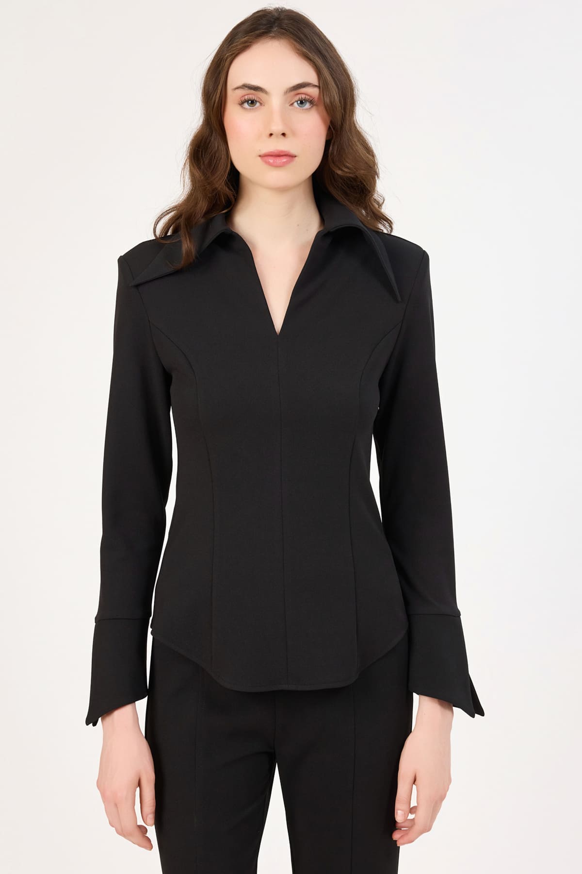 ÜRÜN BİLGİSİ:Likralı krep dokulu nefes alabilir kumaş,yakalı,yan fermuarlı,kol ucu asimetrik,fit form şık gömlek.