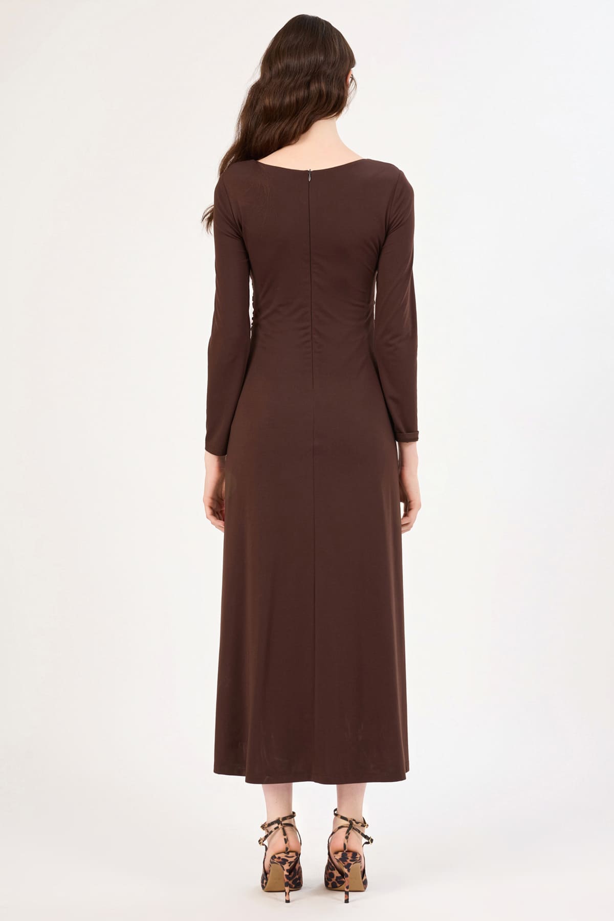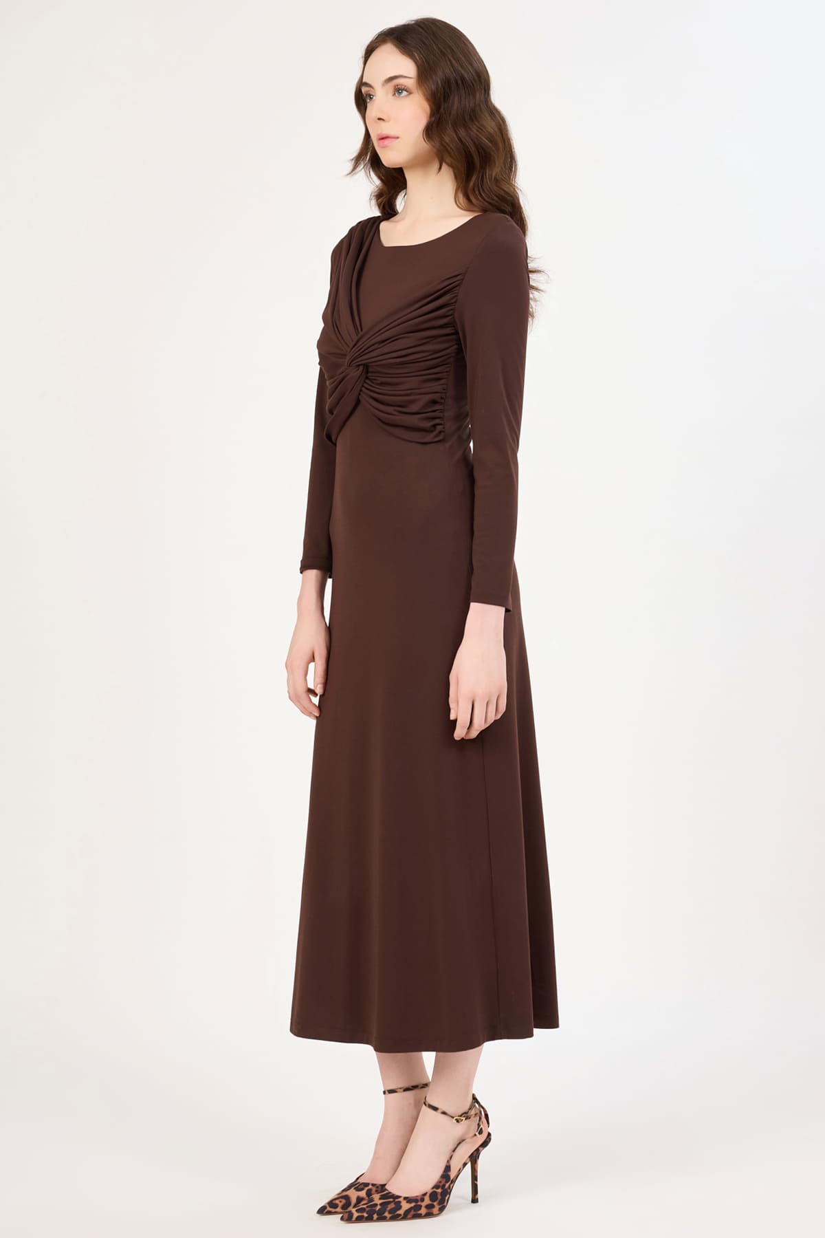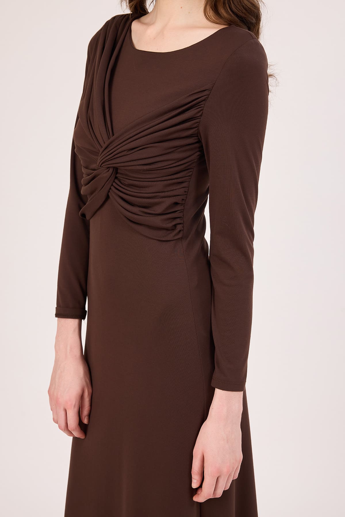ÜRÜN BİLGİSİ:Viskon içerikli likralı örme kumaş,yuvarlak yakalı,önü düğüm detaylı,uzun kollu fermuarlı,astarlı oturan fit form şık elbise.