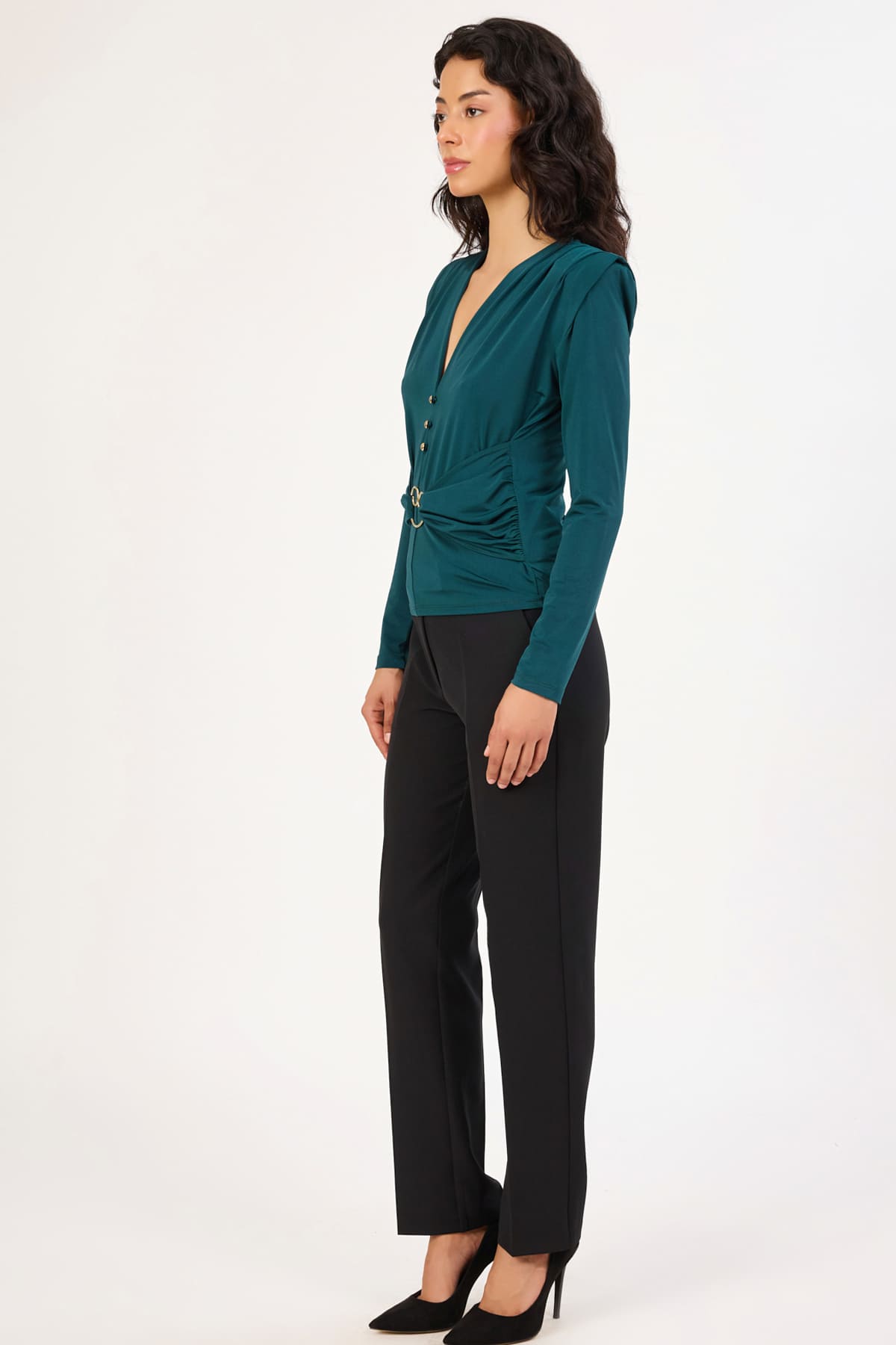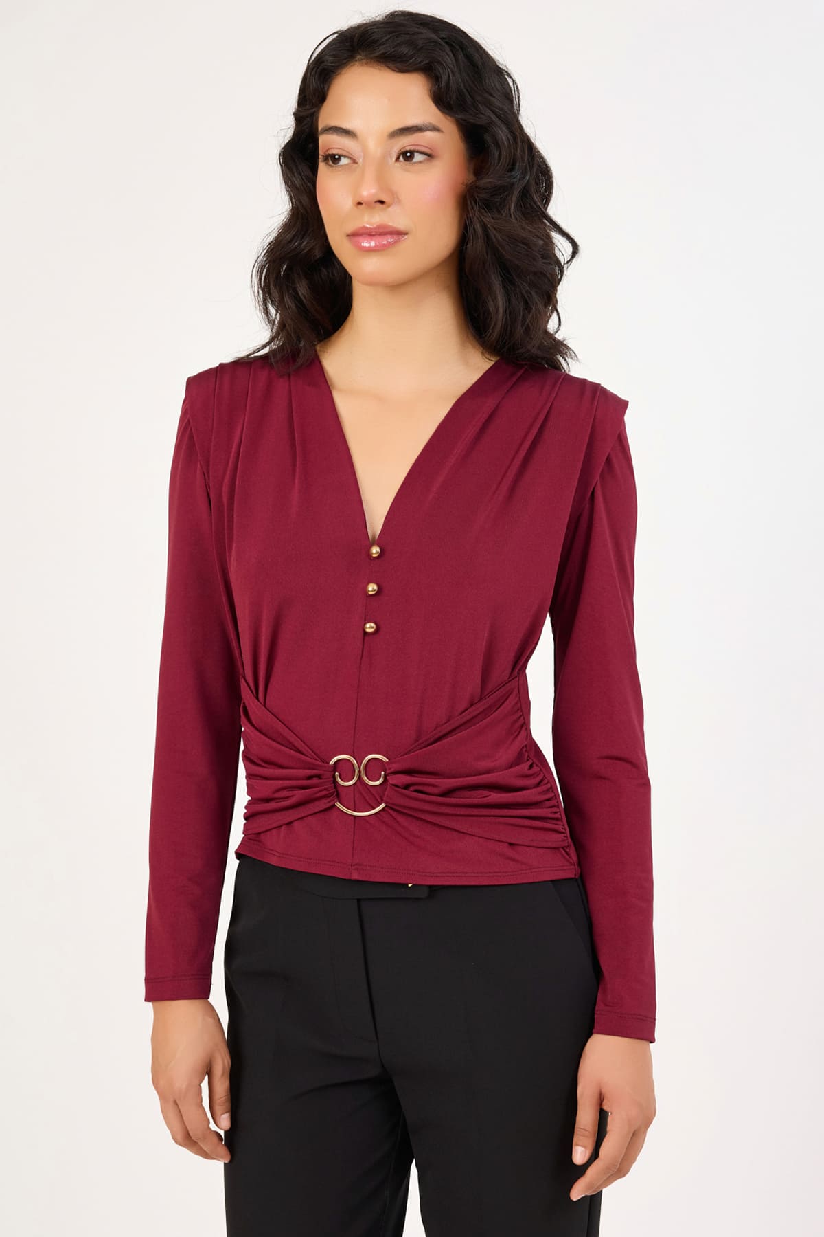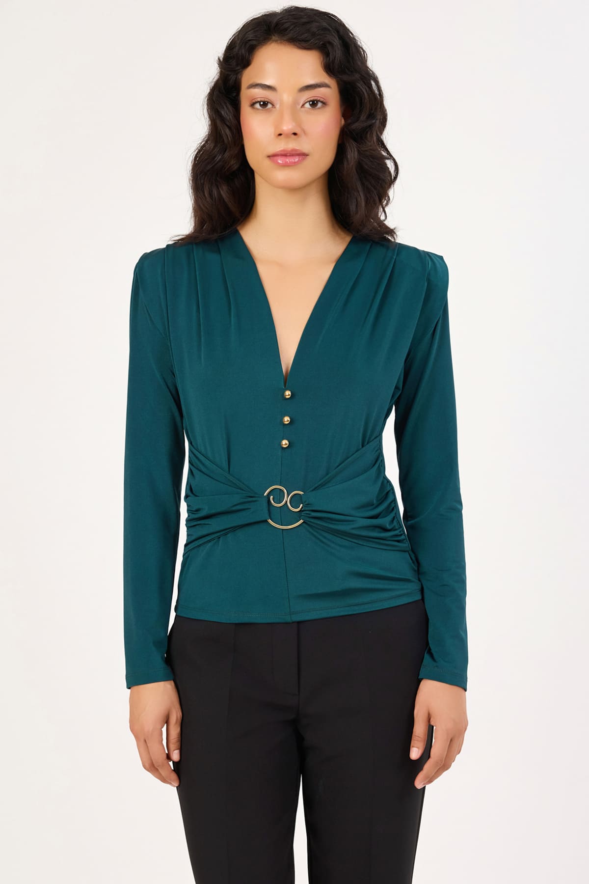 ÜRÜN BİLGİSİ:Likralı nefes alabilir kumaş,açık yakalı,gold düğmeli,aksesuar detaylı,büzgülü uzun kollu.