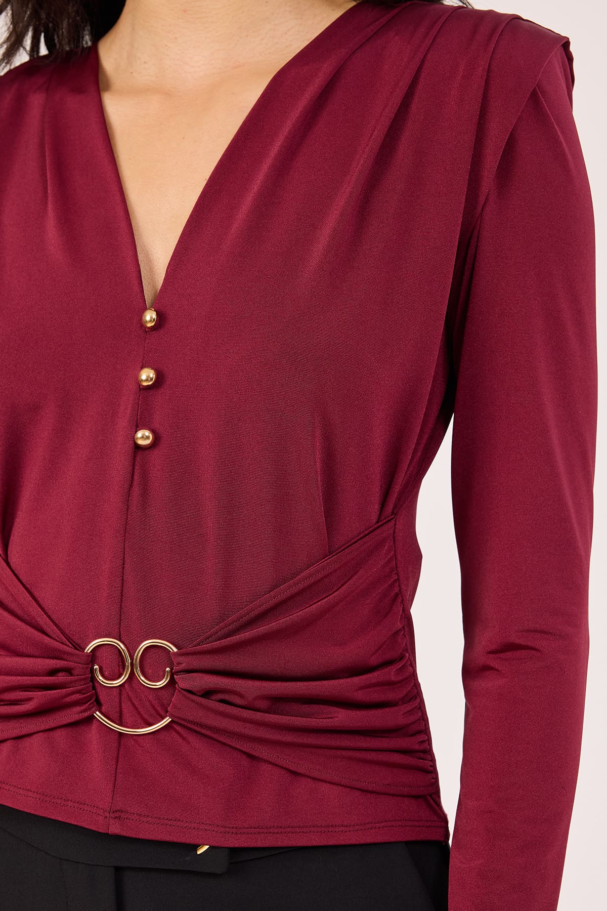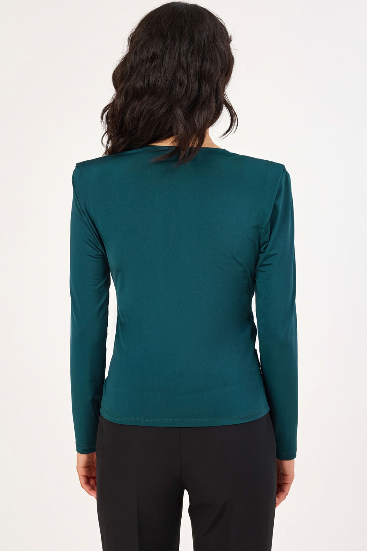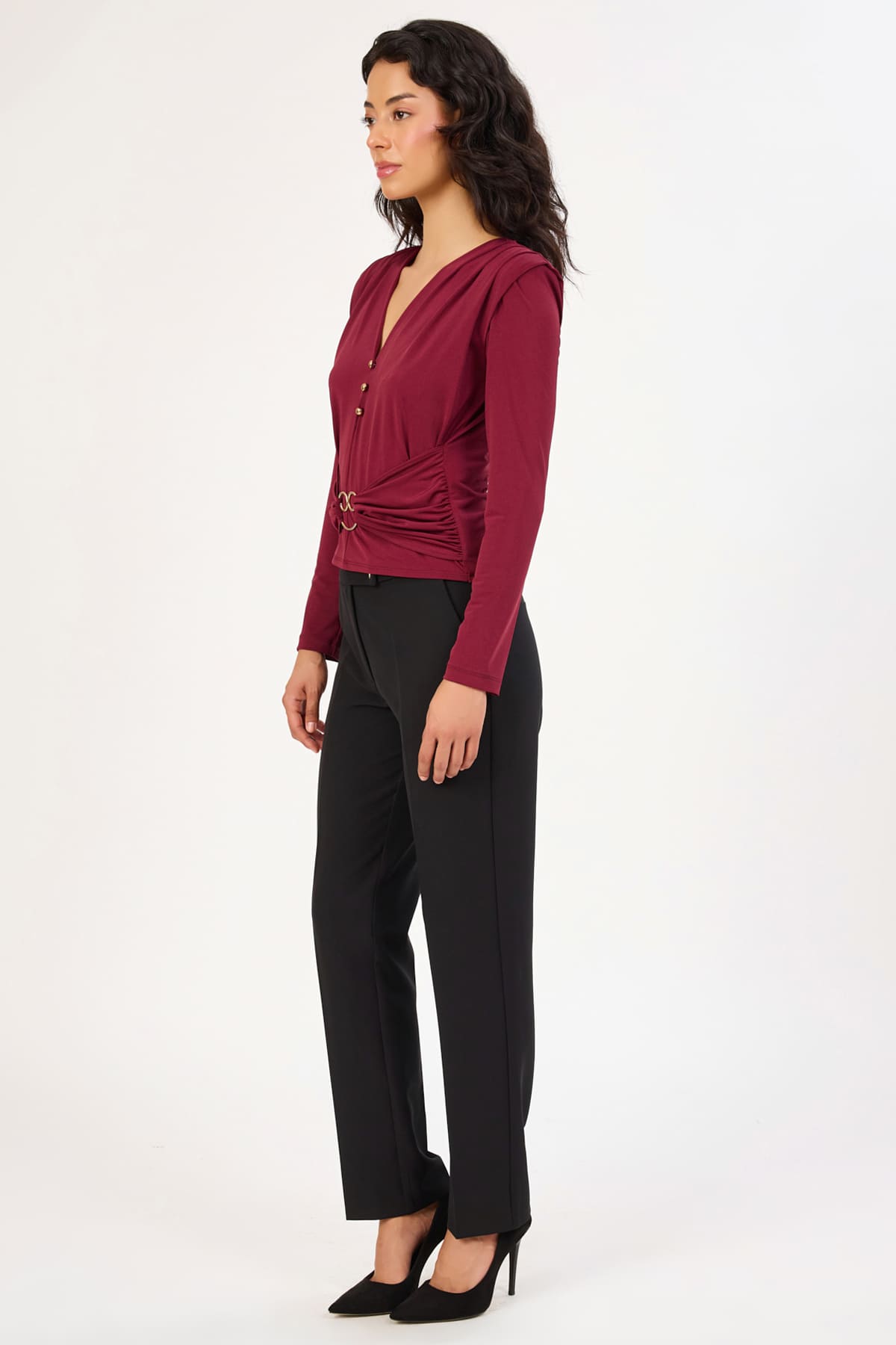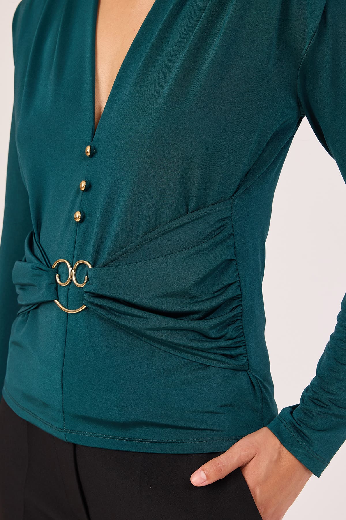ÜRÜN BİLGİSİ:Likralı nefes alabilir kumaş,açık yakalı,gold düğmeli,aksesuar detaylı,büzgülü uzun kollu.
