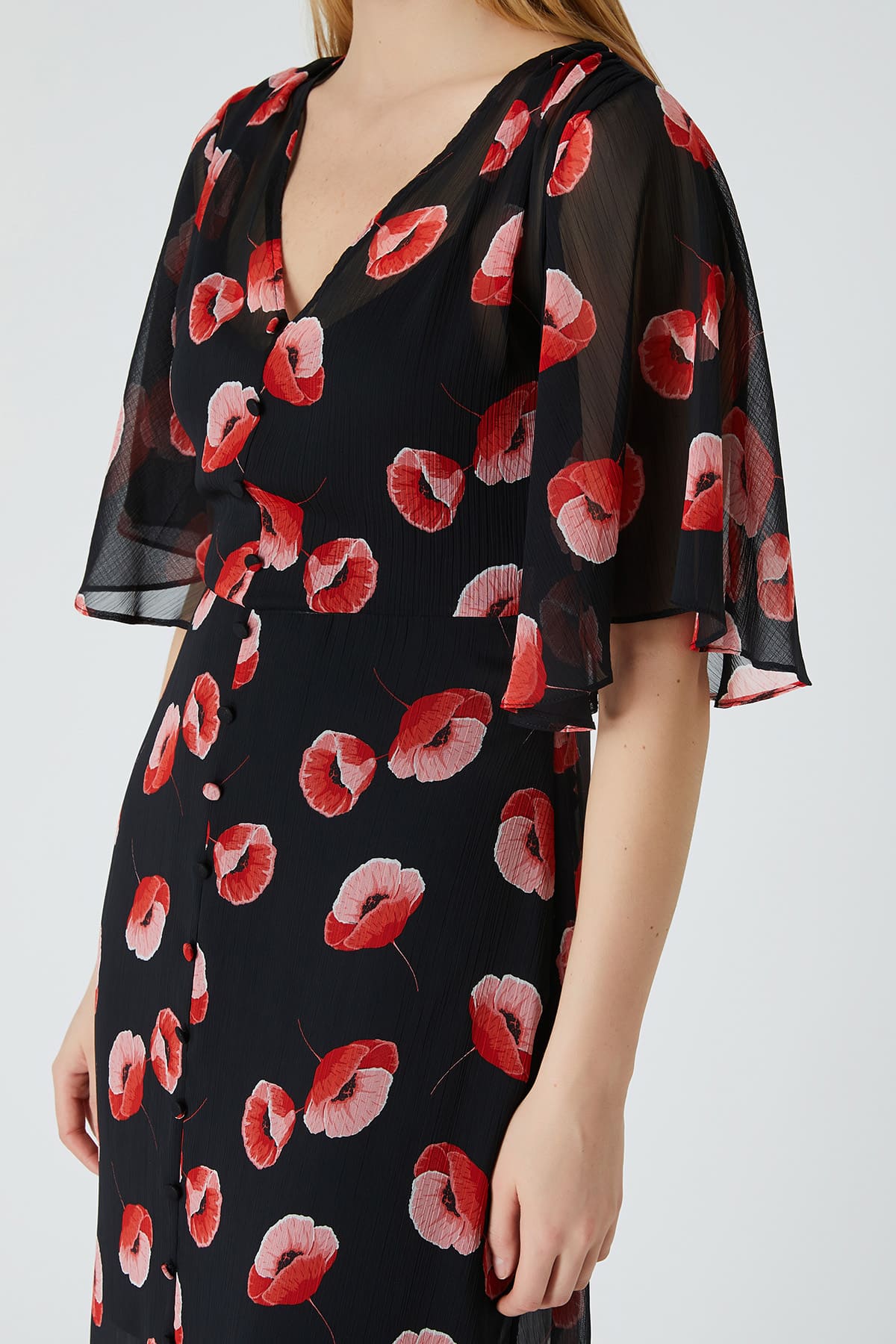 ÜRÜN BİLGİSİ:Dökümlü kırınkıl desenli kumaş,v yakalı,pelerin kollu,önü yırtmaçlı,düğme detaylı,fermuarlı,astarlı elbise.