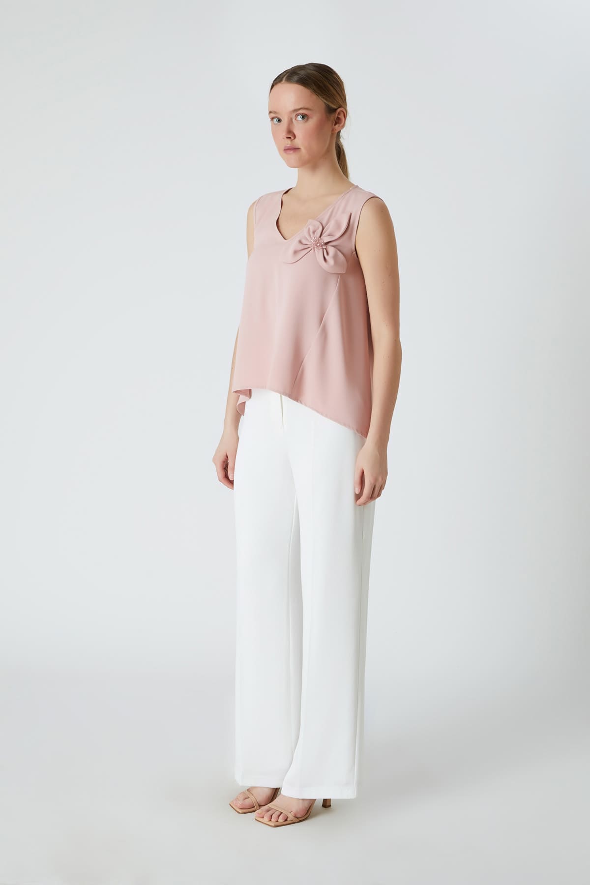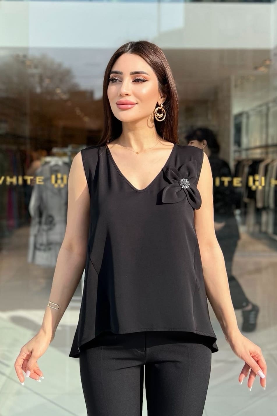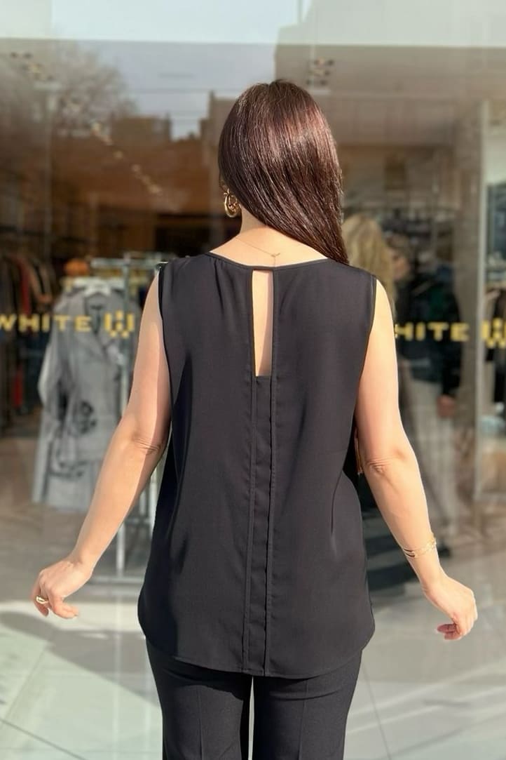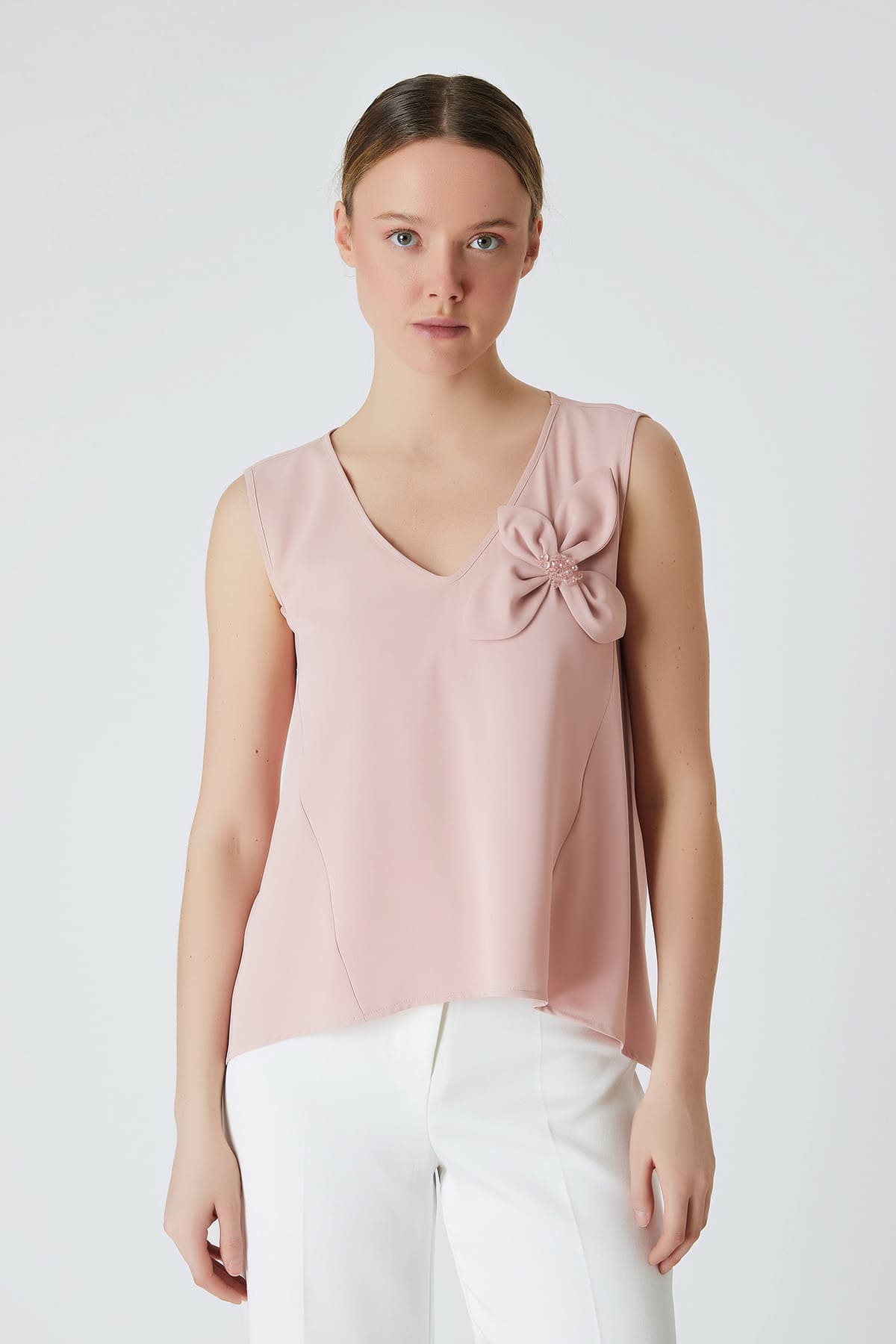 ÜRÜN BİLGİSİ:Dökümlü kumaş,v yakalı,kolsuz,tek tarafı taş detaylı ve çicekli,ön ve arka etek ucu asimetrik,arka yakası,pencereli,rahat form şık bluz.