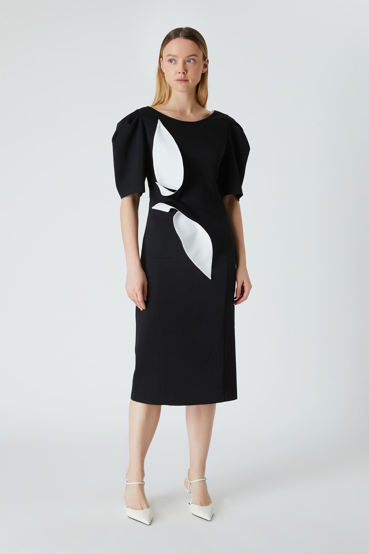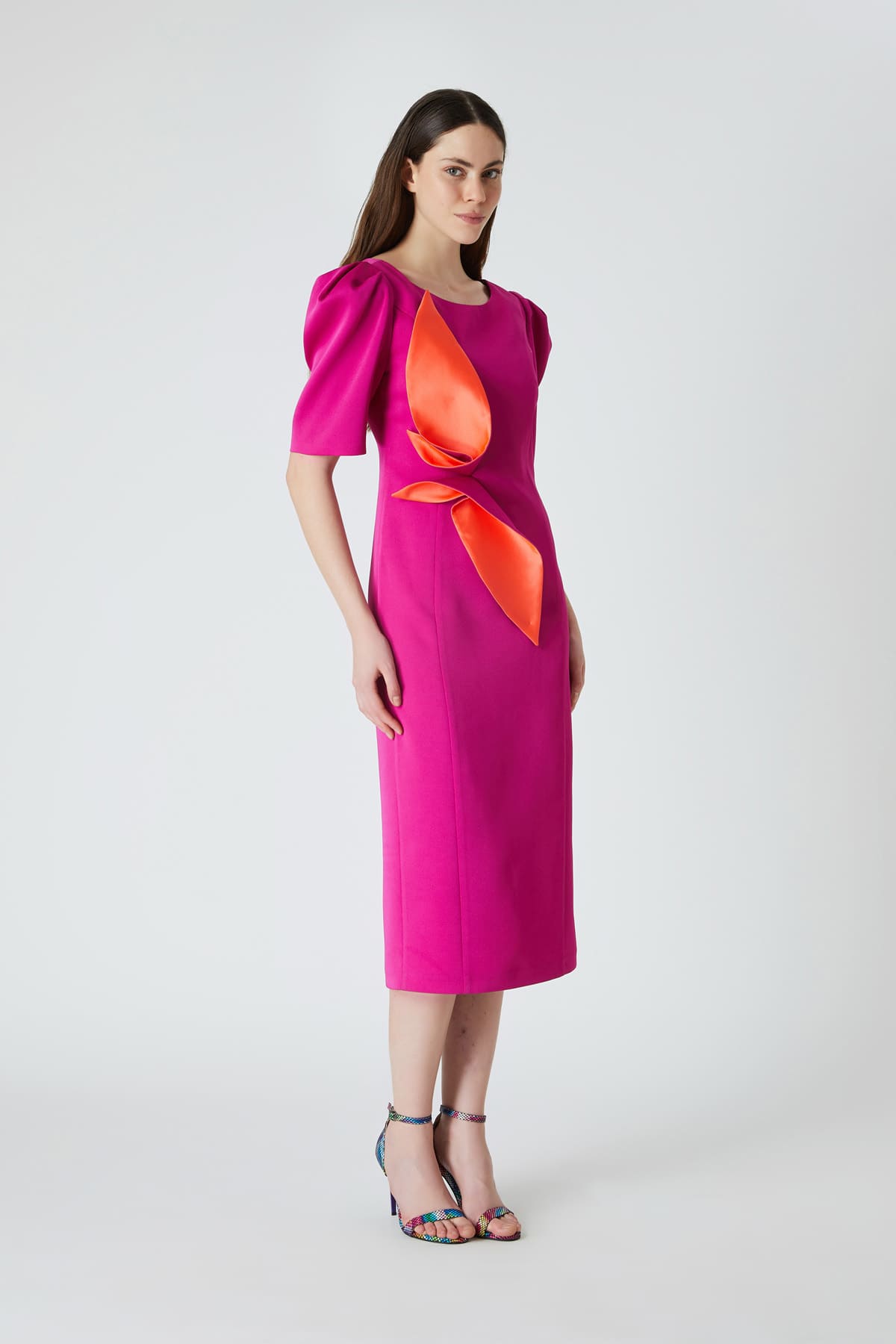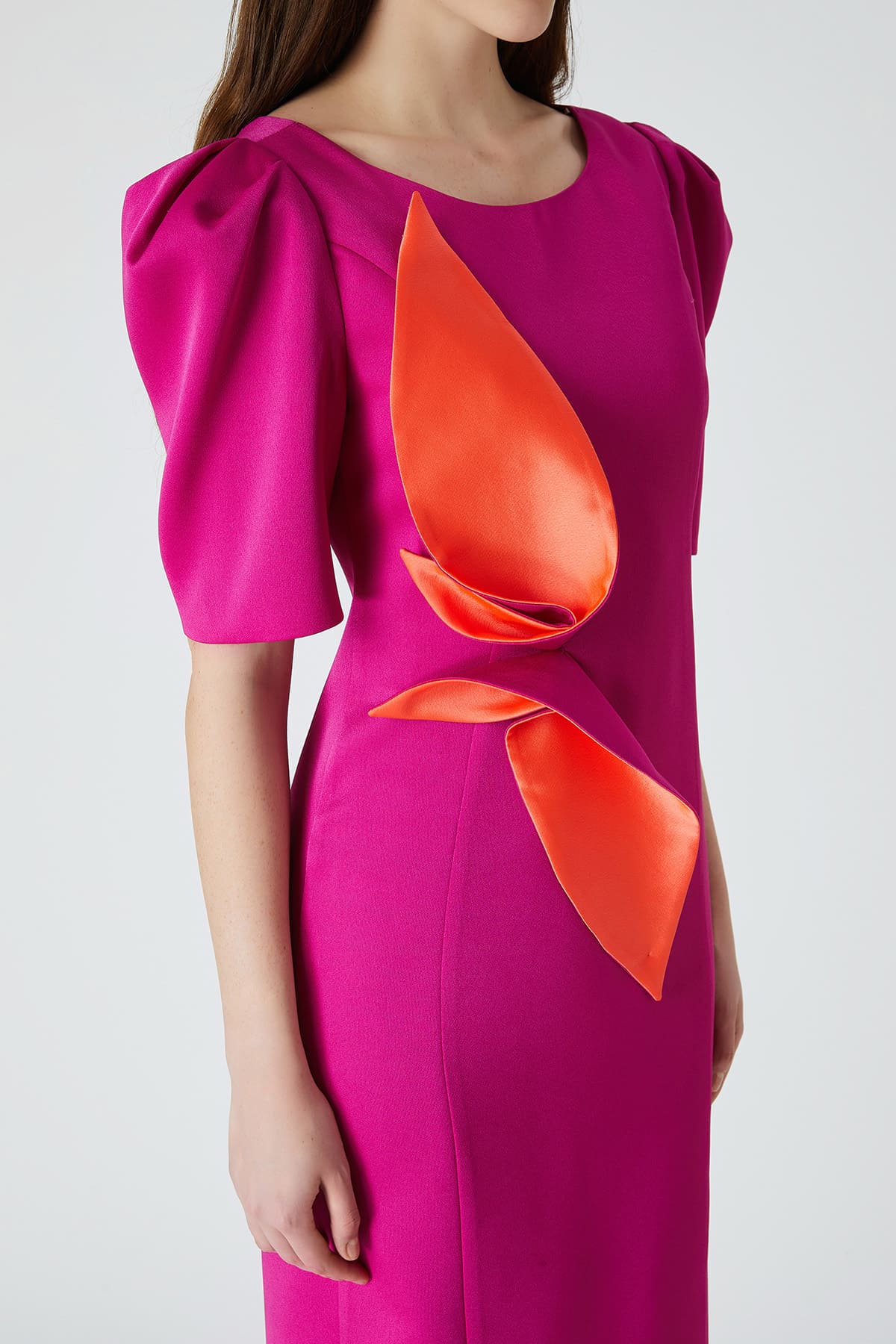 ÜRÜN BİLGİSİ:Parlak yüzeyli krep kumaş,yuvarlak yakalı,yarım kollu,ön ve arkası oturan kuplu,omuzu büzgülü,arka eteği yırtmaçlı,önü çift renk geçişli çicek detaylı,fit form astarlı şık elbise.