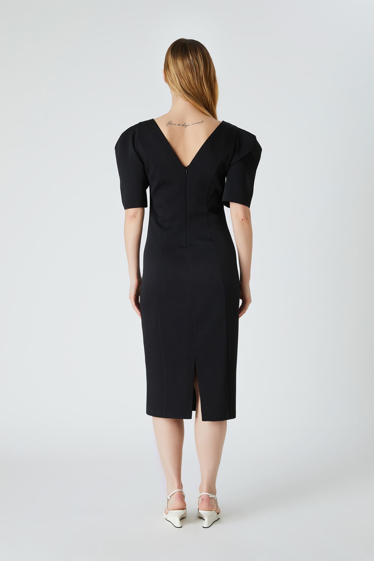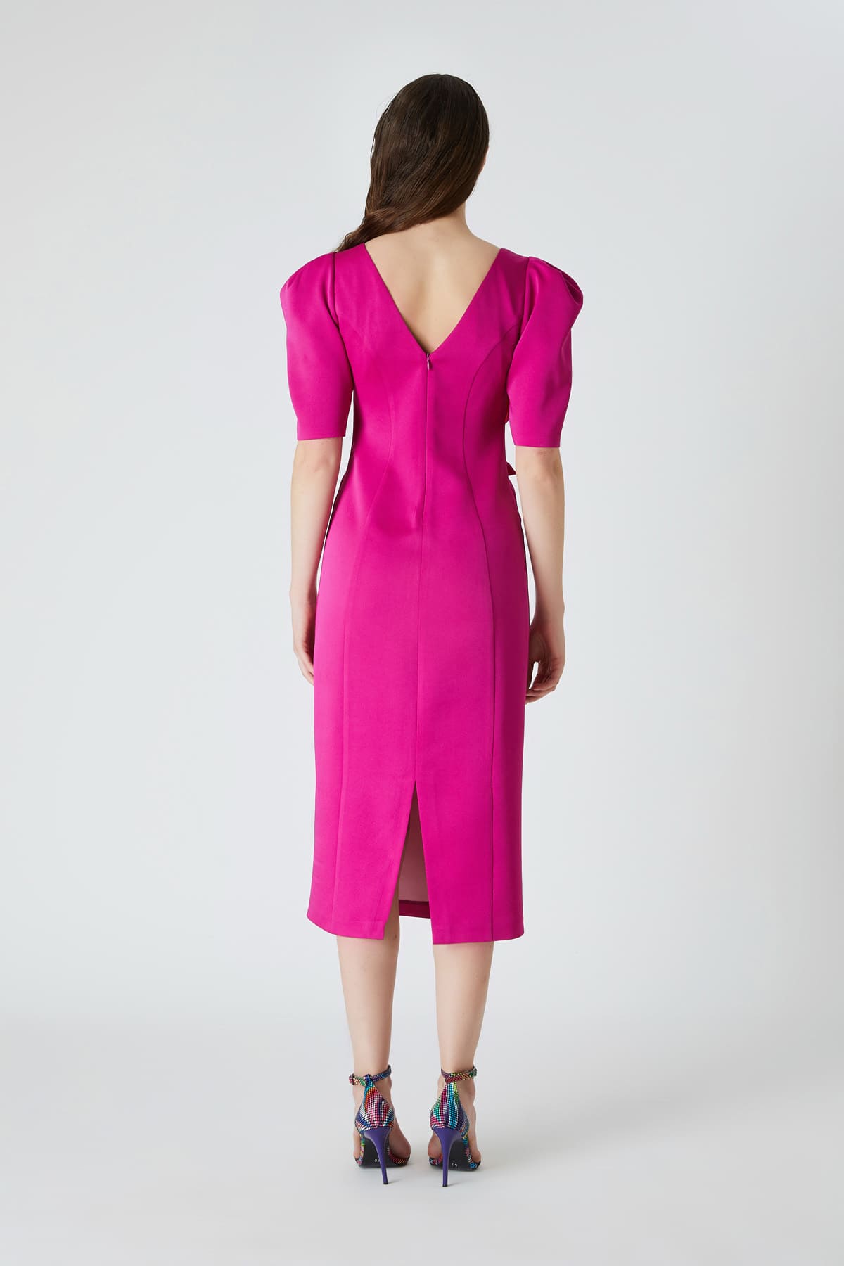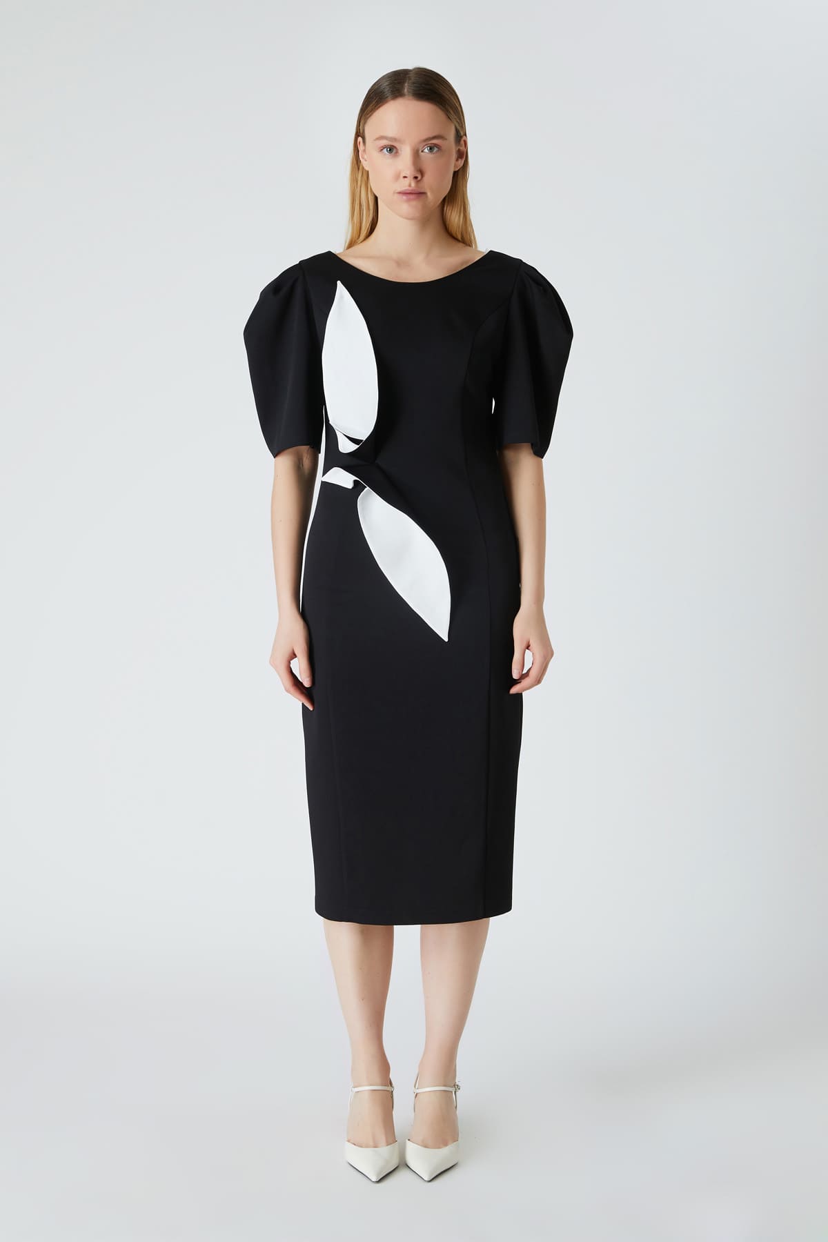 ÜRÜN BİLGİSİ:Parlak yüzeyli krep kumaş,yuvarlak yakalı,yarım kollu,ön ve arkası oturan kuplu,omuzu büzgülü,arka eteği yırtmaçlı,önü çift renk geçişli çicek detaylı,fit form astarlı şık elbise.
