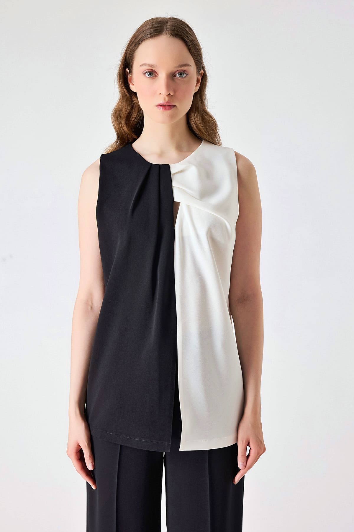 ÜRÜN BİLGİSİ:Hafif dökümlü çift renk kumaş,yuvarlak yakalı,önü pile ve pencere detaylı,kısa kollu,yırtmaçlı,düz form şık bluz.