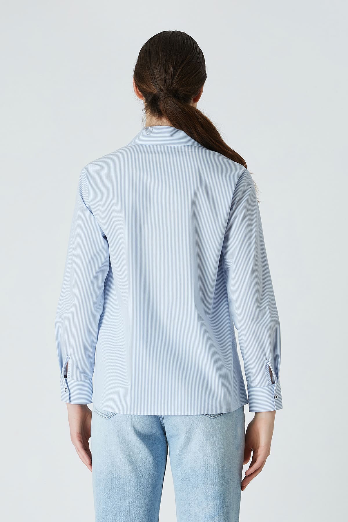 ÜRÜN BİLGİSİ:Pamuk karışımlı çizgili kumaş,düğme kapamalı,robası kesikli,biye saçaklı,düz form zamansız gömlek.