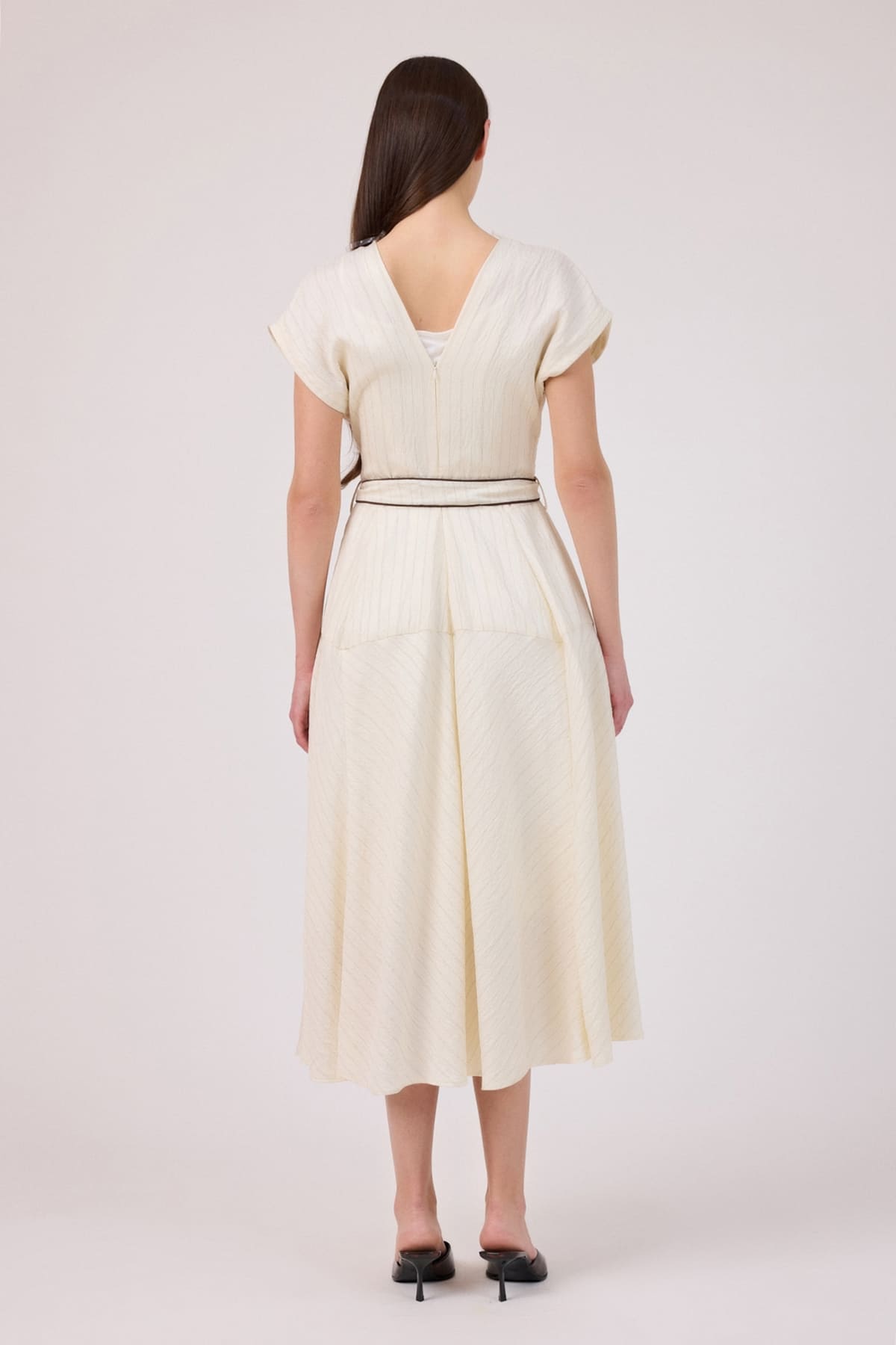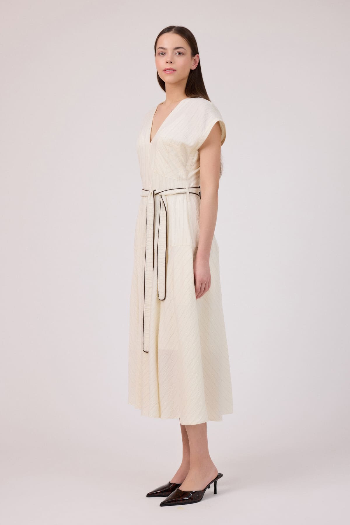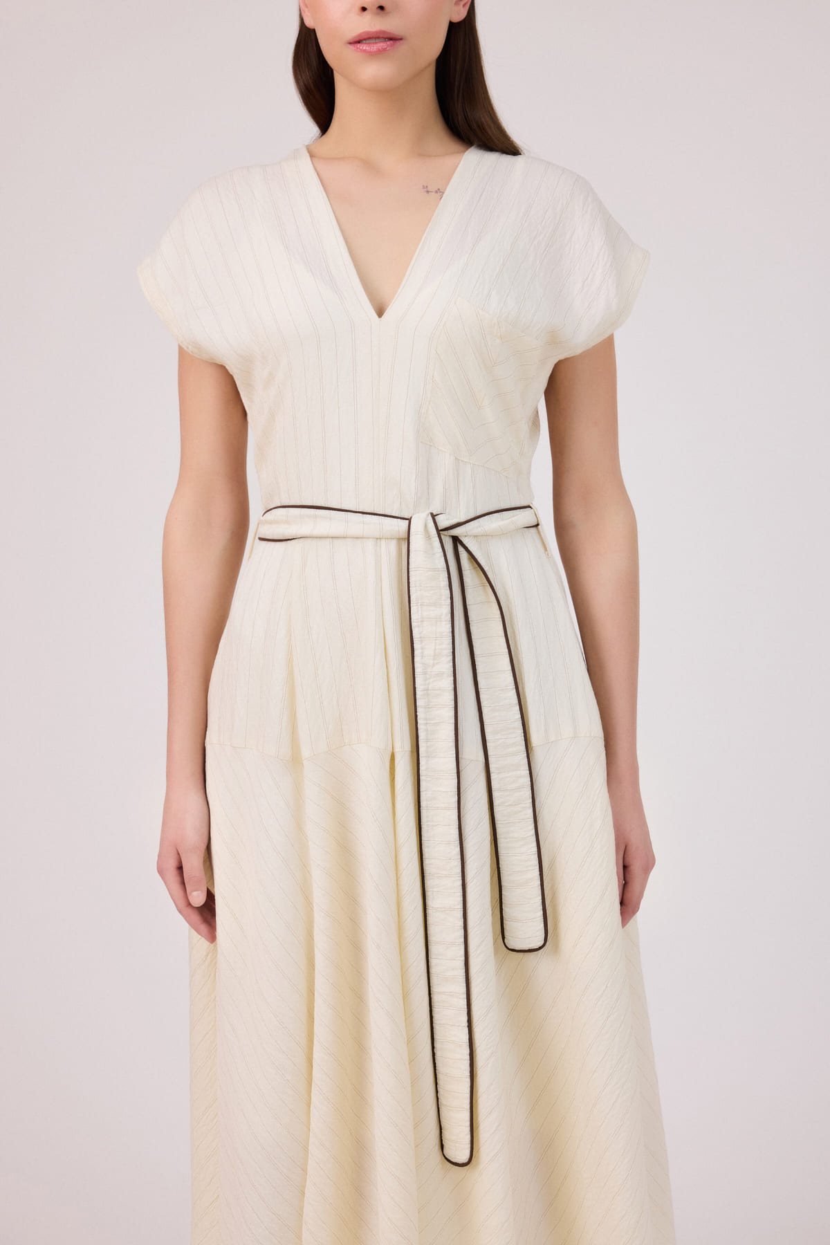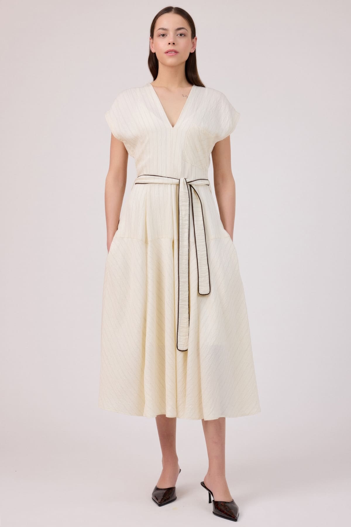 ÜRÜN BİLGİSİ:Doğal viskon iplikli kumaş,kontrast renkte ince çizgili,düşükomuzlu,teküst cepli,eteği kuplu,beli kumaş bağcıklı ve ince biyeli astarlı midi elbise