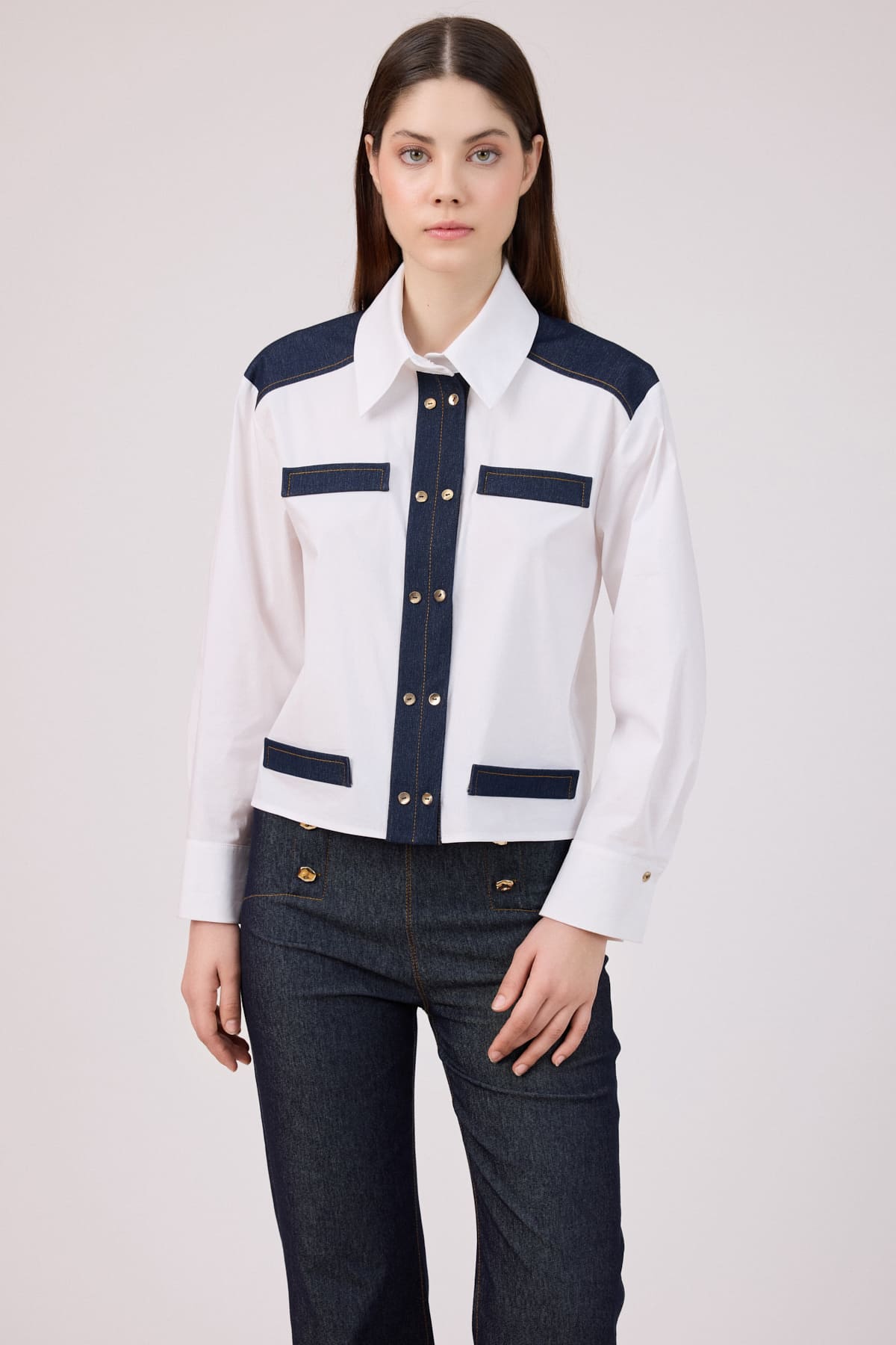 ÜRÜN BİLGİSİ:Yumuşak dokulu poplin kumaş,konrast renkte denim kumaştan pat,roba ve süs fileto cepli,manşetli gömlek