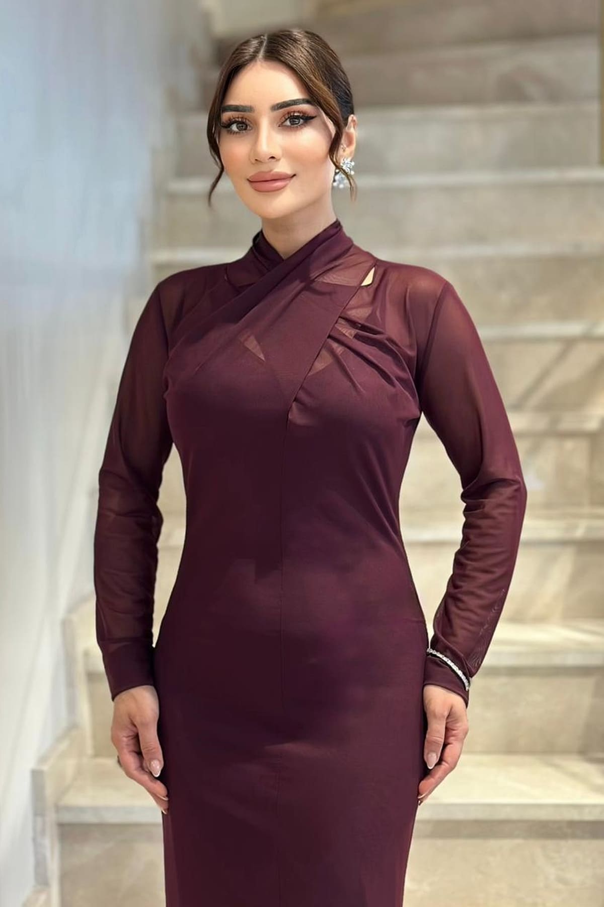 ÜRÜN BİLGİSİ:Esnek dokulu tül kumaş,yakası karşılıklı drapeli,uzun kollu,astarlı tül elbise