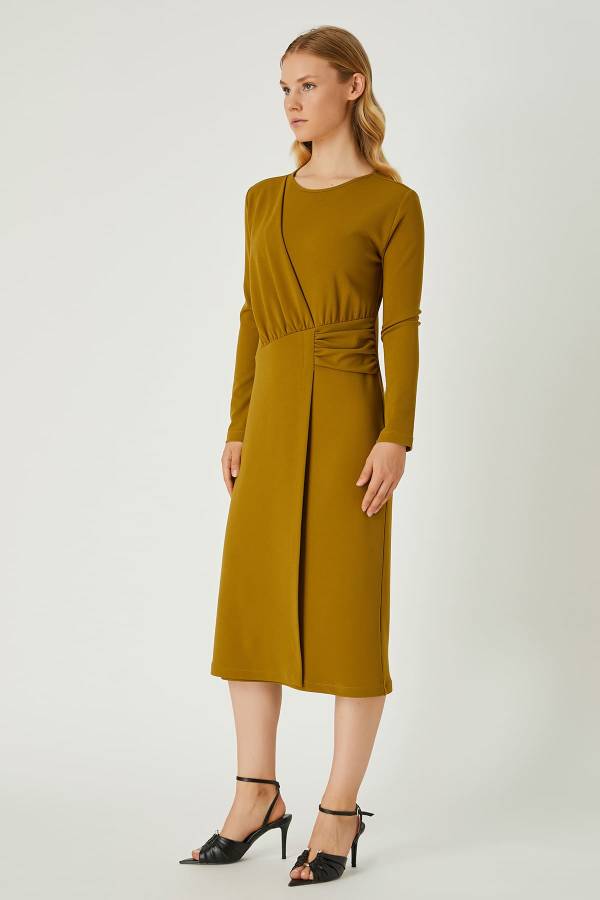 ÜRÜN BİLGİSİ:Esnek dokulu krep yüzeyli örme kumaş,önü asimetrik drapeli,eteği üst parçalı,astarsız elbise