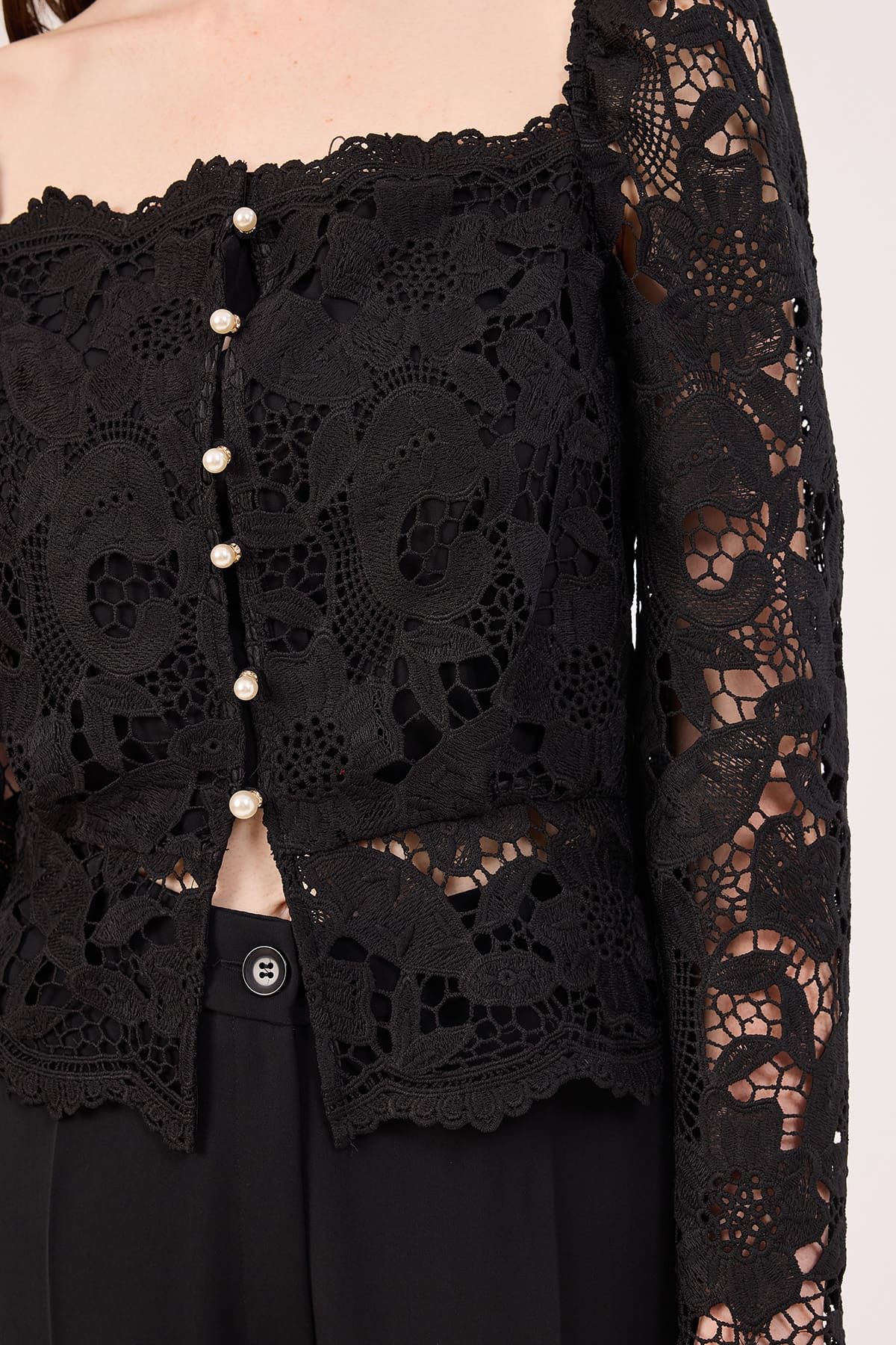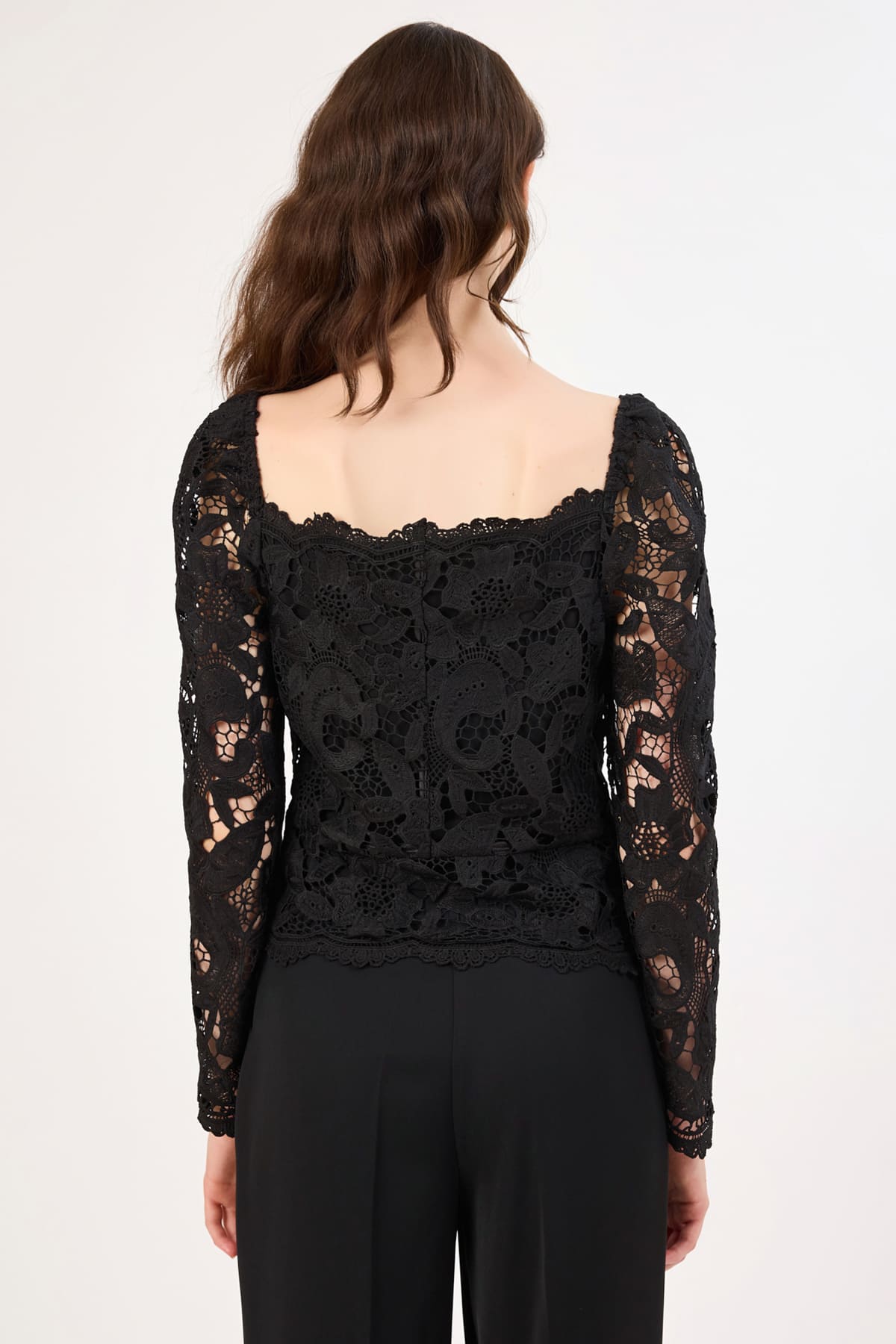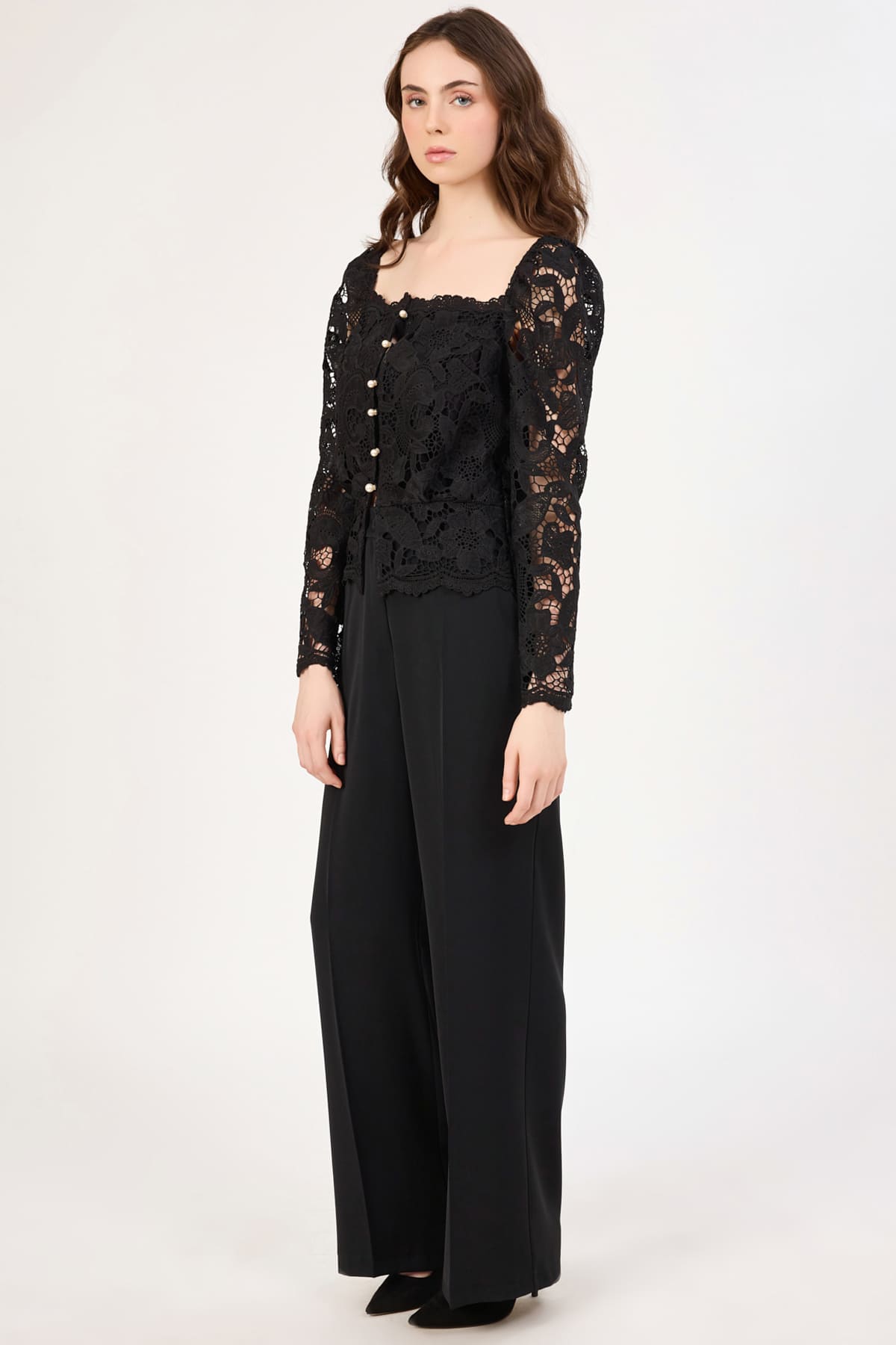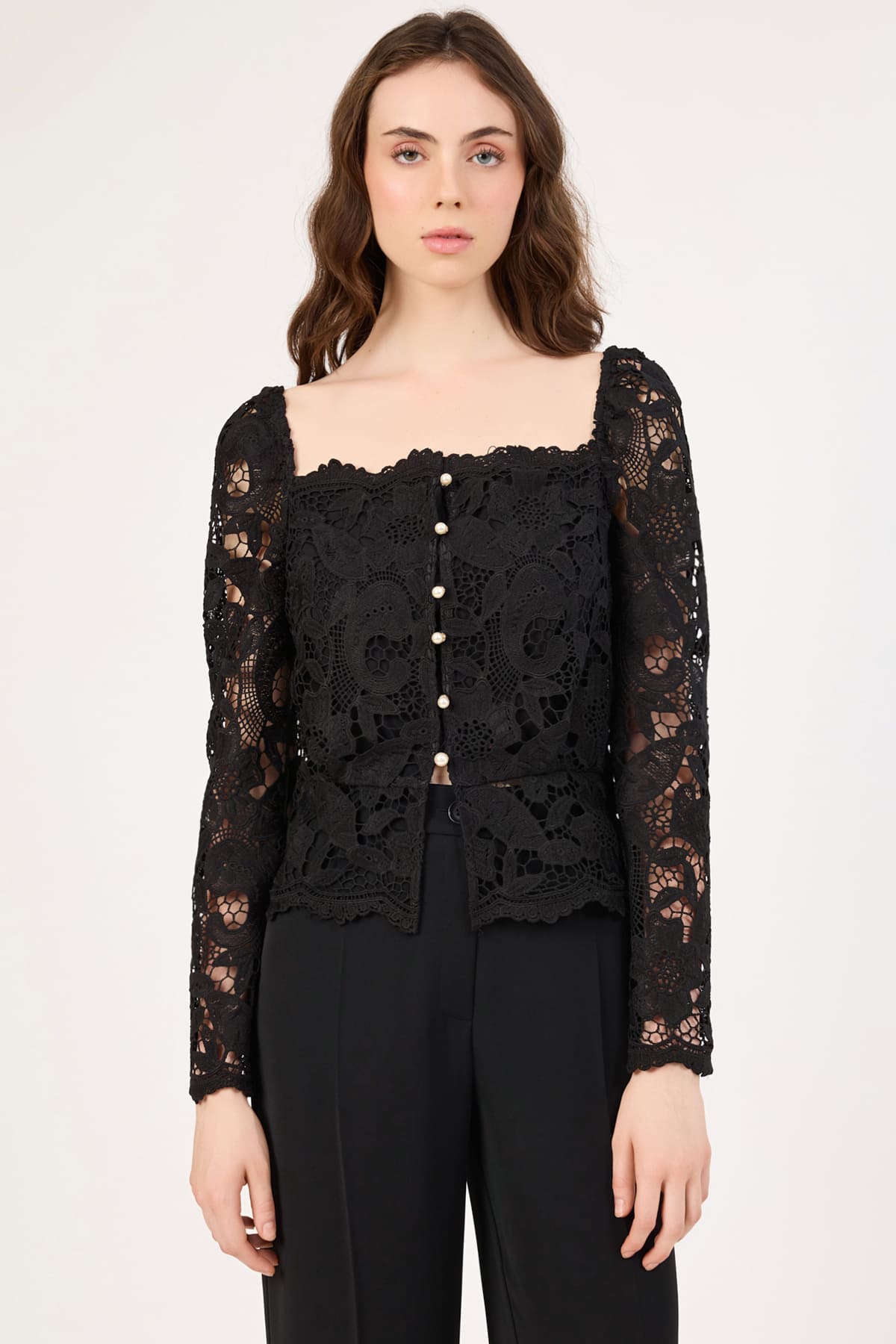 ÜRÜN BİLGİSİ:Güpür iplikli dantel dokulu kumaş,önü düğmeli,kare yakalı,uzun kollu bluz