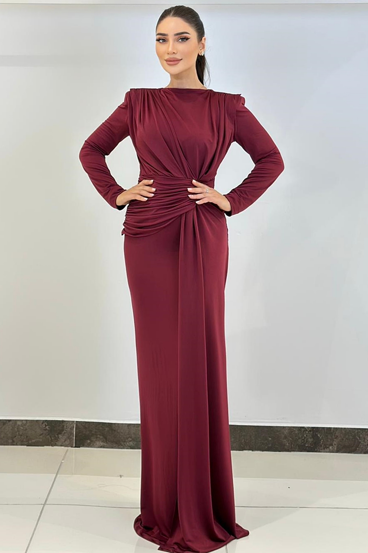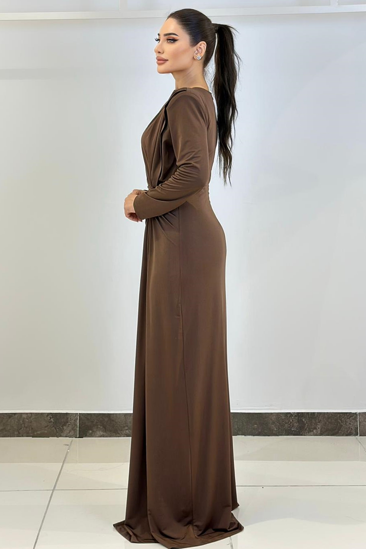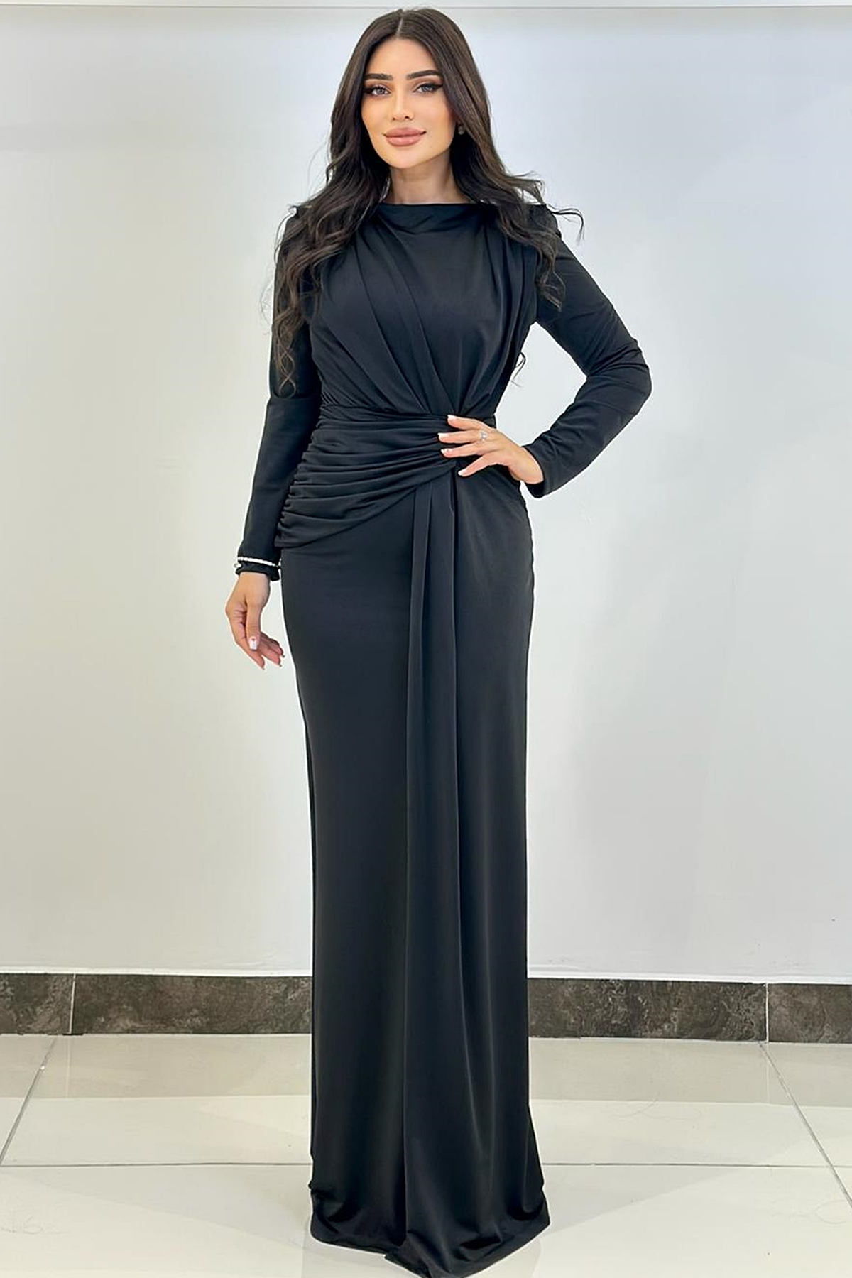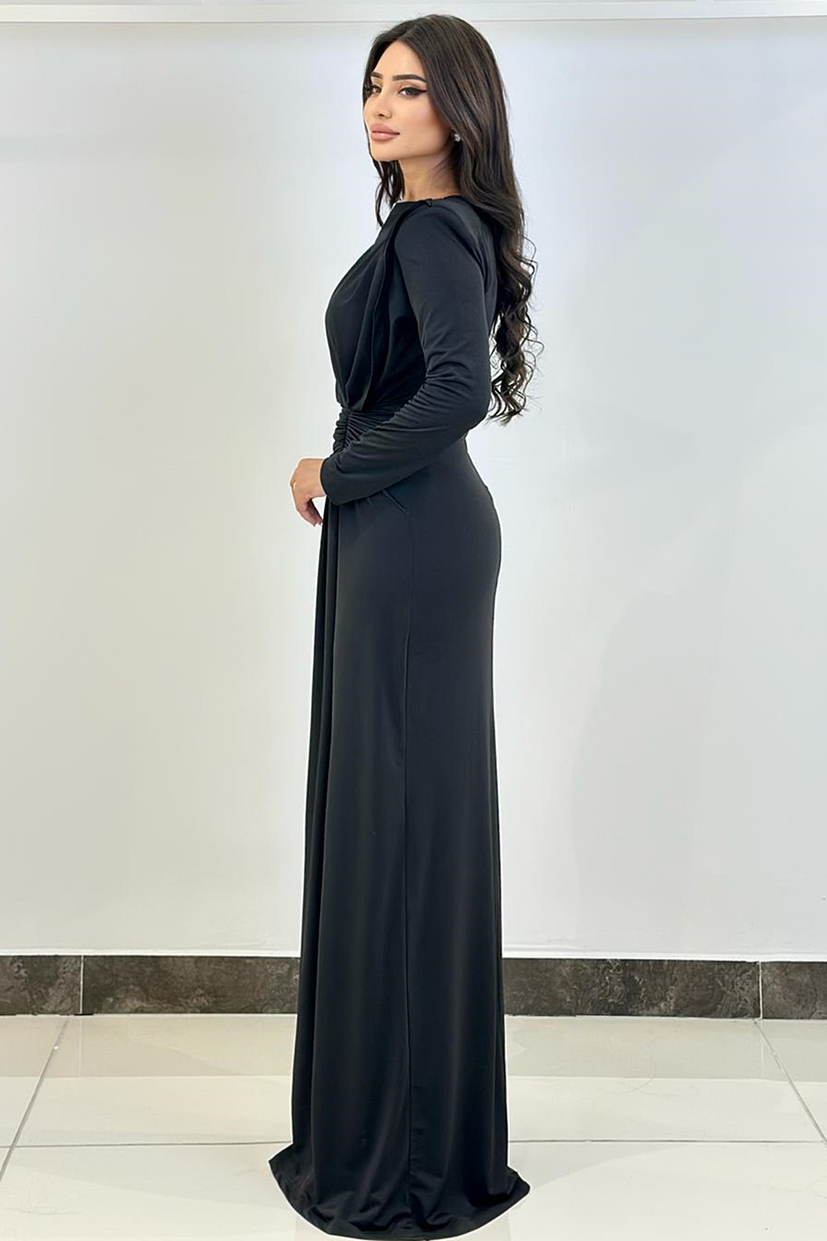 ÜRÜN BİLGİSİ:Likralı hafif dökümlü kumaş,yuvarlak ykalı,uzun kollu,fermuarlı,önü düğüm detaylı,astarlı uzun şık elbise.