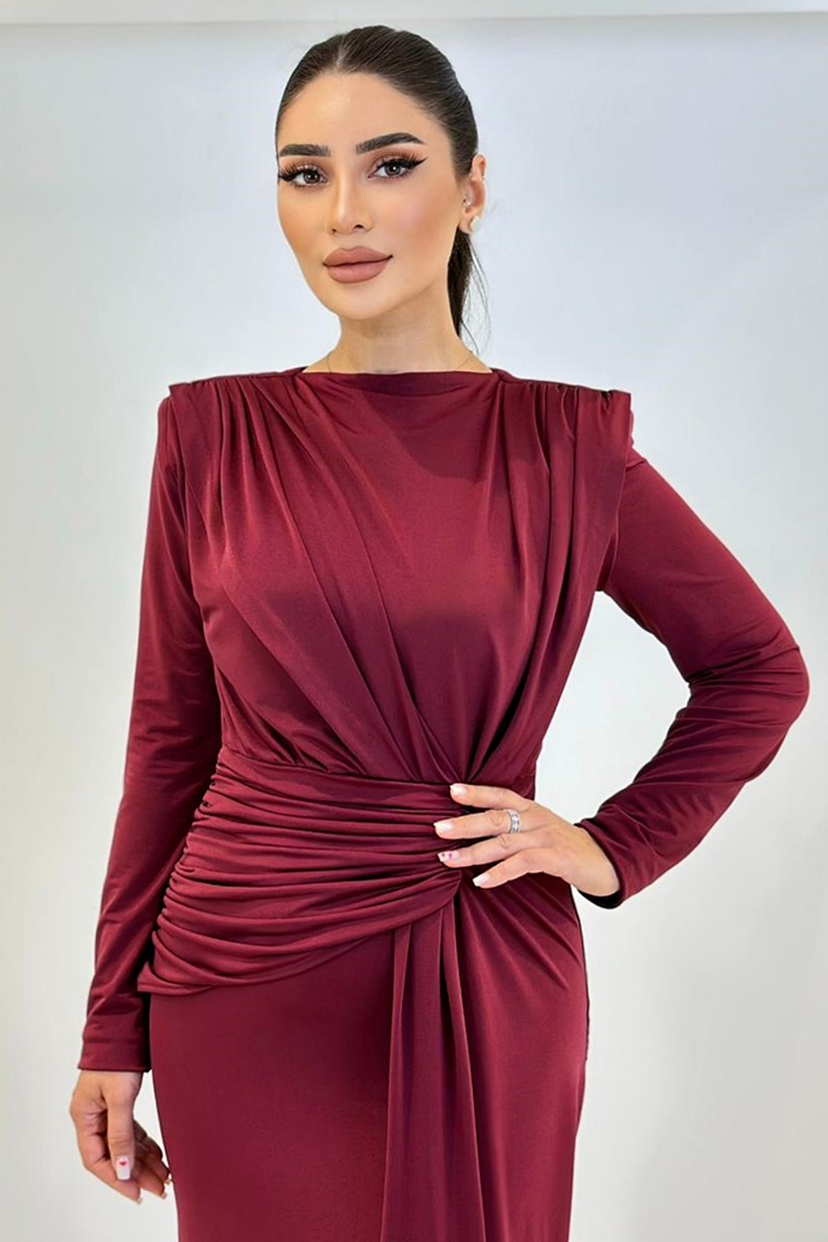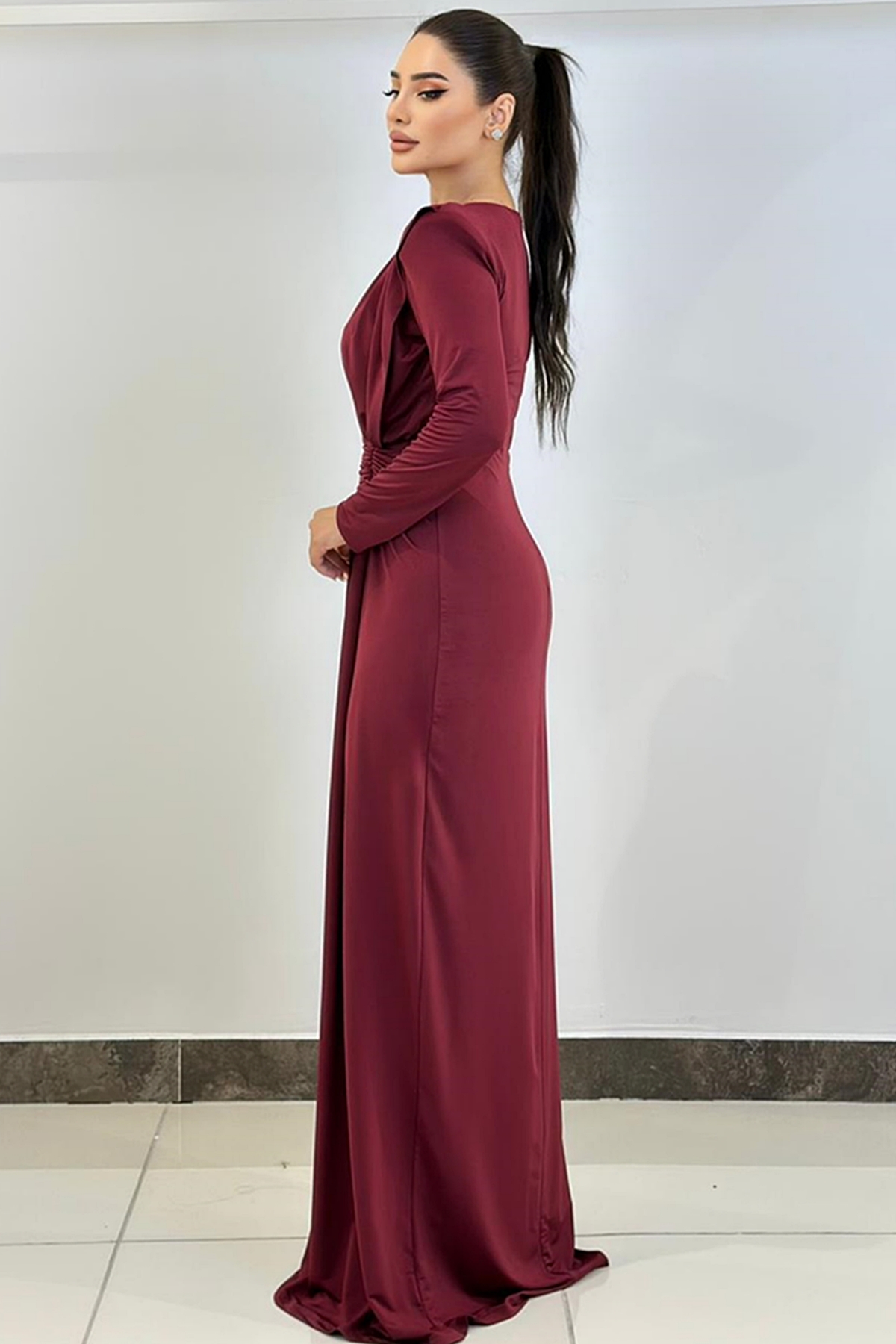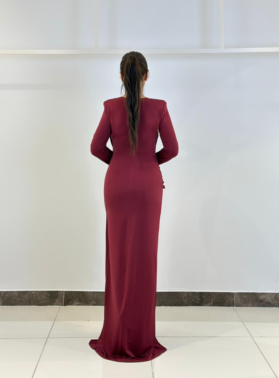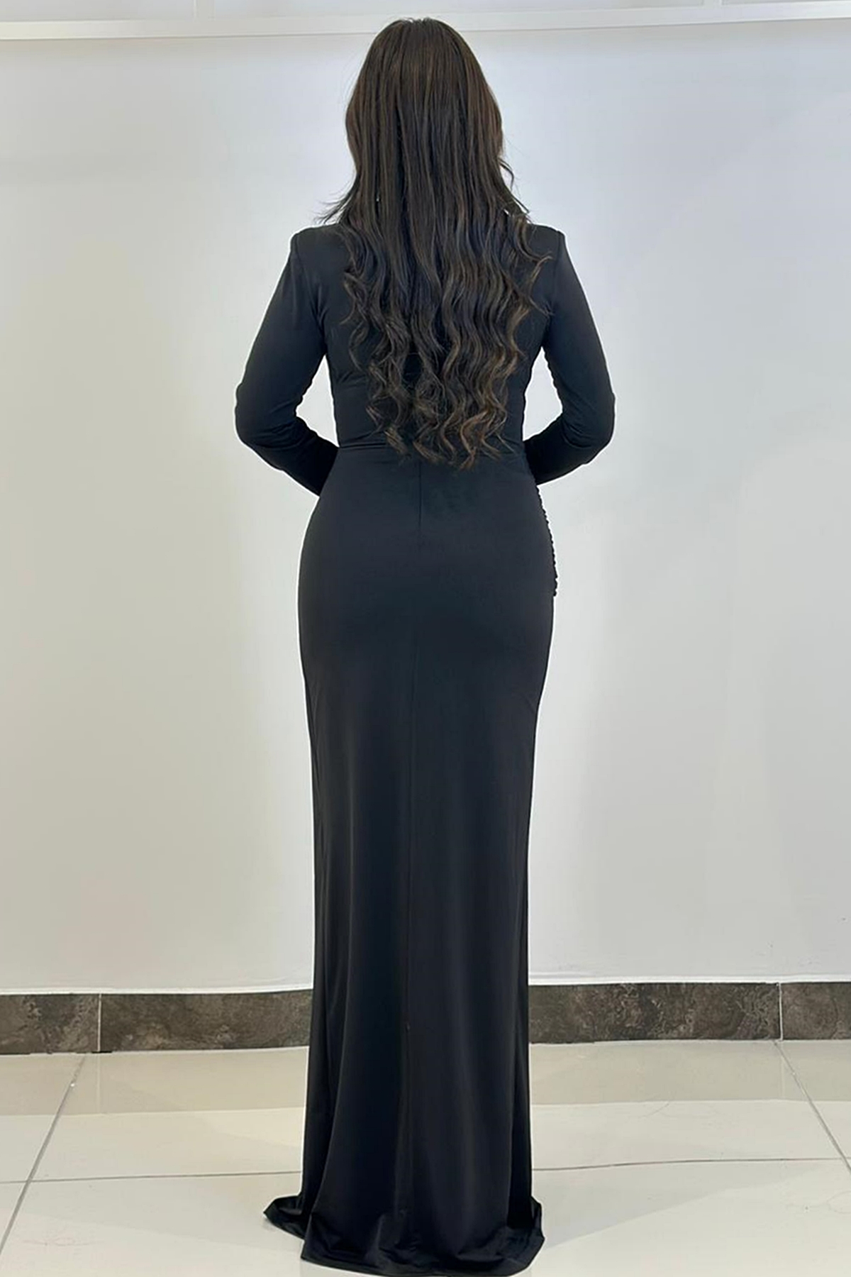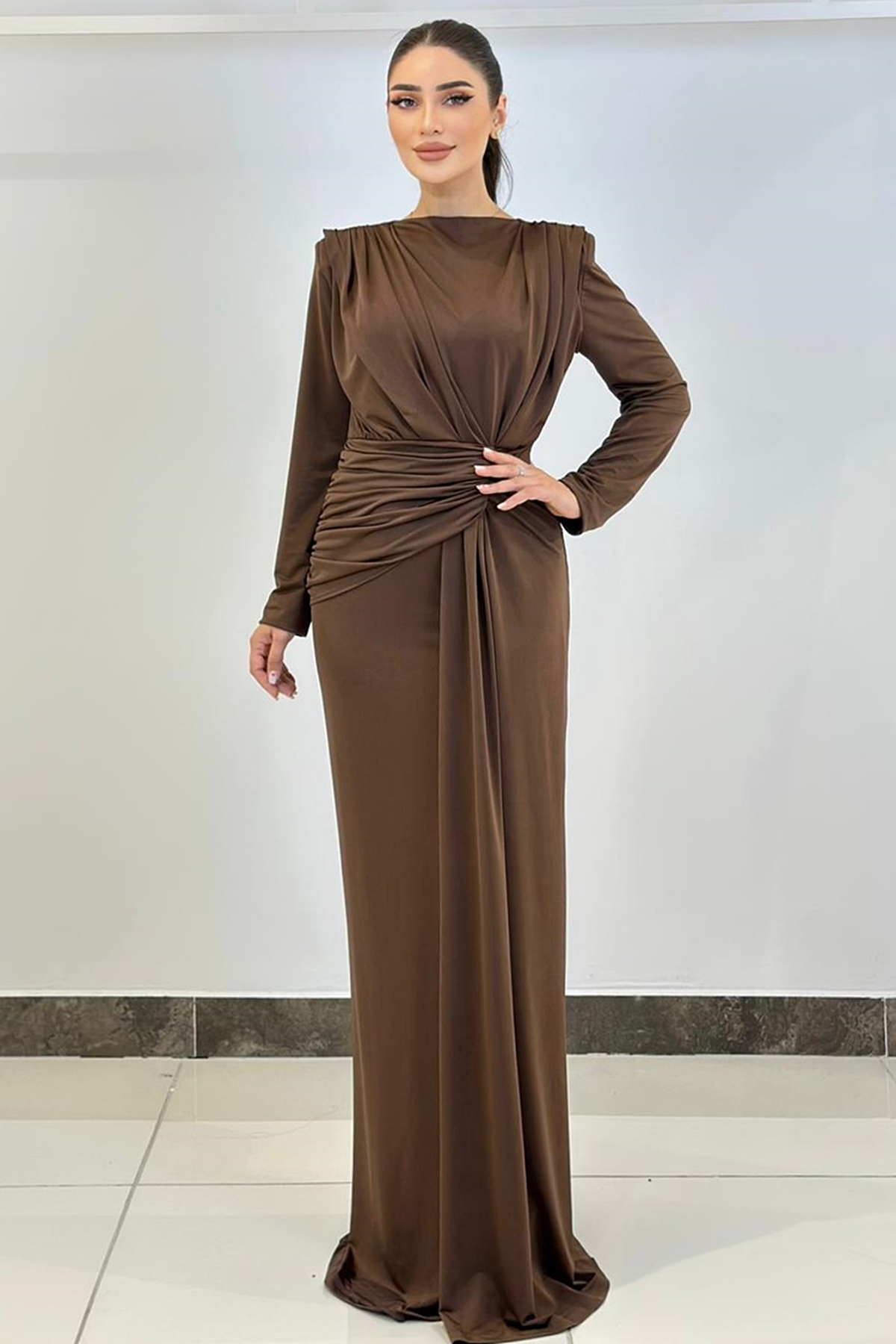 ÜRÜN BİLGİSİ:Likralı hafif dökümlü kumaş,yuvarlak ykalı,uzun kollu,fermuarlı,önü düğüm detaylı,astarlı uzun şık elbise.