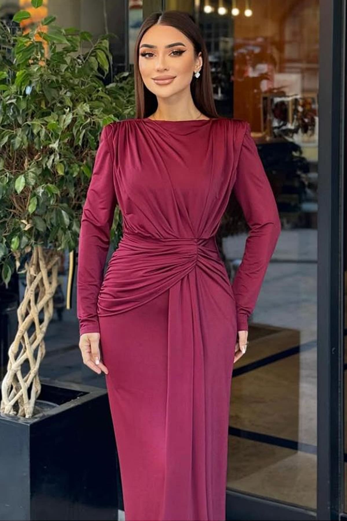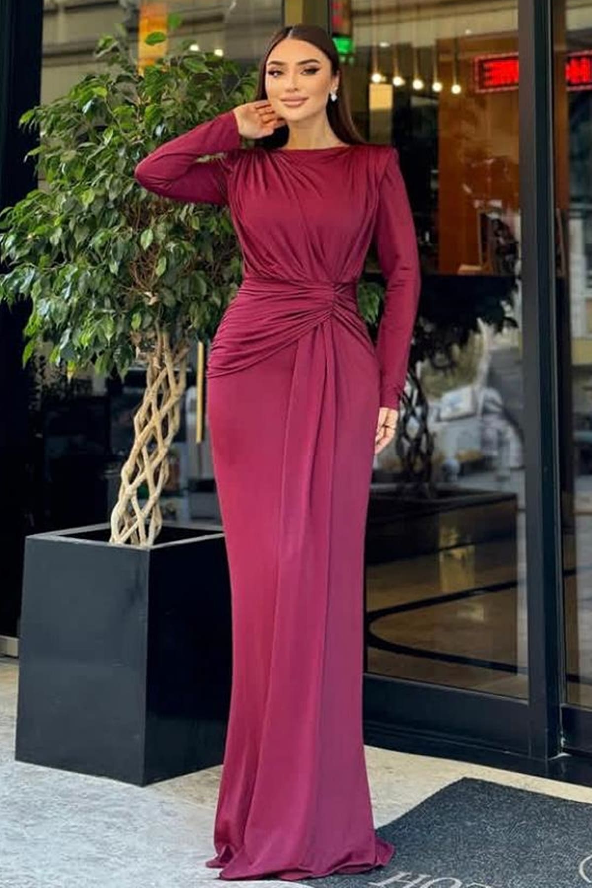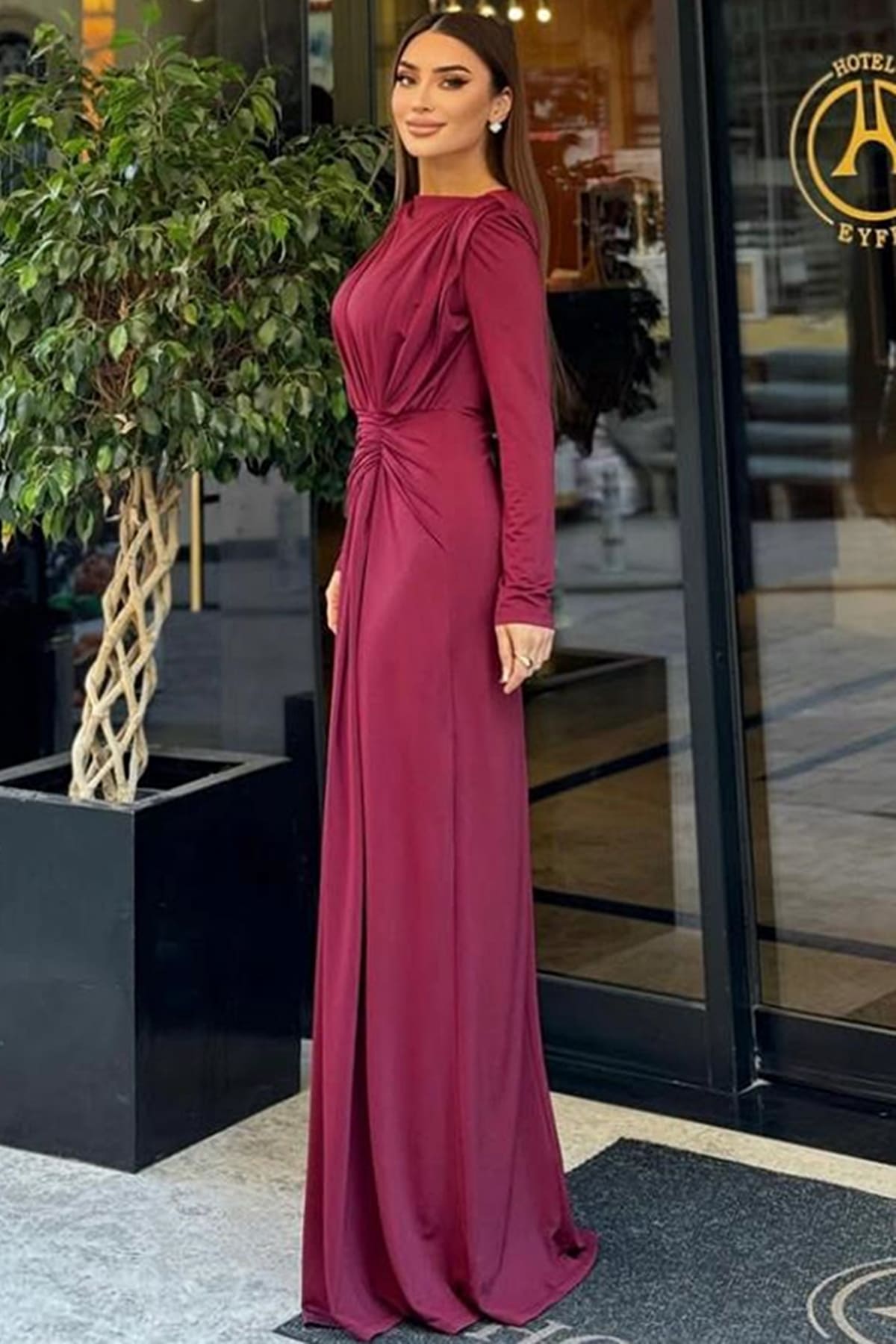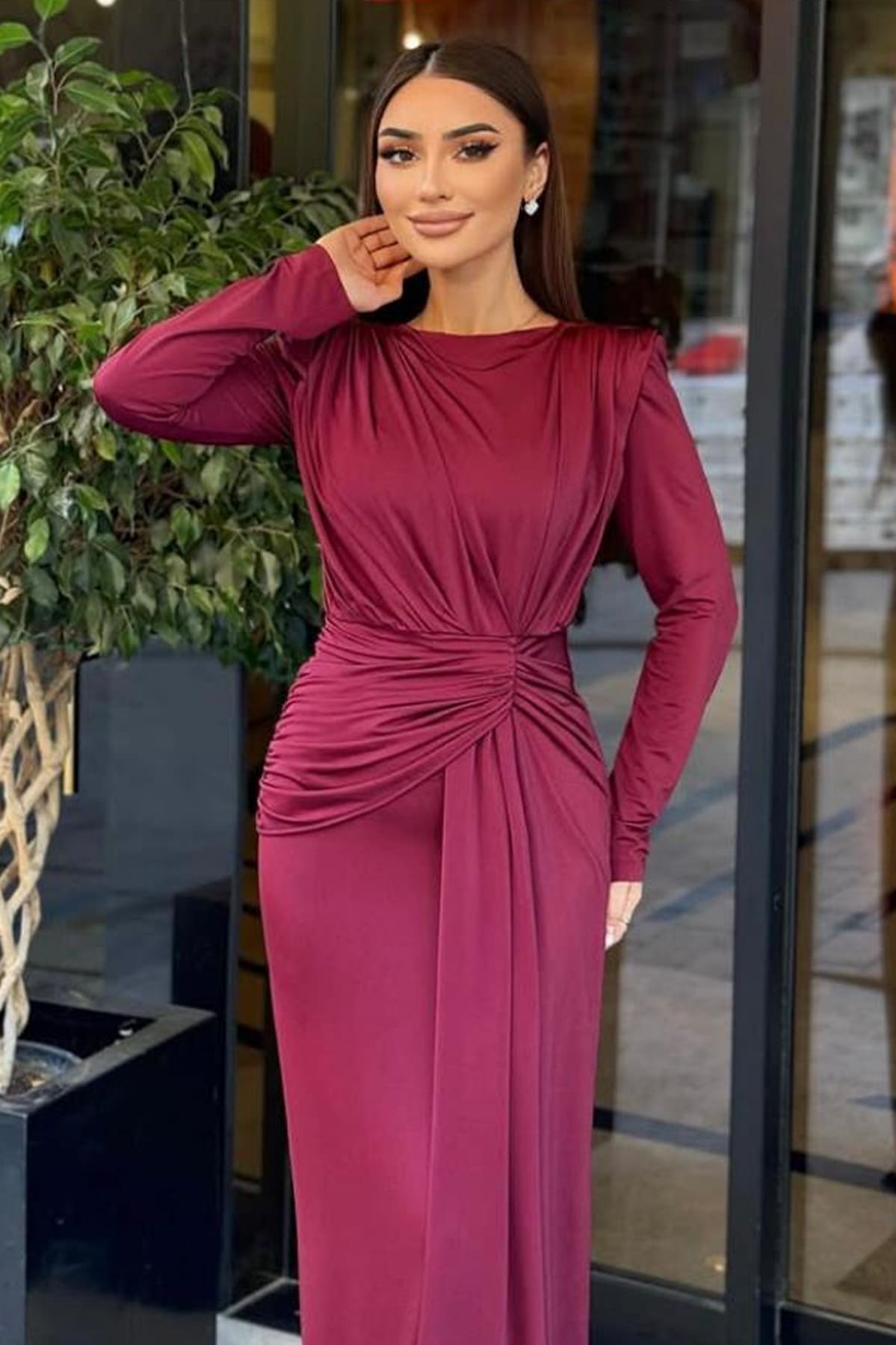 ÜRÜN BİLGİSİ:Likralı hafif dökümlü kumaş,yuvarlak ykalı,uzun kollu,fermuarlı,önü düğüm detaylı,astarlı uzun şık elbise.