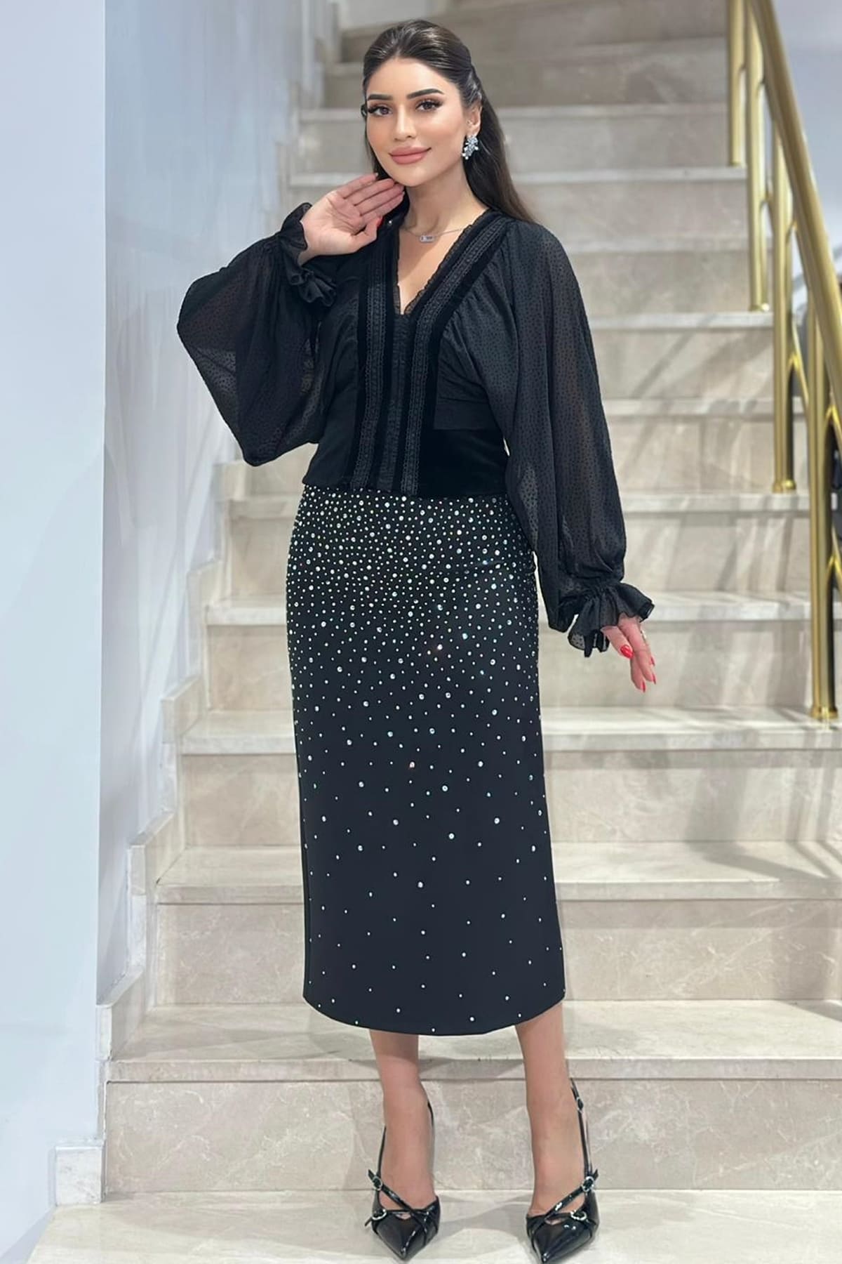 ÜRÜN BİLGİSİ:Krinkıl yüzeyli flok puan baskılı şifon kumaş,yakası ince fırfırlı,korsajı kadife kumaş geçişli,kolları lastikli uzun kollu bluz