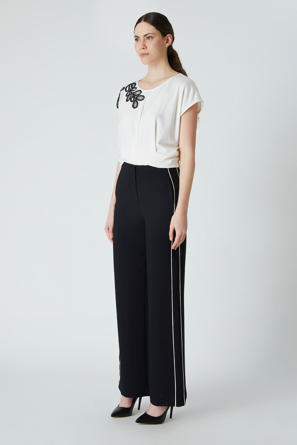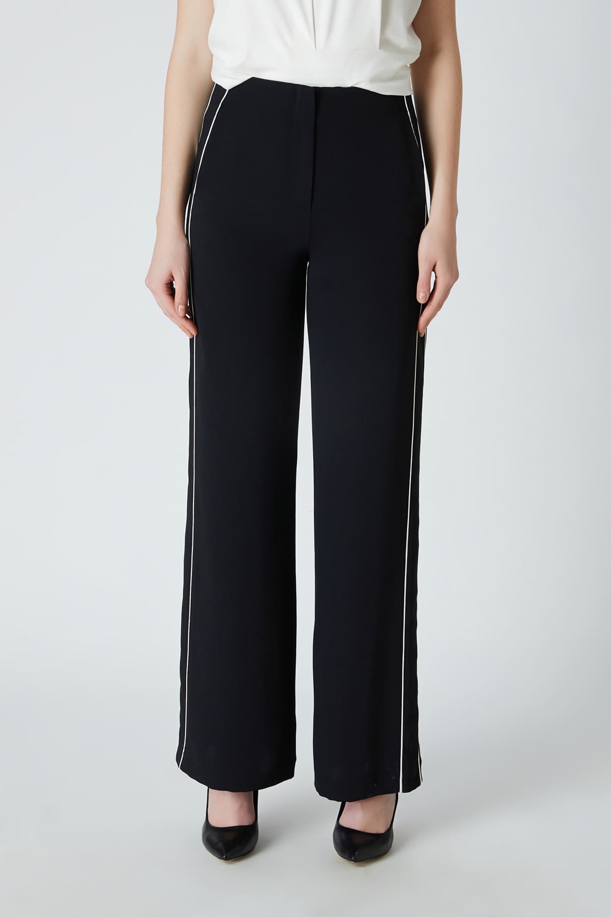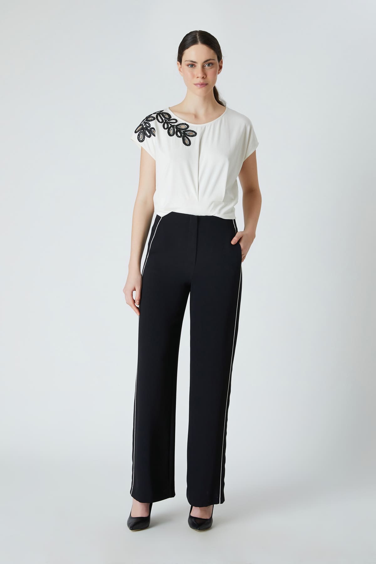 ÜRÜN BİLGİSİ:Dökümlü kumaş,yan cepli,yanı garnili,hafif geniş paça pantolon.