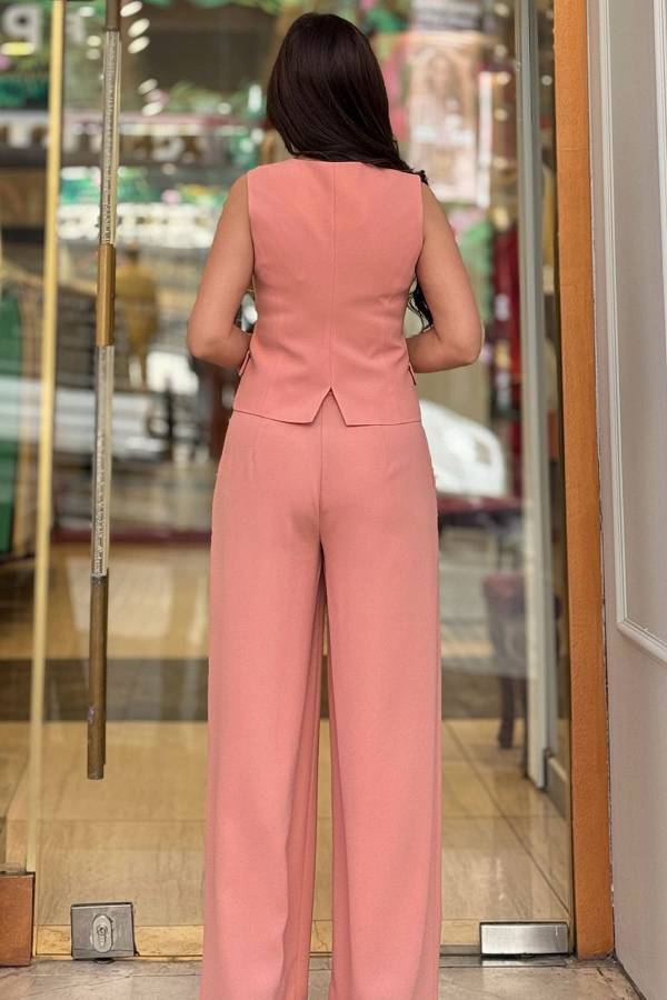 ÜRÜN BİLGİSİ:Dökümlü krep kumaş,geniş kemerli,süs düğmeli,geniş paçalı pantolon.