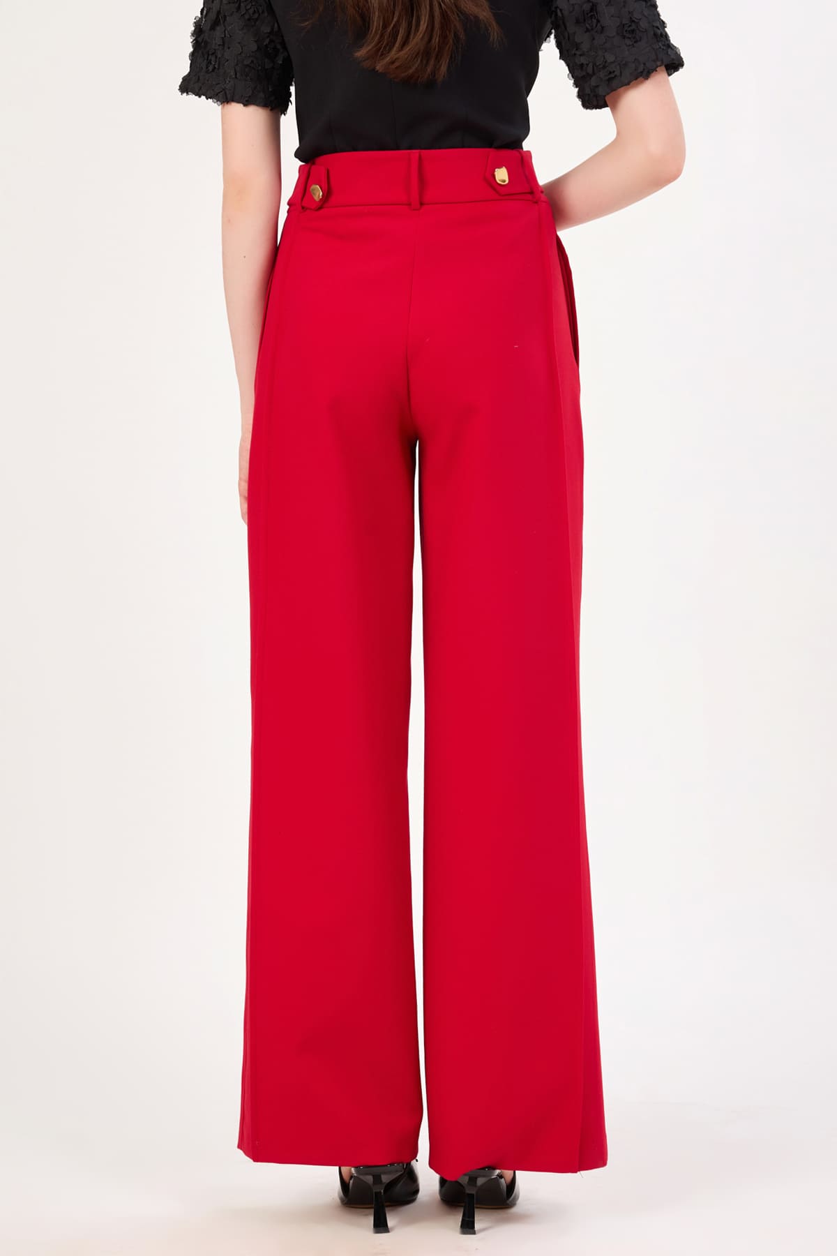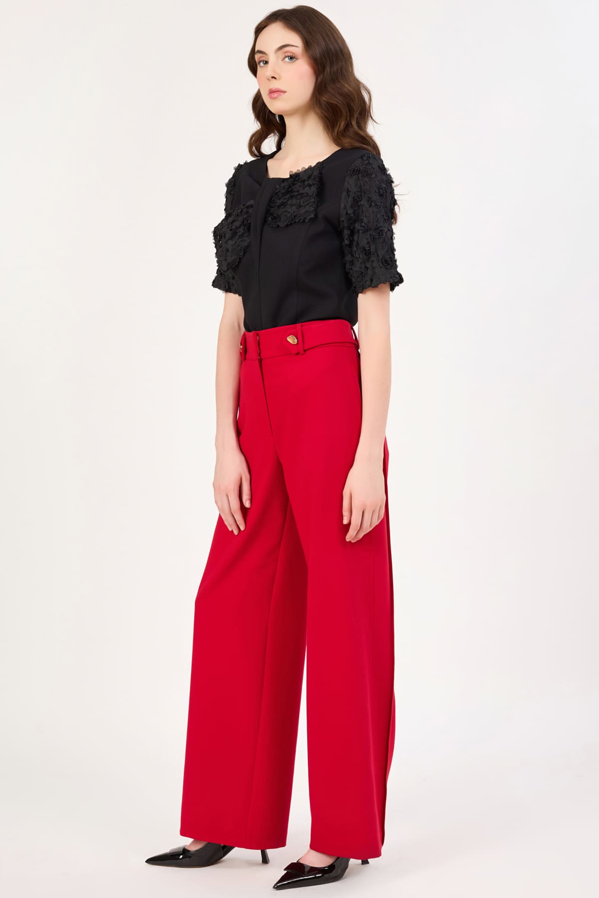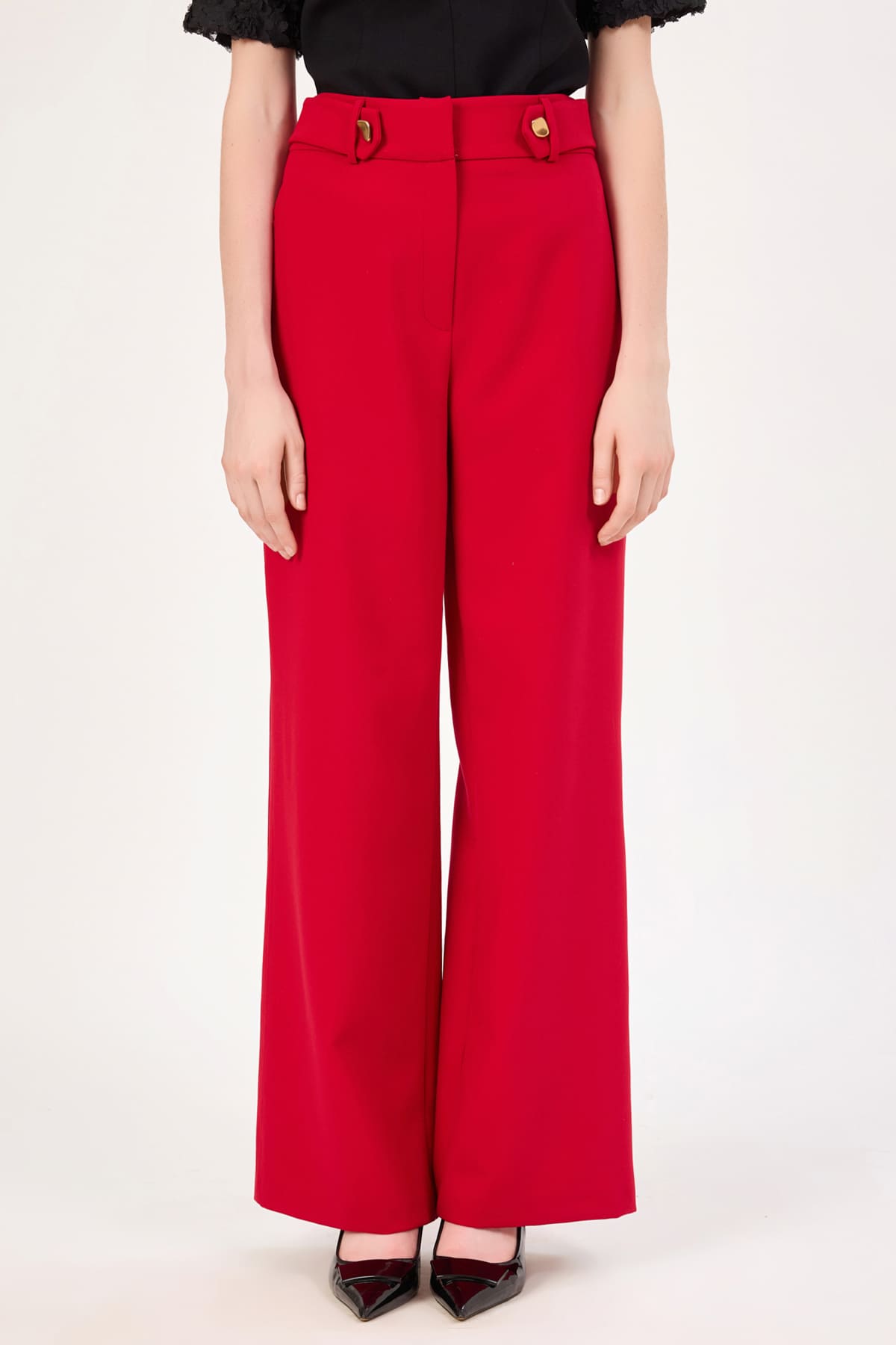 ÜRÜN BİLGİSİ:Viskon içerikli hafif likralı kumaş,normal bel,apolet detaylı, süs düğmeli,hafif geniş paça pantolon.