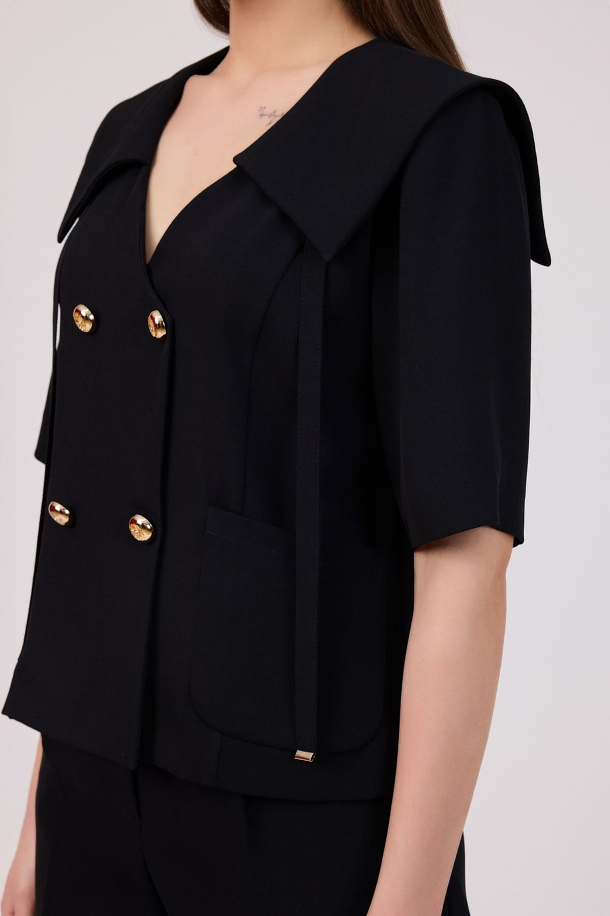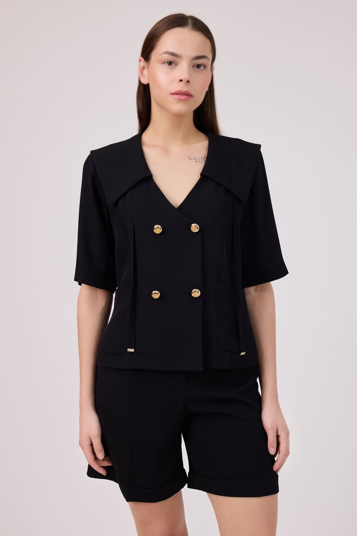 ÜRÜN BİLGİSİ:Dökümlü kumaş,geniş yakalı,hafif kruvaze düğmeli,torba cepli,yarım kollu,ceket olarak da kullanılabilir ,astarsız bluz