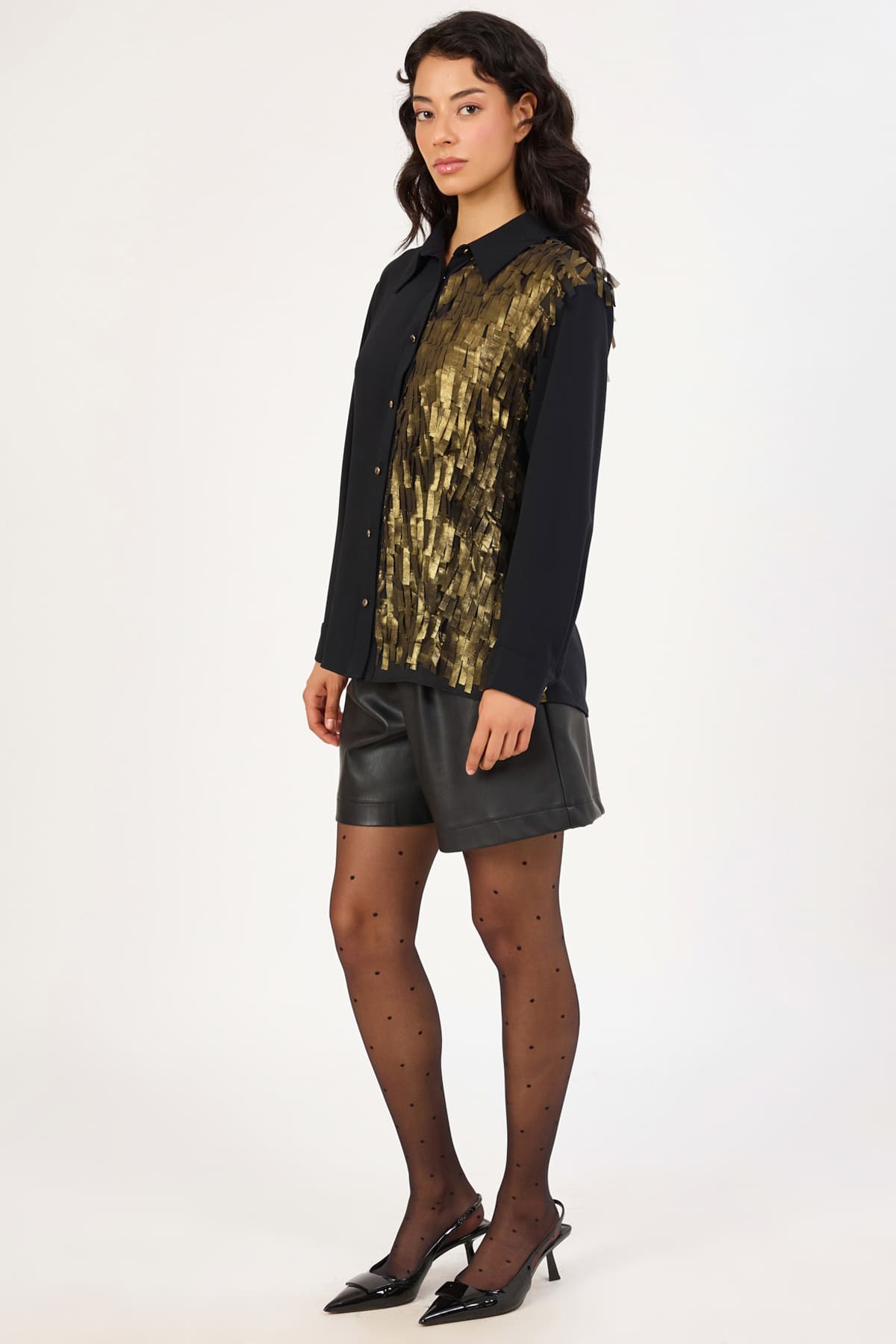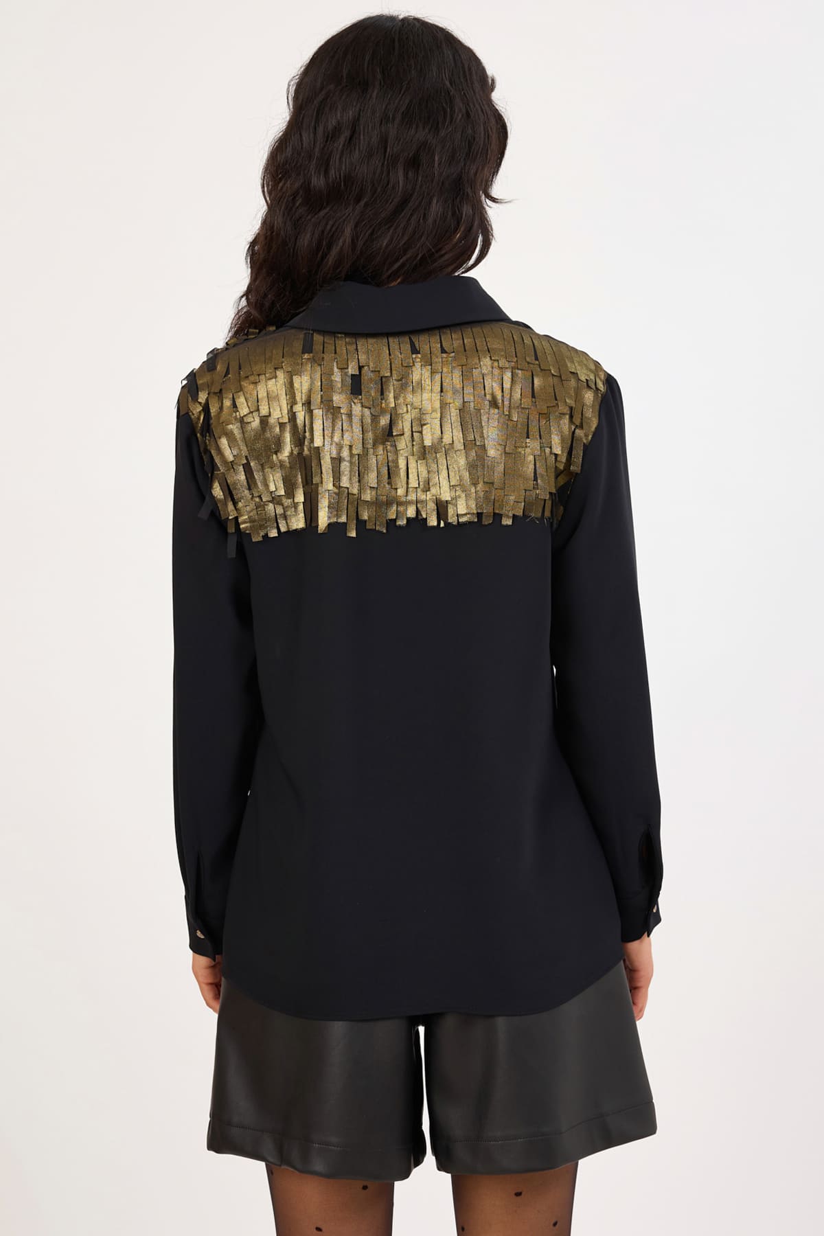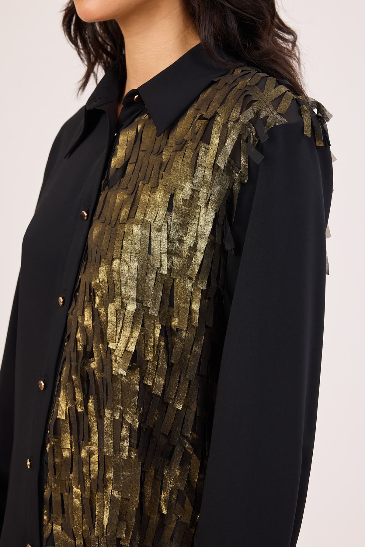 ÜRÜN BİLGİSİ:Dökümlü parlak saçak detaylı kumaş,yakalı,uzun kollu şık düz form gömlek.