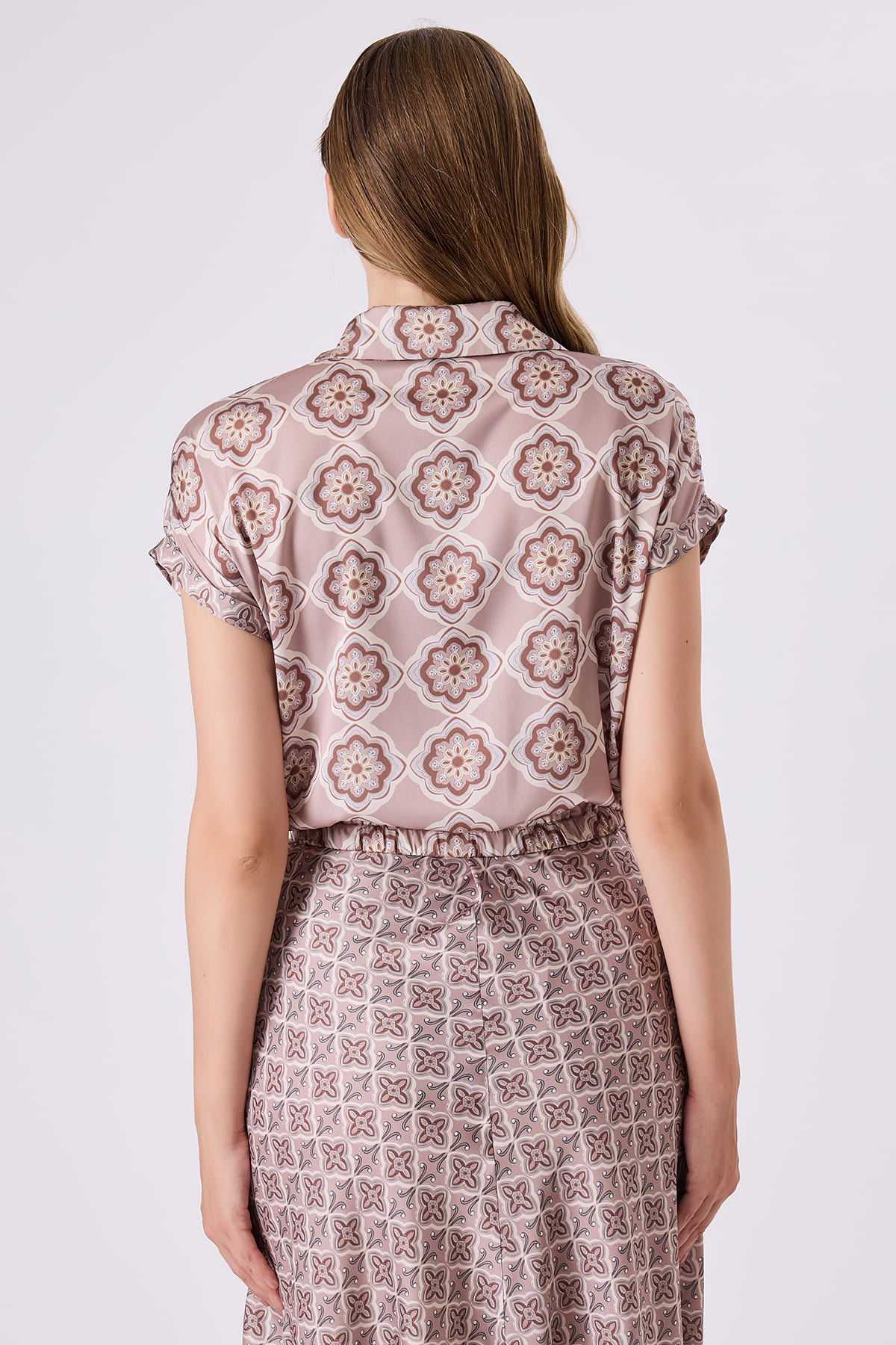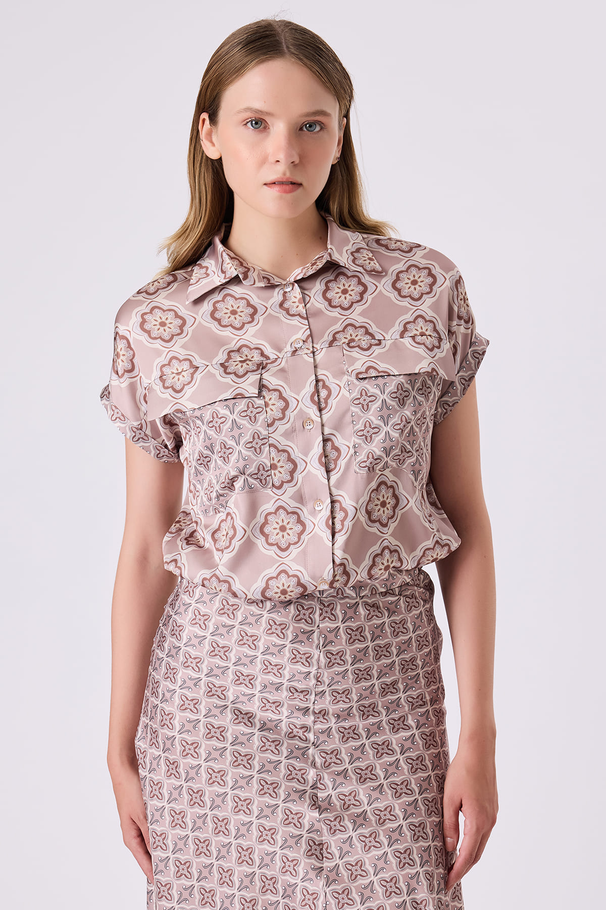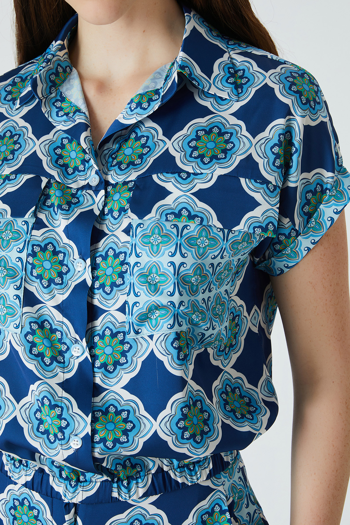 ÜRÜN BİLGİSİ:Floş içerikli desenli kumaş,gömlek yakalı,düşük kollu,düğmeli,etek ucu bant detaylı,rahat form gömlek