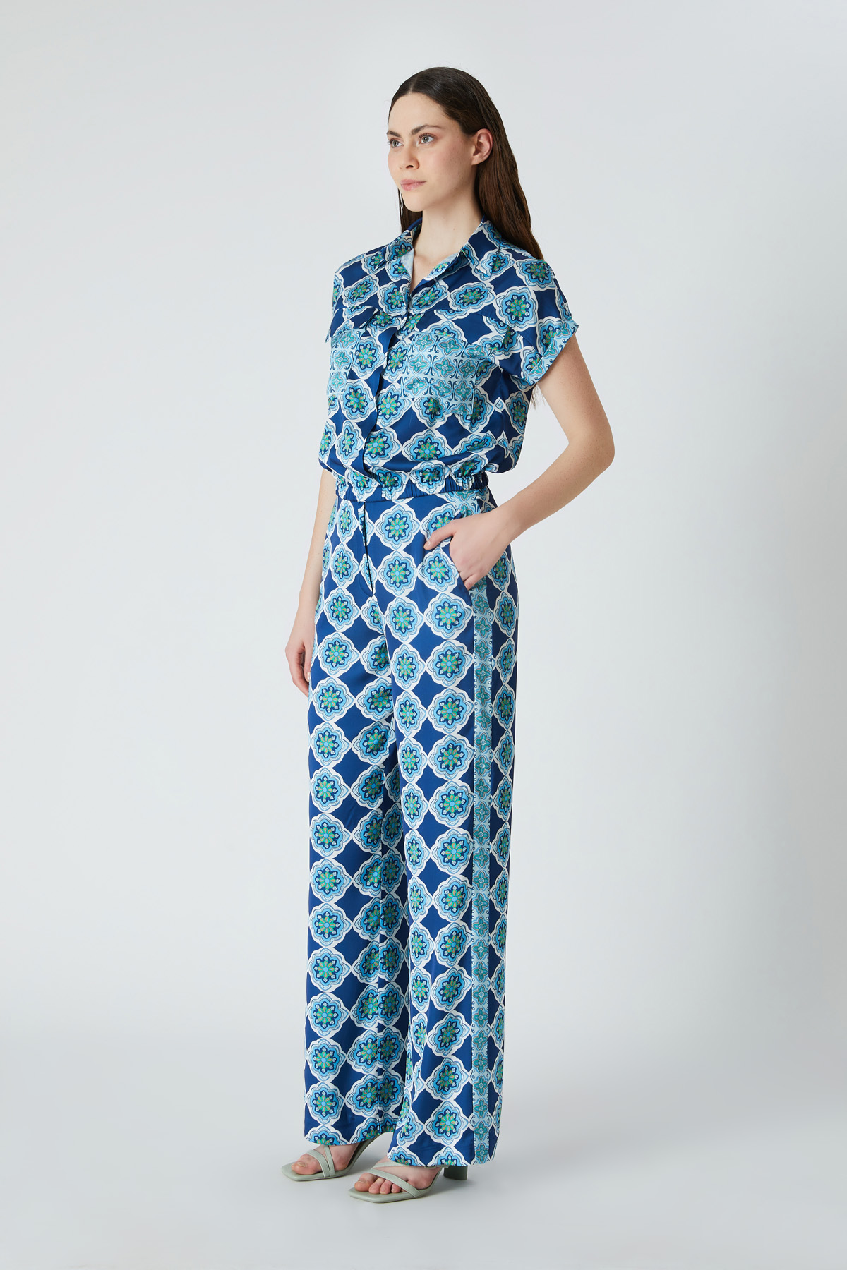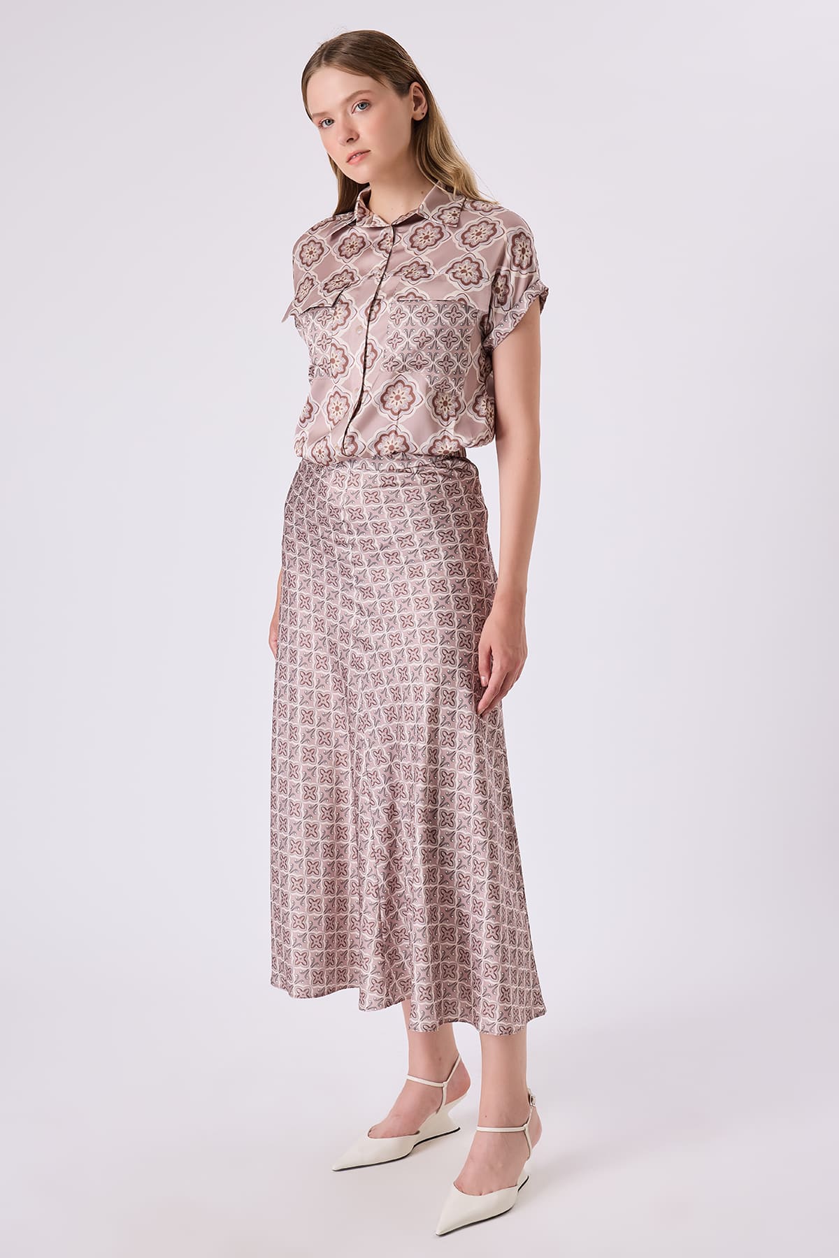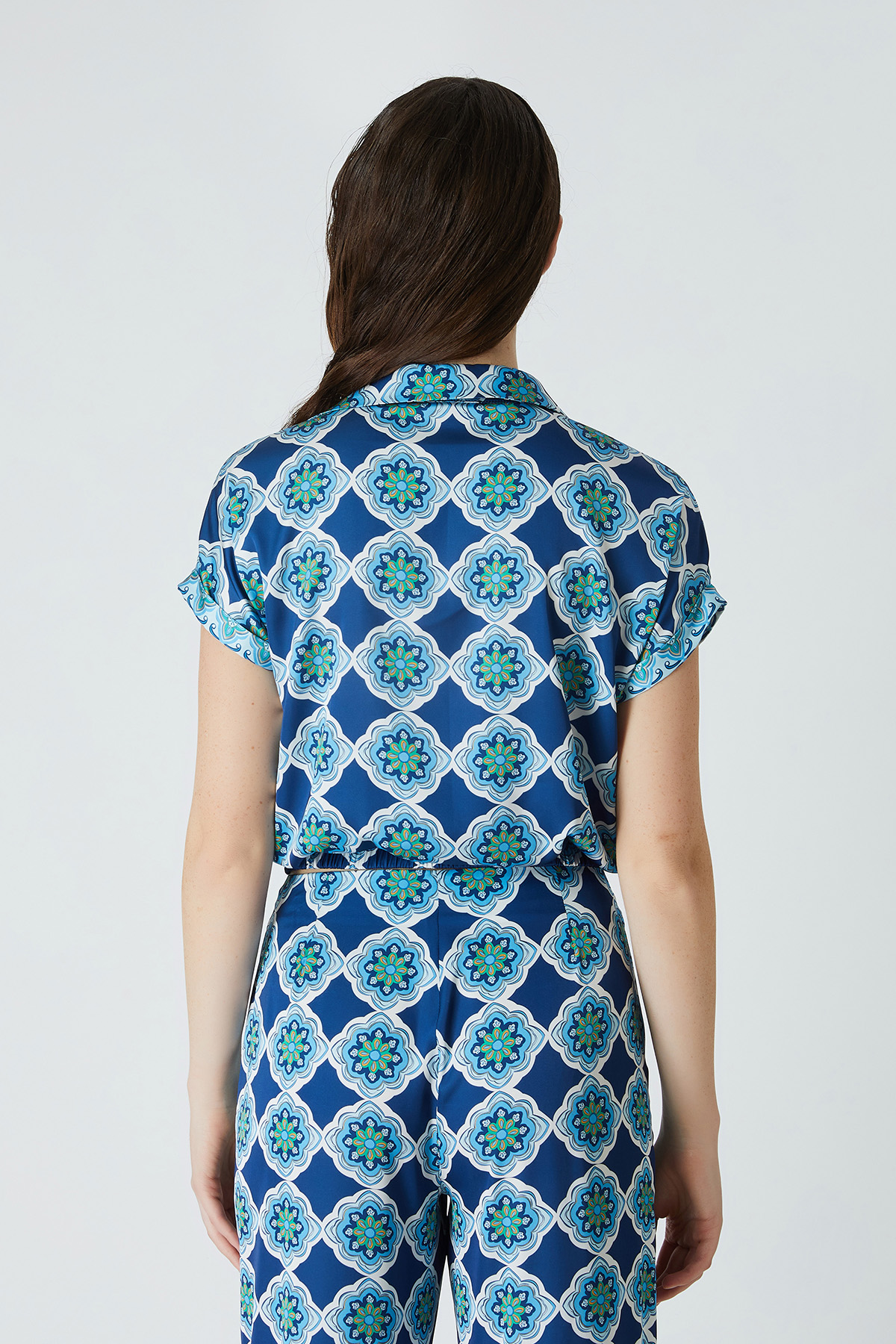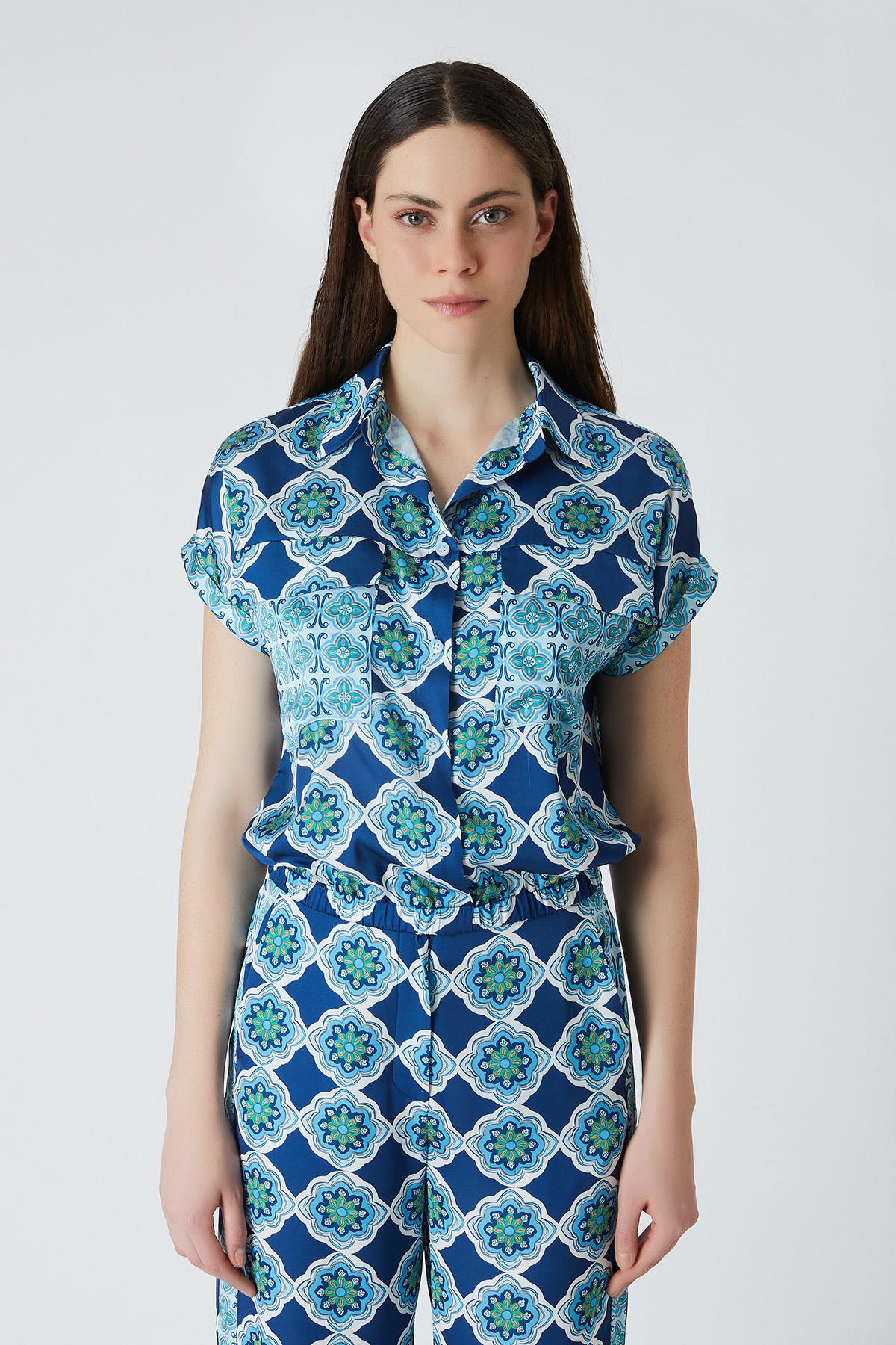 ÜRÜN BİLGİSİ:Floş içerikli desenli kumaş,gömlek yakalı,düşük kollu,düğmeli,etek ucu bant detaylı,rahat form gömlek