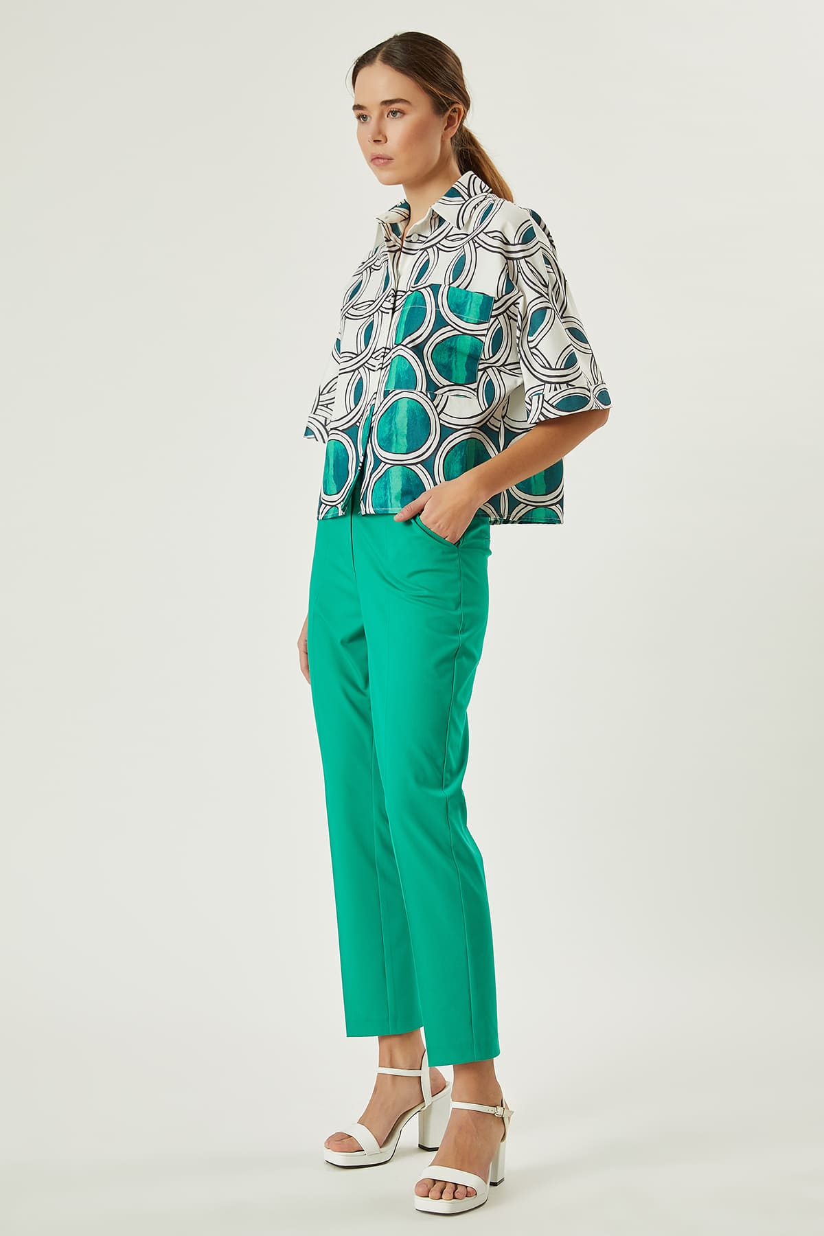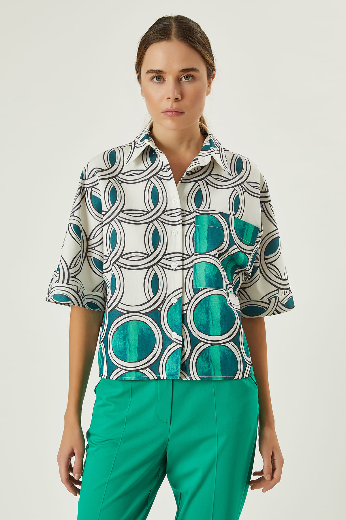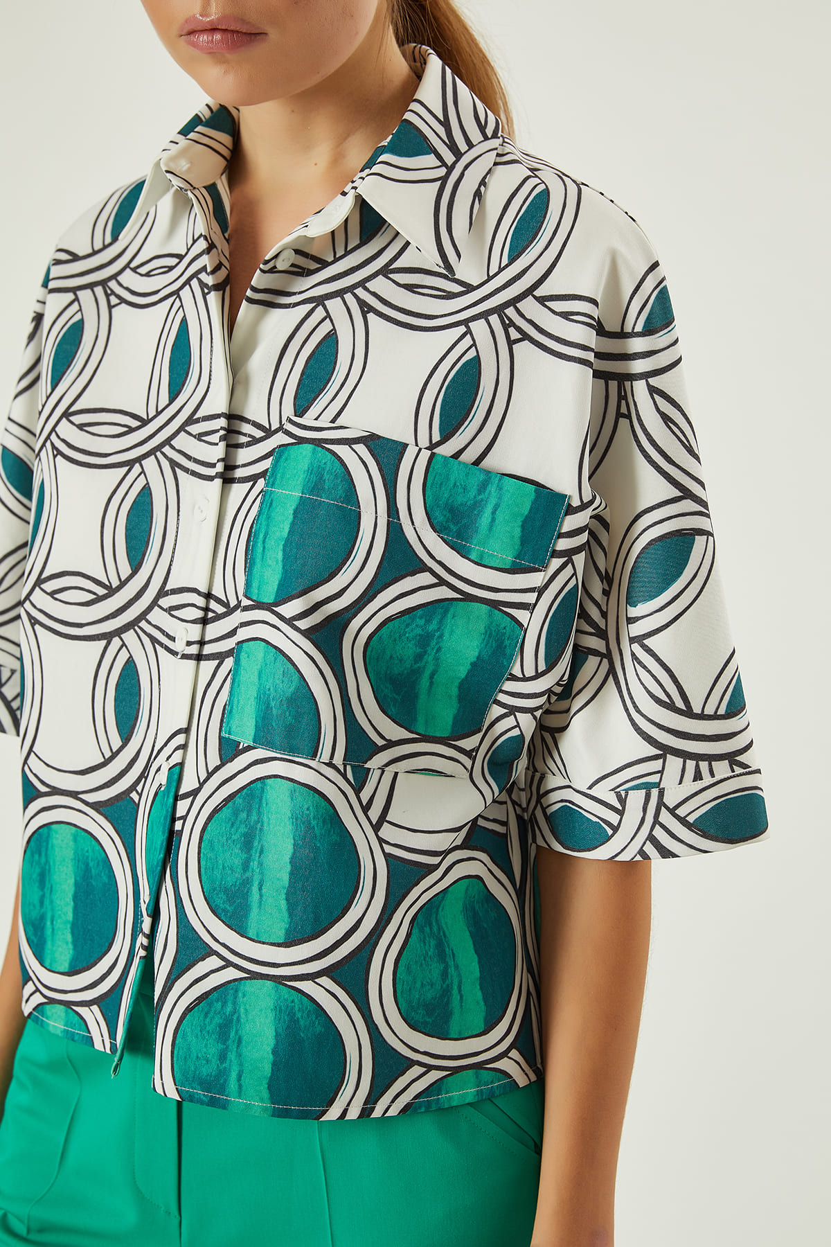 ÜRÜN BİLGİSİ:Pamuk karışımlı kumaş,renkli grafik desenli,yarım kol,tek cepli,düz form ,kısa gömlek