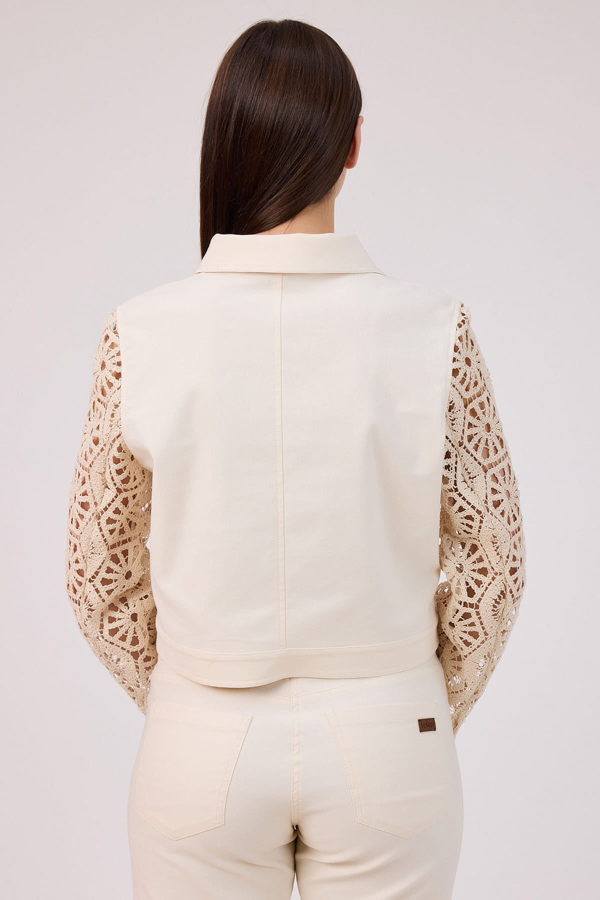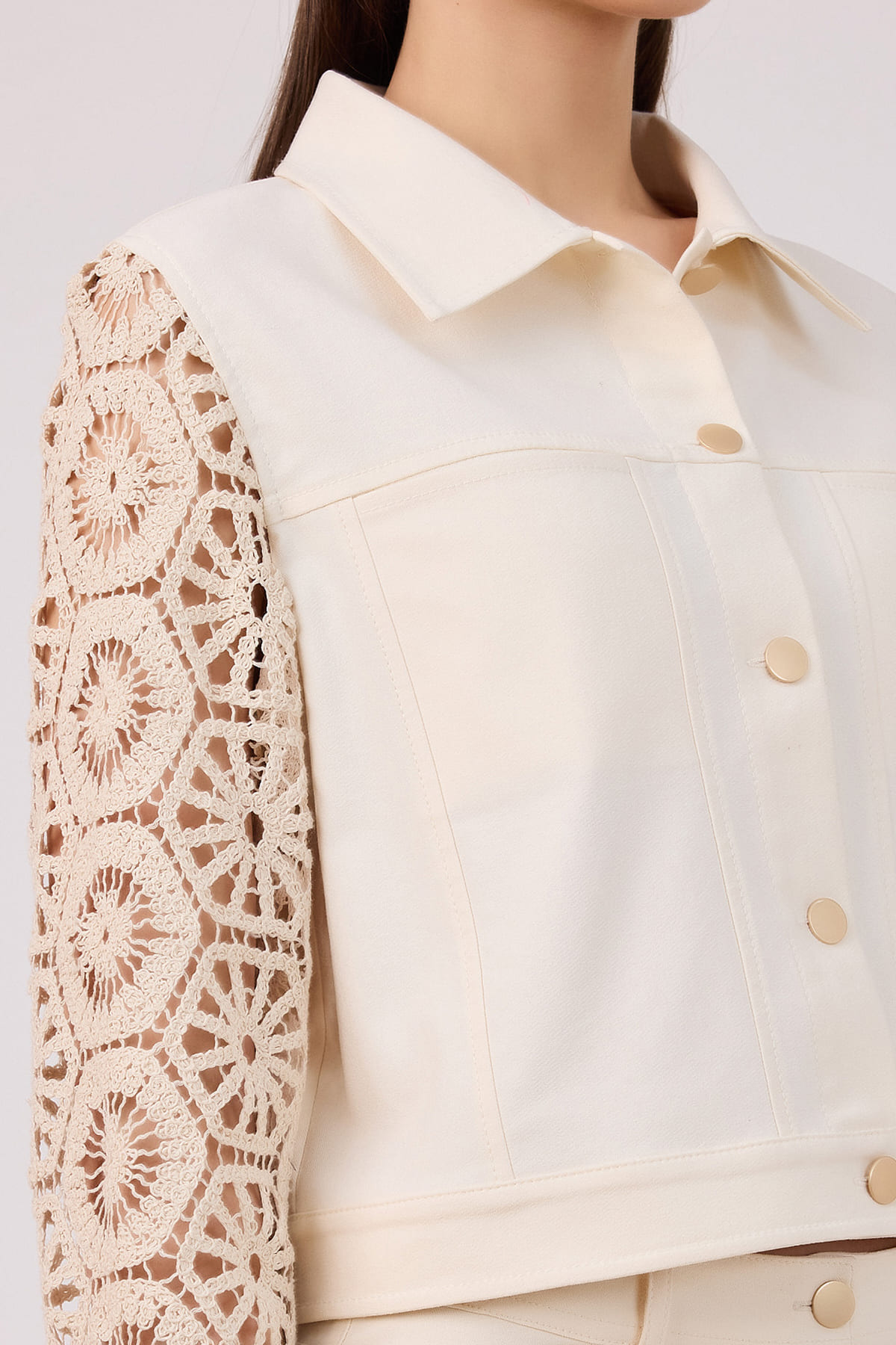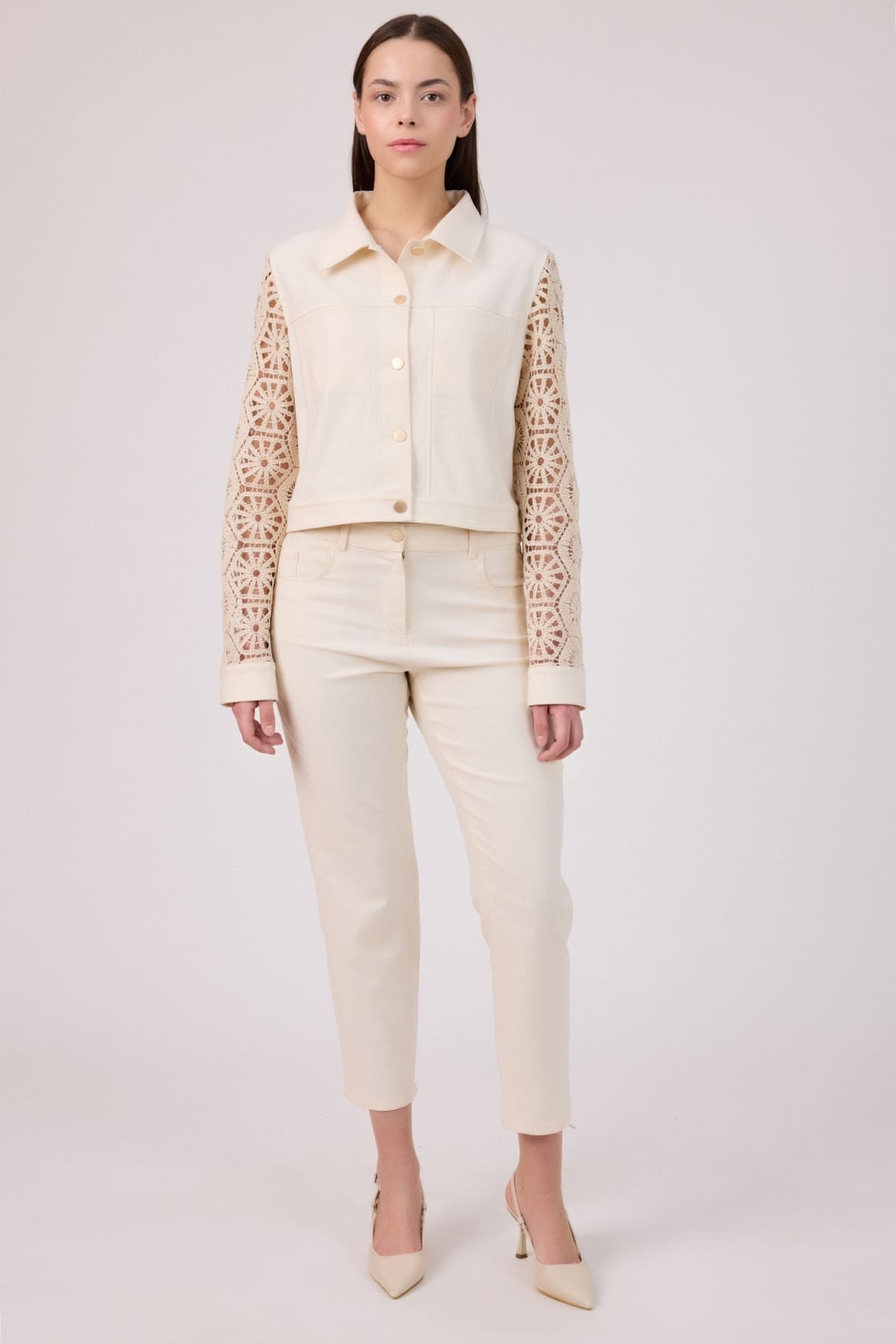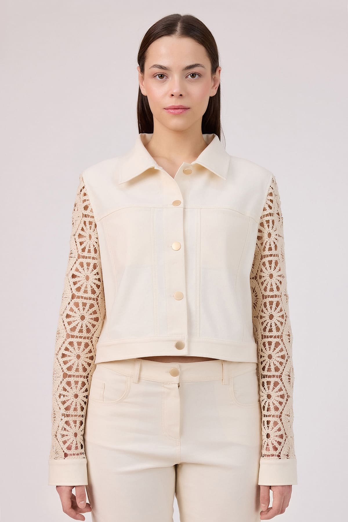 ÜRÜN BİLGİSİ:Naturel denim görünümlü esnek dokulu kumaş,önü düğmeli ve gizli cepli ,kolları uyumlu renkte pamuk güpür geçişli,astarsız kısa ceket