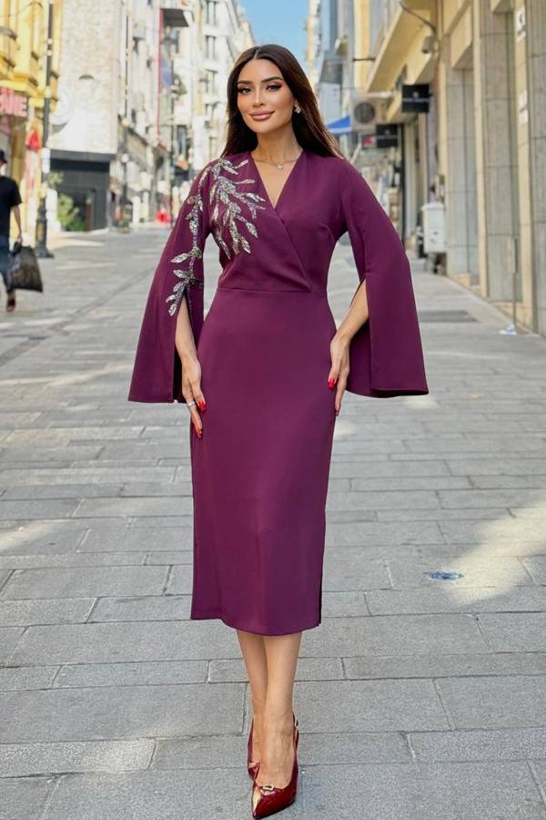 ÜRÜN BİLGİSİ:Dökümlü polyester kumaş,v yakalı,kolları yırtmaçlı,tek tarafı işlemeli,fermuarlı,astarlı şık elbise.