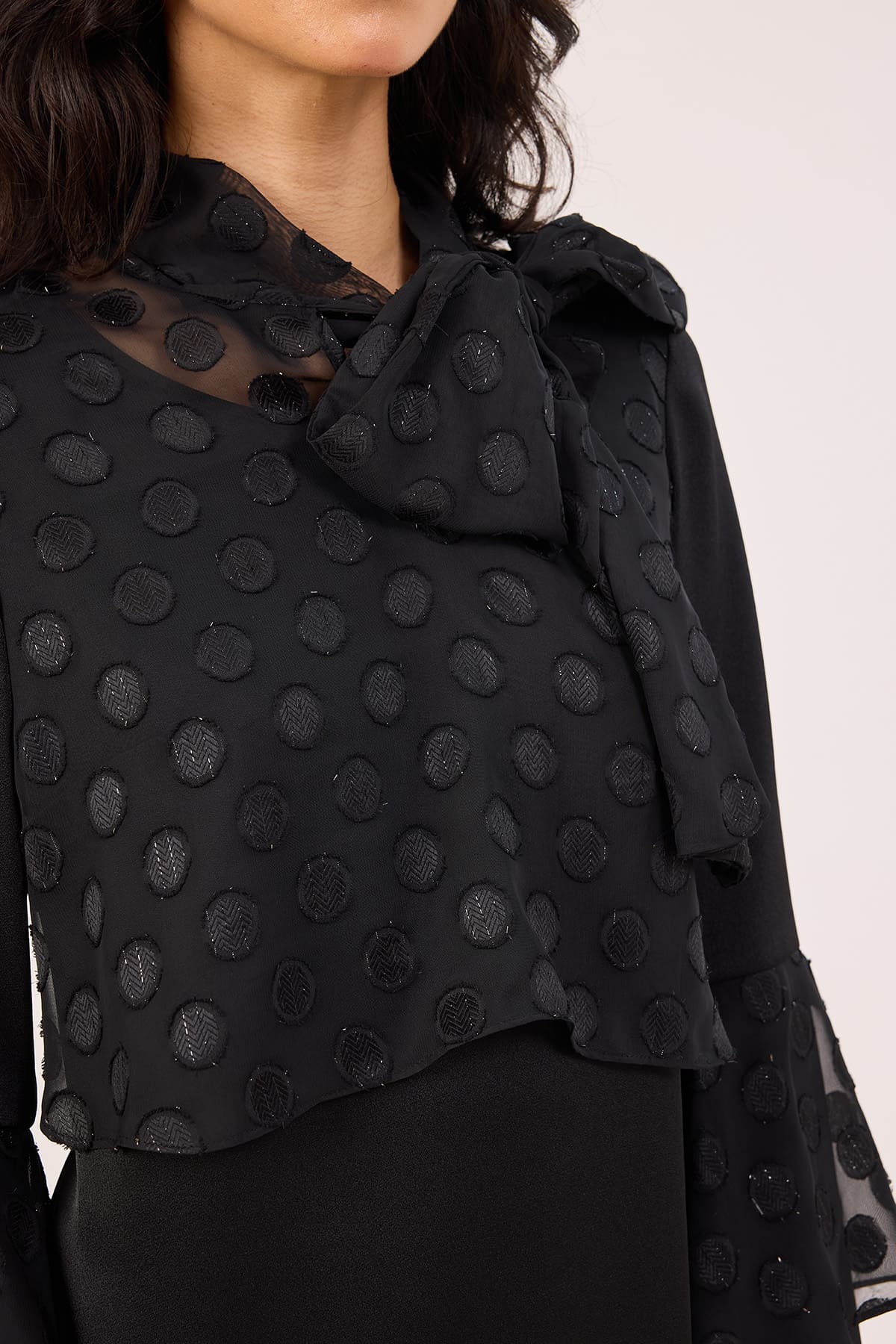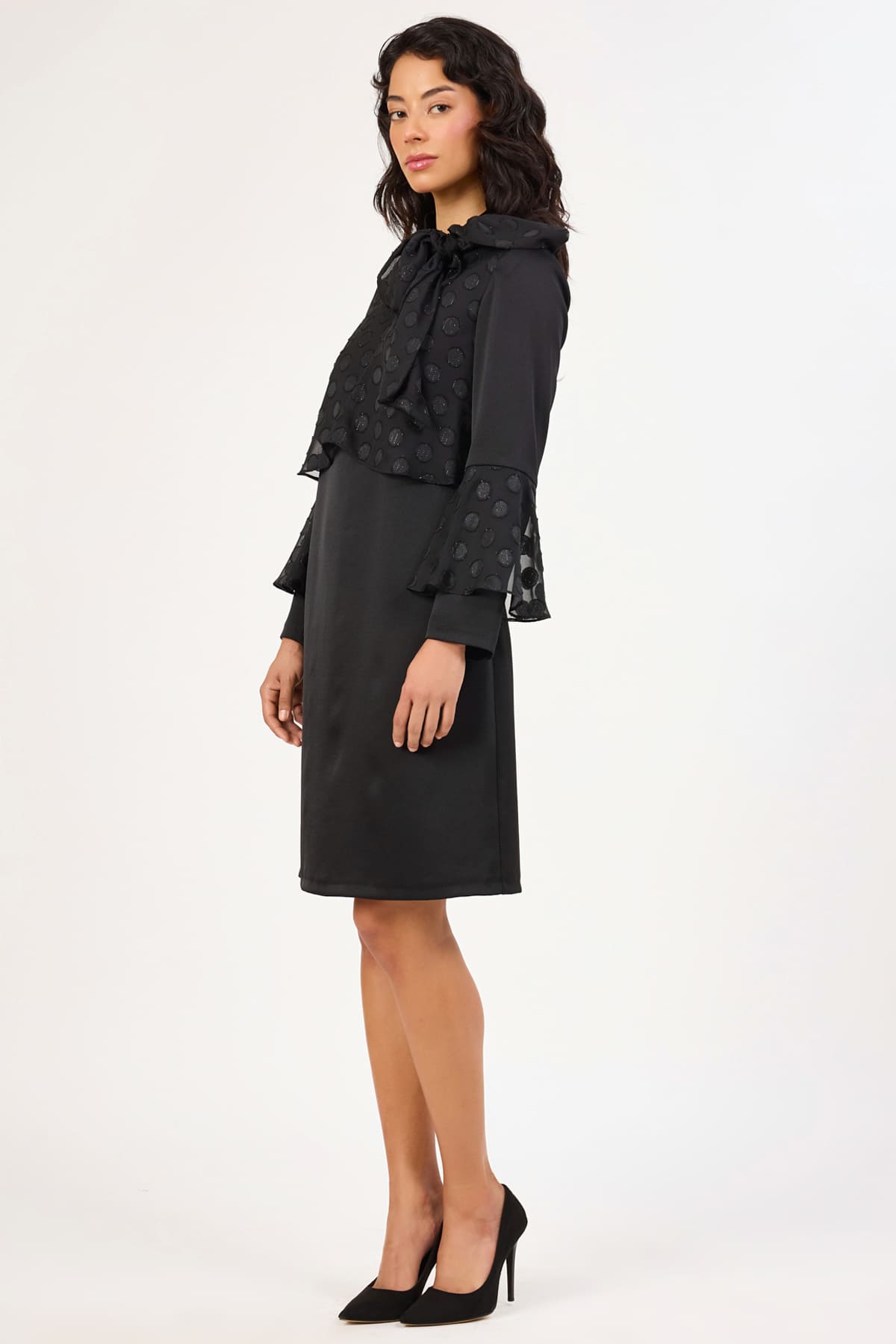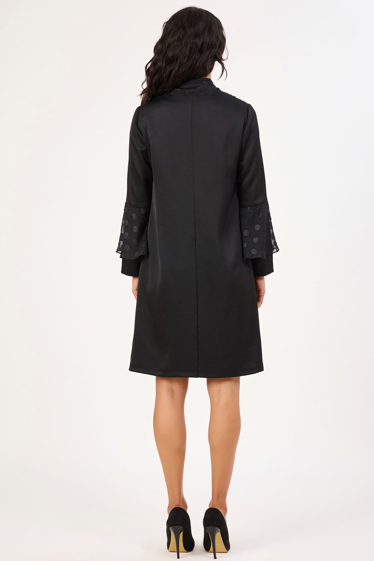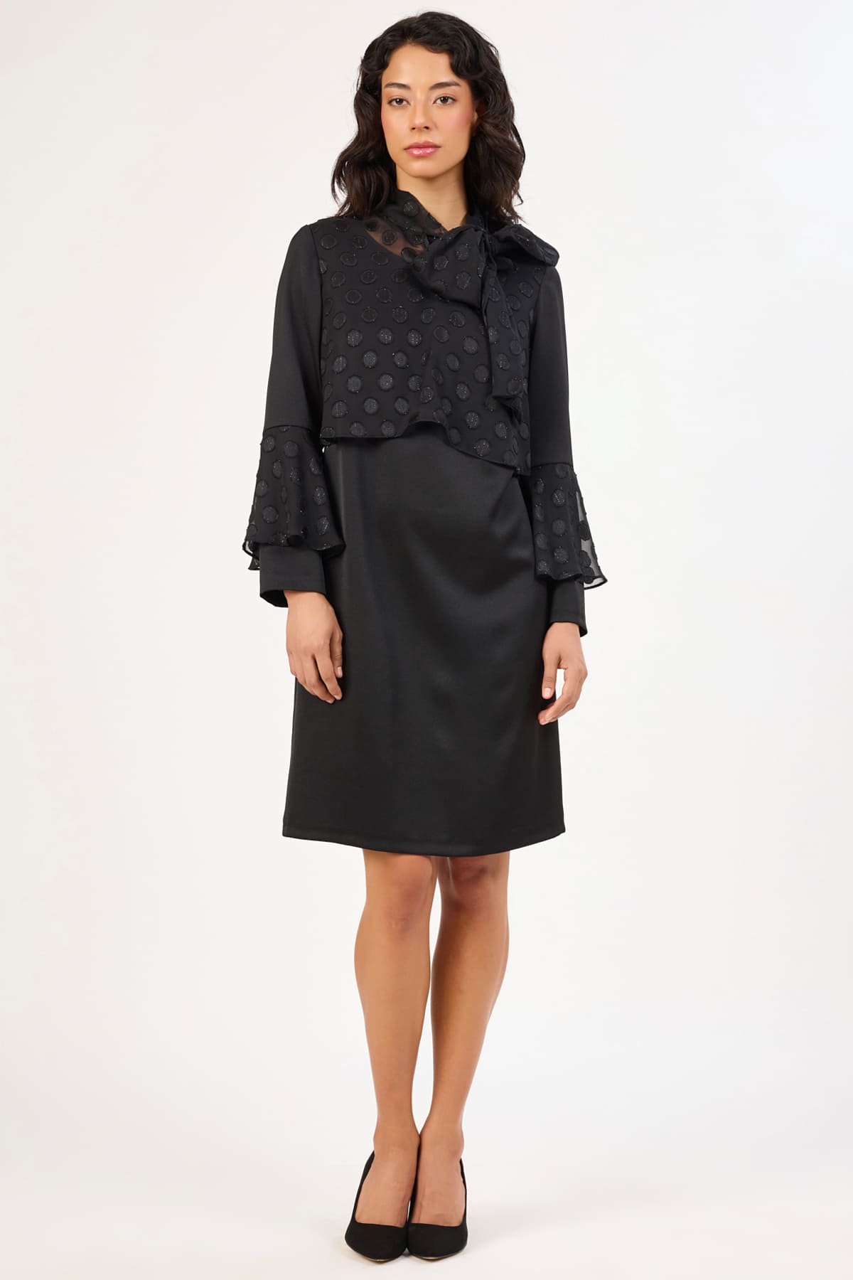 ÜRÜN BİLGİSİ:Mat saten yüzeyli saten kumaş ve sim iplikli jakar puanlı kumaş geçişli,yakası fularlı,kolu volan detaylı,astarlı düz form elbise