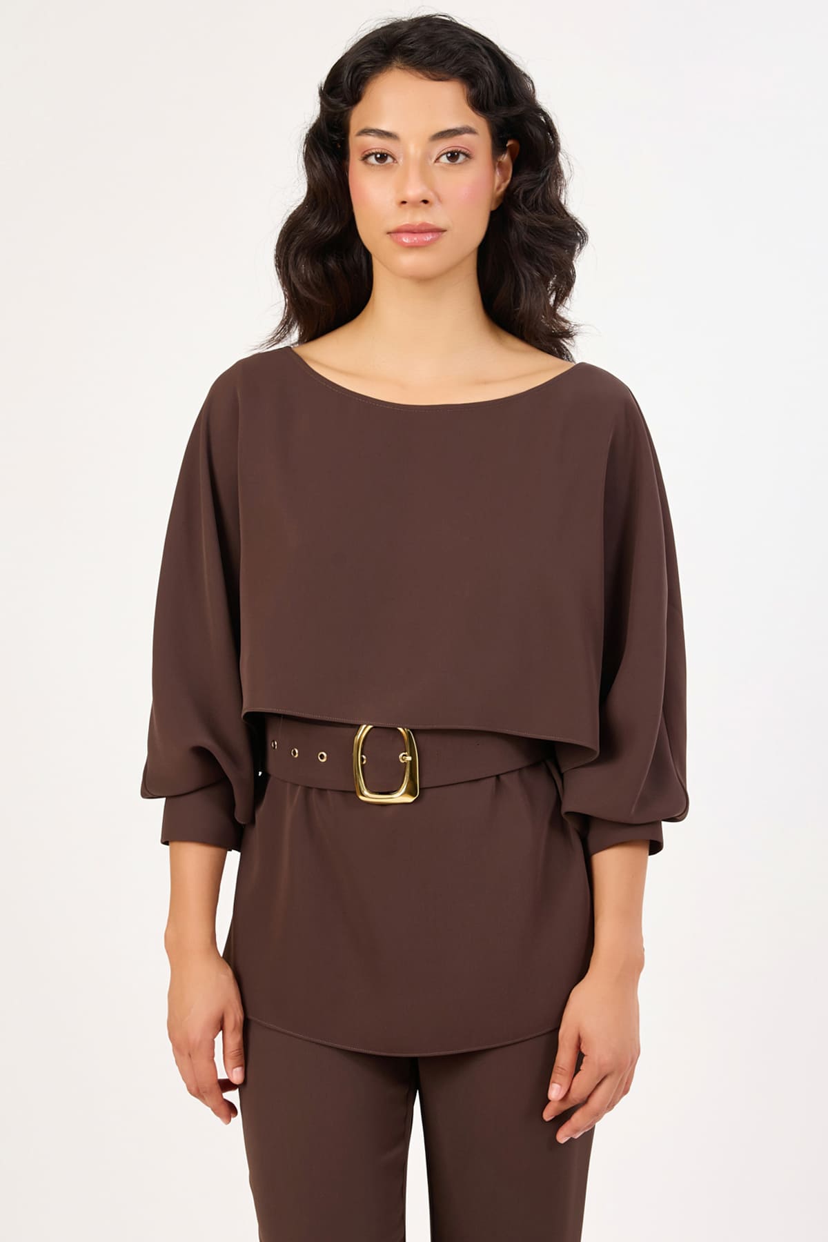 ÜRÜN BİLGİSİ:Dökümlü nefes alabilir kumaş,yuvarlak yakalı,gold düğmeli,kemer aksesuarlı,rahat form şık takımlı bluz.