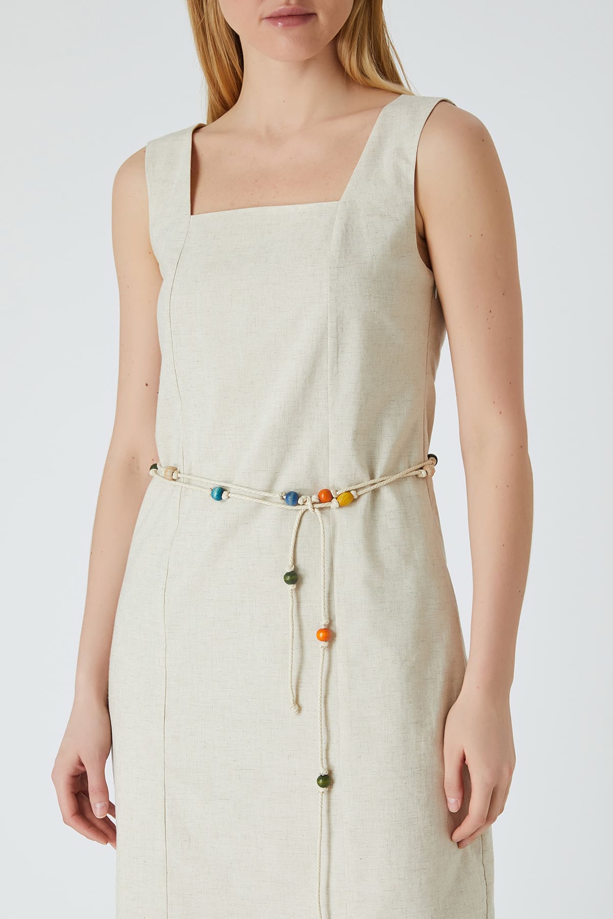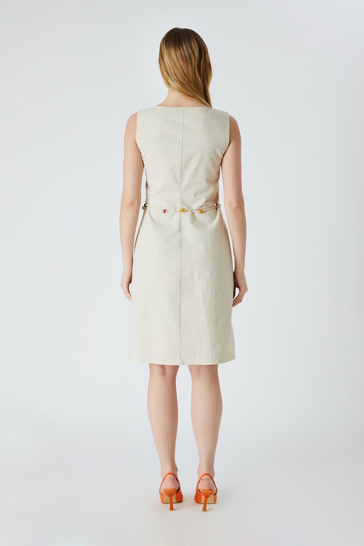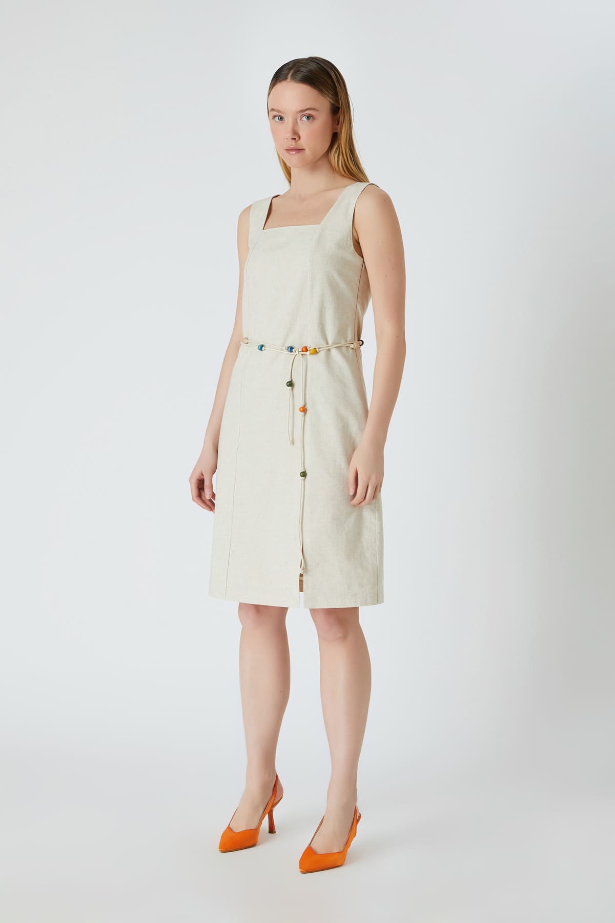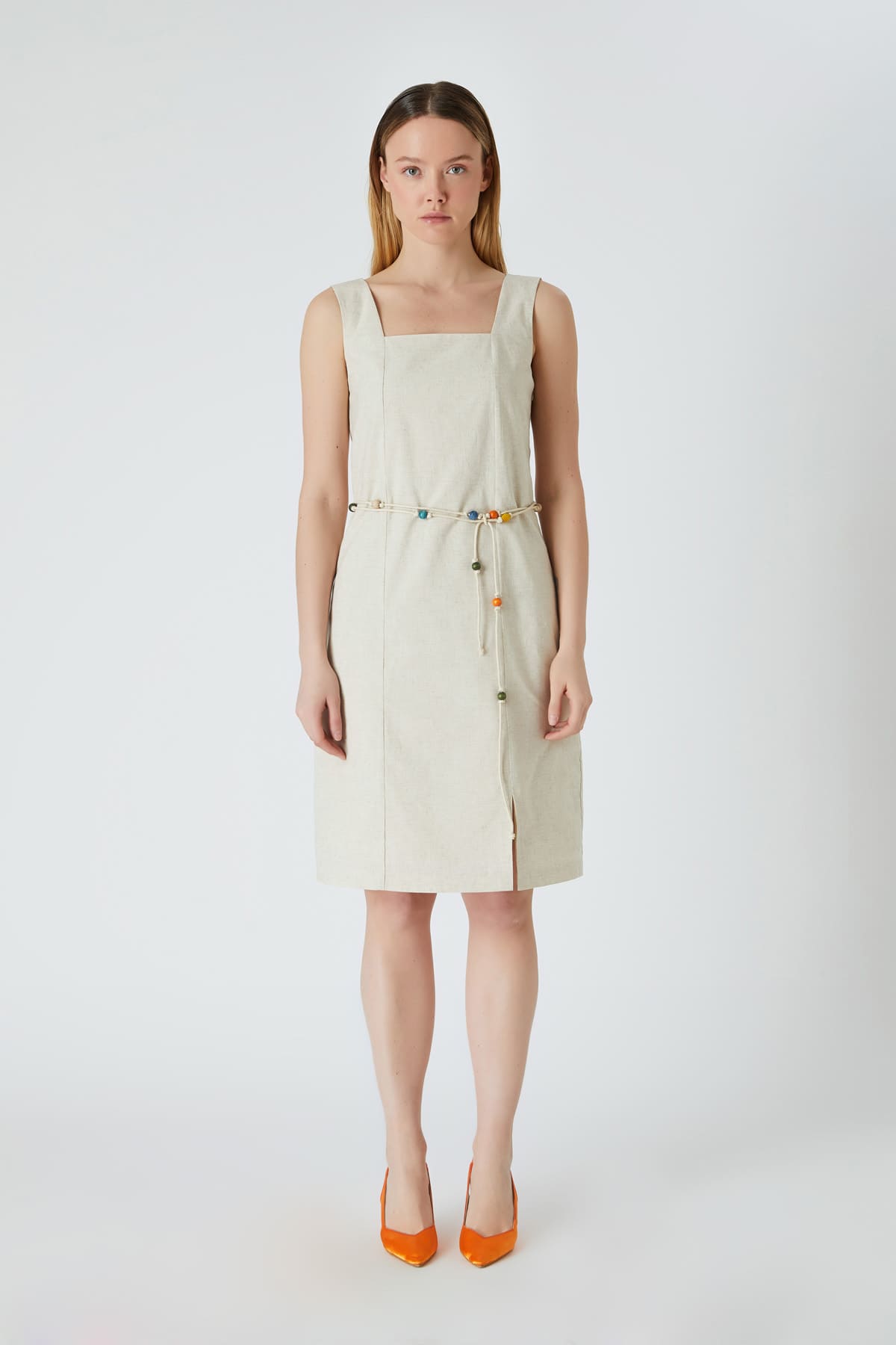 ÜRÜN BİLGİSİ:Pamuk kaışımlı keten kumaş,kare yakalı,kolsuz,kemerli,yırtmaç detaylı,astarsız düz form elbise.